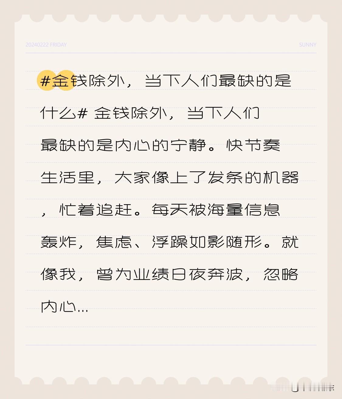 金钱除外,当下人们最缺的是内心的宁静。快节奏生活里,大家像上了发条的机器,忙着追赶。每天被海量信息轰炸,焦虑、浮躁如影随形。就像我,曾为业绩日夜奔波,忽略内心声音。其实,我们该停下脚步,给自己留些时间,去感受生活本真,寻回那份宁静。