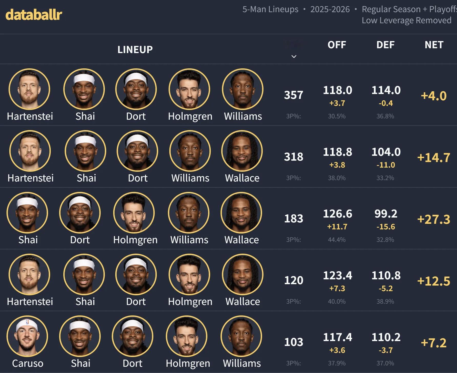 需要变阵?先发五虎合体的阵容拉完了?本赛季雷霆出场时间最多的五人组净效率统计(去除垃圾时间),亚历山大+米切尔+华莱士+切特+哈滕的阵容净效率+38.6攻防俱佳,切特单中锋阵容+24.5排名第二,杰伦复出前的双塔阵容打了最久的111分钟,净效率也有+17.0。雷霆本赛季使用亚历山大/多尔特/杰伦·威廉姆斯/切特/哈滕这套阵容的四场比赛的34分钟内,进攻效率125.7,防守效率120.5,净效率+5.2。如果本赛季数据再加上前一个赛季季后赛的样本,258三人组+双塔净效率也只有+4.0,三分命中率是灾难性的30.5%。跨赛季数据可以粗略总结为:切特单塔》哈滕单塔》亚历山大多尔特华莱士双塔》258三人组+双塔。或许部分原因也是样本,例如雷霆队的常规首发打了三场西部第二的马刺。你认为雷霆需要调整首发吗?编辑by蓝色狂潮OKC76人vs雷霆雷霆