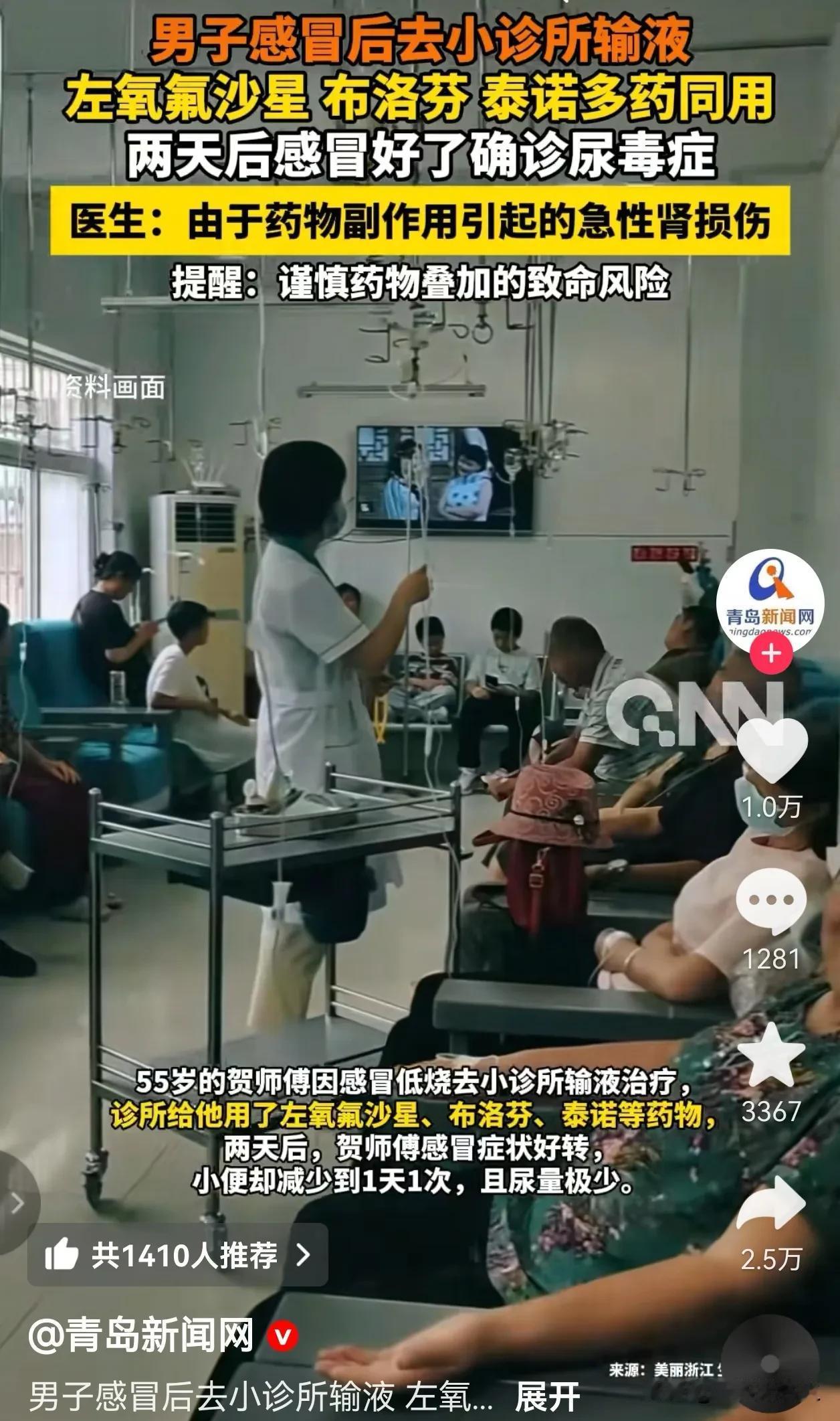 “真是大炮轰蚊子”,怪不得小诊所输液好得快,原来是这样! 浙江,一位55岁的贺师傅,就因为一场普通感冒,差点把自己的命搭进去了! 事情是这样的:起初贺师傅只是有点低烧,他觉得去医院又麻烦又浪费钱,所以去了家附近的小诊所。 没想到医生直接下猛药,哐哐给他用了好几种药:左氧氟沙星(消炎的)、布洛芬(退烧止疼的),还有泰诺等药物(也是退烧的)。 两天后,贺师傅的感冒是好了,可身体好像出问题了。贺师傅称:1天小便只有1次,而且尿量少得可怜! 去医院一检查,血肌酐高达1455umol/L,超出了正常上限14倍!被诊断为是肾衰竭已发展至尿毒症…… 医生直叹气:这是典型的“药物叠加副作用”,直接把肾都给“烧”坏了! “布洛芬”和“泰诺”两者功效作用高度重叠,相当于超N倍剂量给药,如若同时服用,很容易肝肾衰竭。因为肾就好比过滤网,一下子太多毒性物质涌过来,这怎么扛得住啊? 药不是吃得越多好得越快,弄不好小命都没了,用药需谨慎啊!