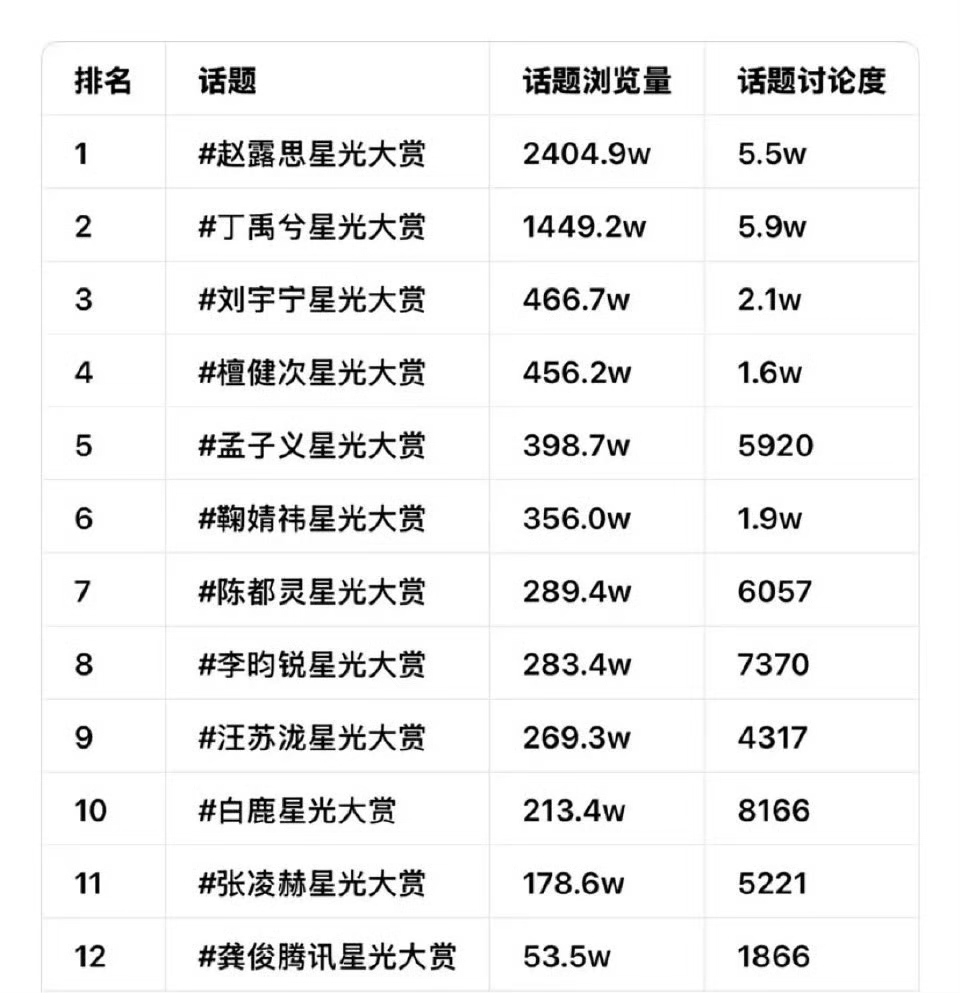 星光大赏话题在社交平台的浏览量排名:赵露思、丁禹兮、刘宇宁、檀健次、孟子义,这可以代表他们的国民度吗?
