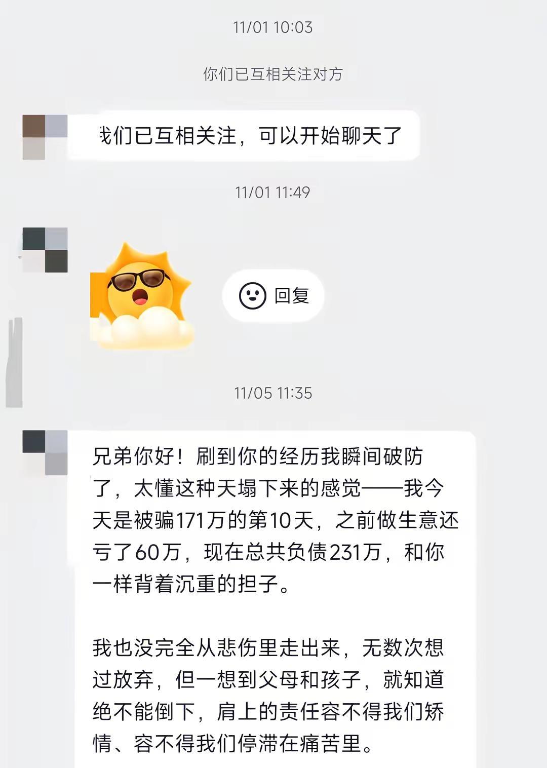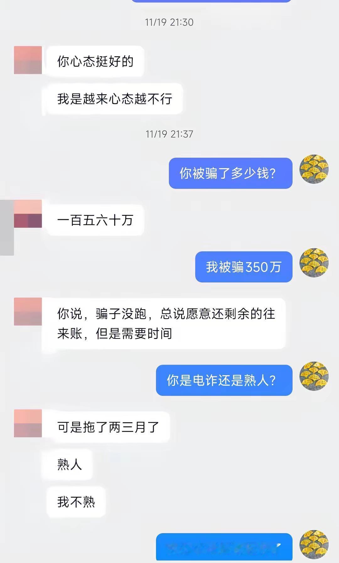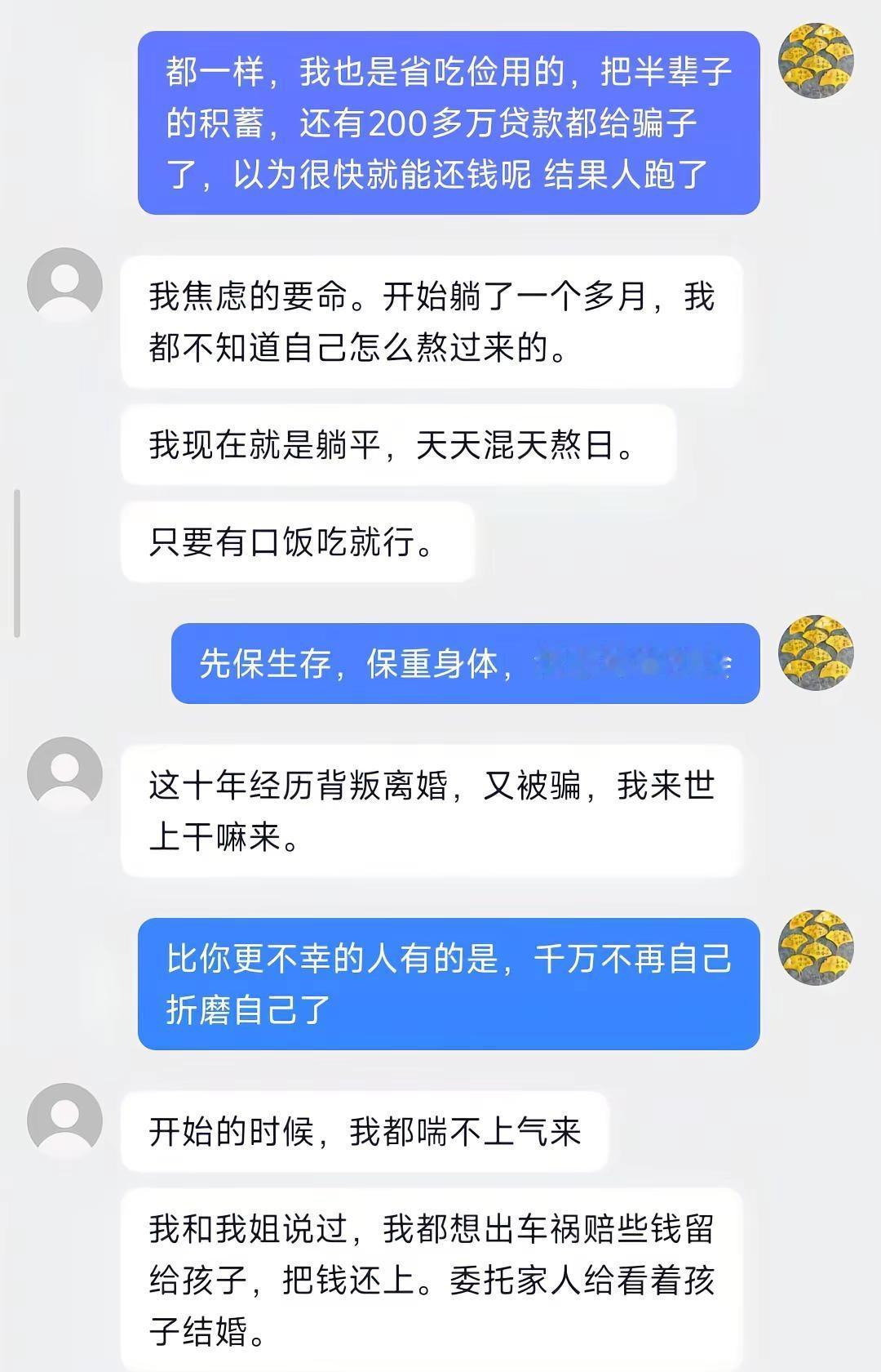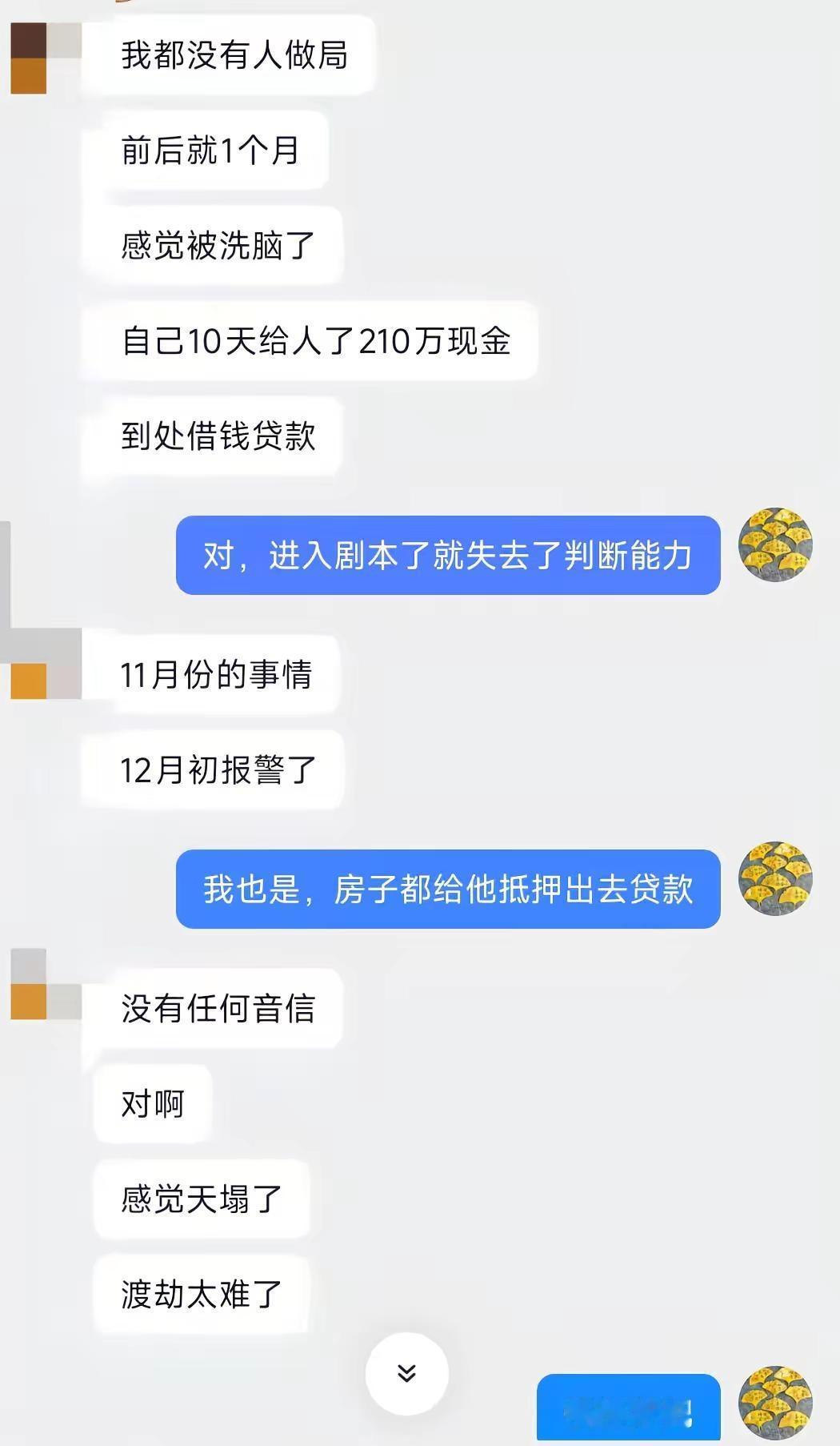 被骗后才知道还有这么多被骗巨款,负债累累,生不如死的受害者,很多人被骗后都郁郁寡欢,悔恨不已,心如死灰。我在劝别人想开的同时,自己也是一边崩溃,一边缝合。再次提醒各位,凡是借钱的,让你投资的,下载东西的,千万要慎之又慎,不然人生一旦走错路,可能会毁了一生,连累家人。愿大家都心如明镜,让骗子无法生存。