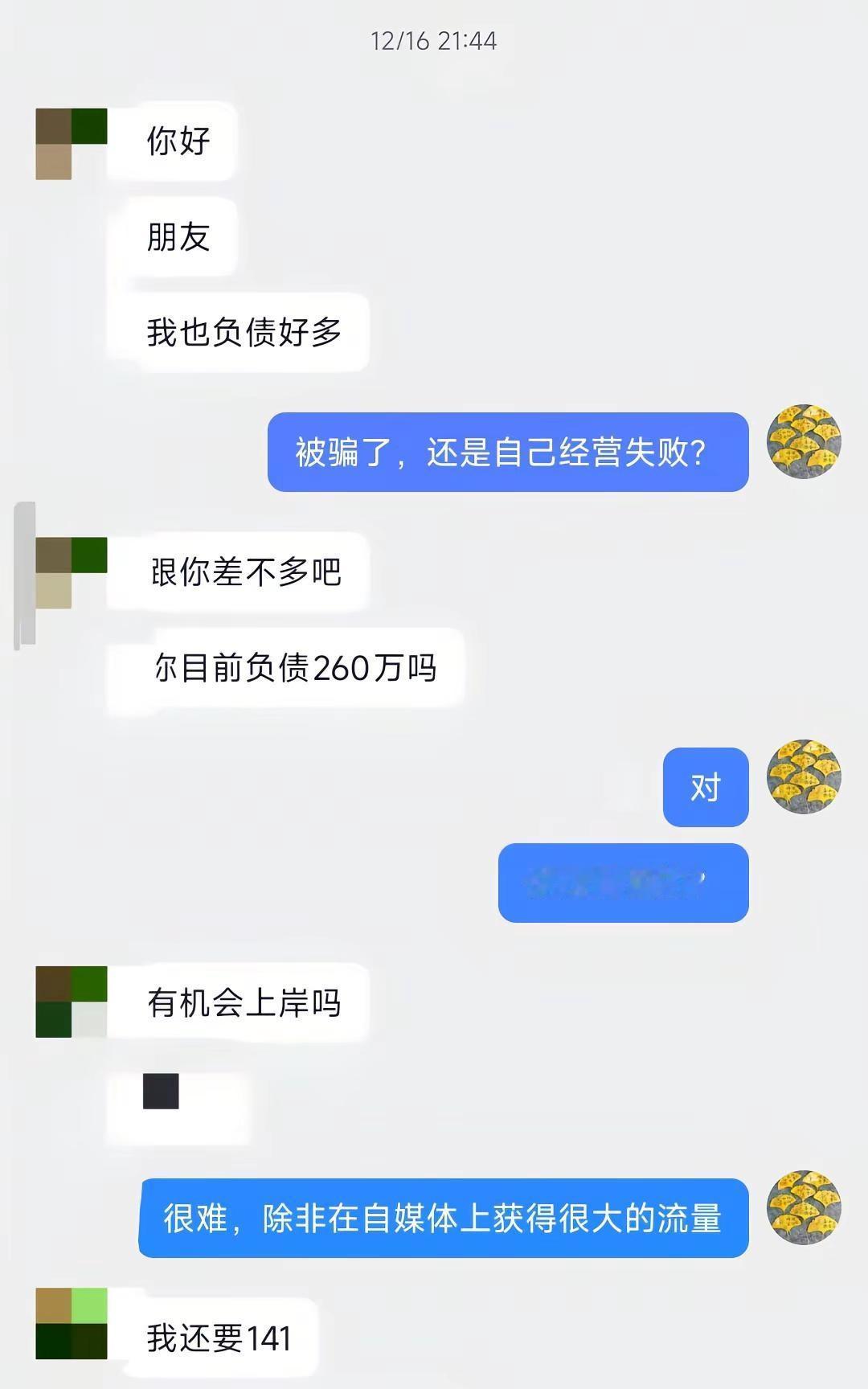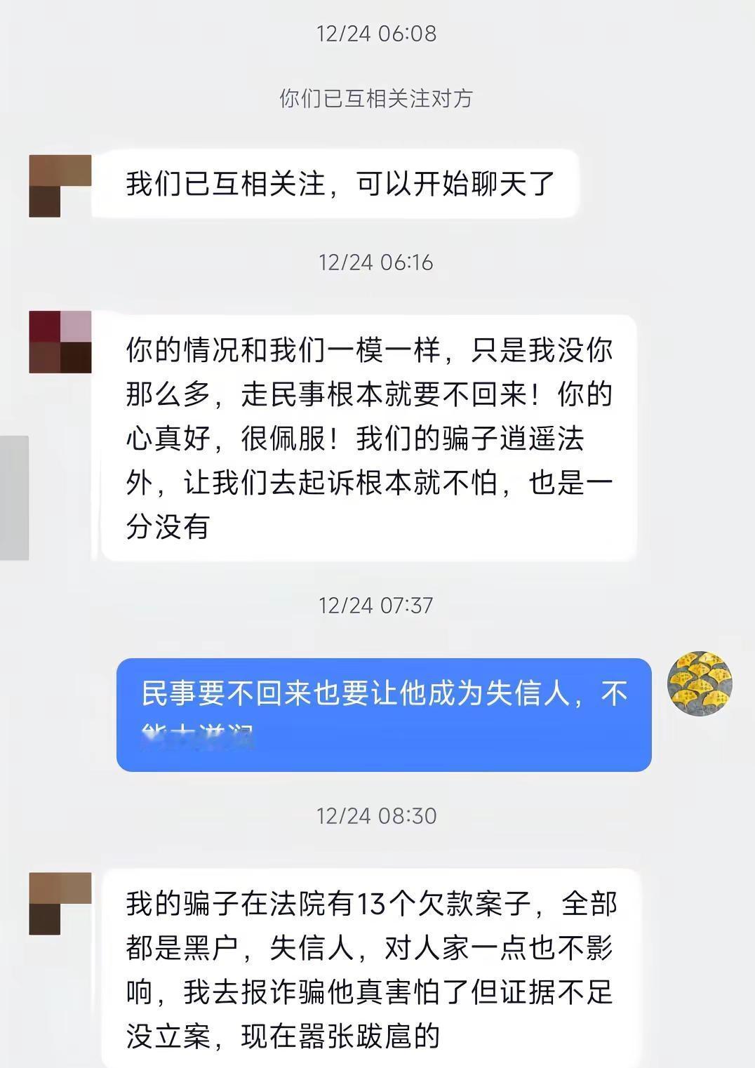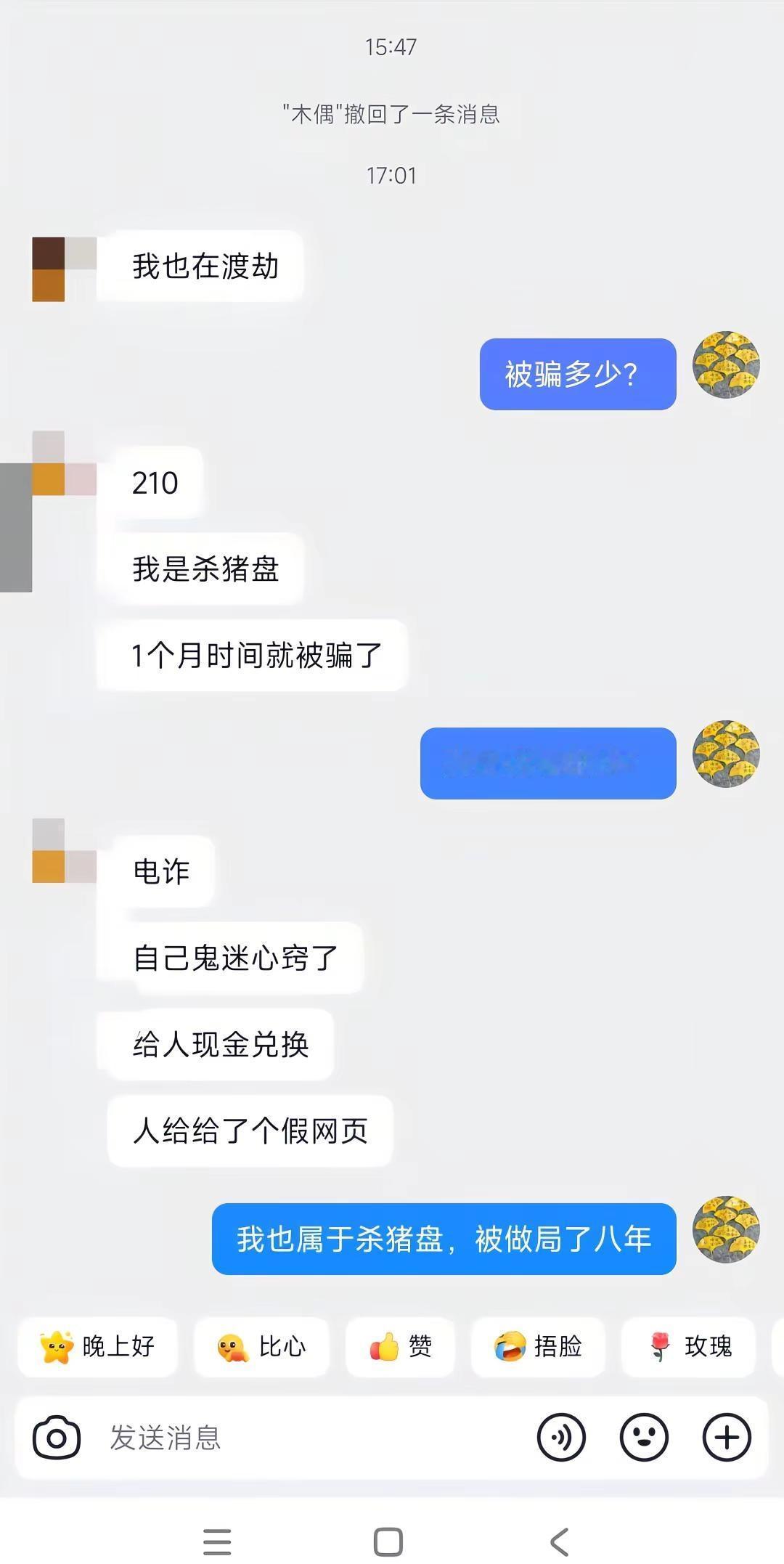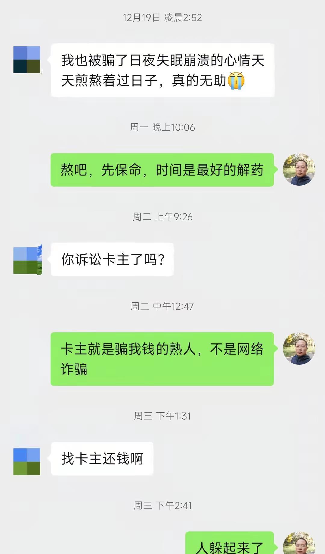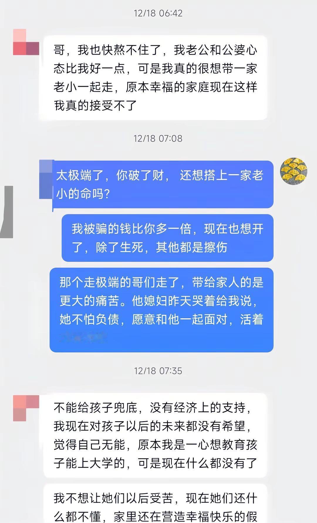 被骗后才知道还有这么多被骗巨款,负债累累,生不如死的受害者,很多人被骗后都郁郁寡欢,悔恨不已,心如死灰。我在劝别人想开的同时,自己也是一边崩溃,一边缝合。再次提醒各位,凡是借钱的,让你投资的,下载东西的,千万要慎之又慎,不然人生一旦走错路,可能会毁了一生,连累家人。愿大家都心如明镜,让骗子无法生存。