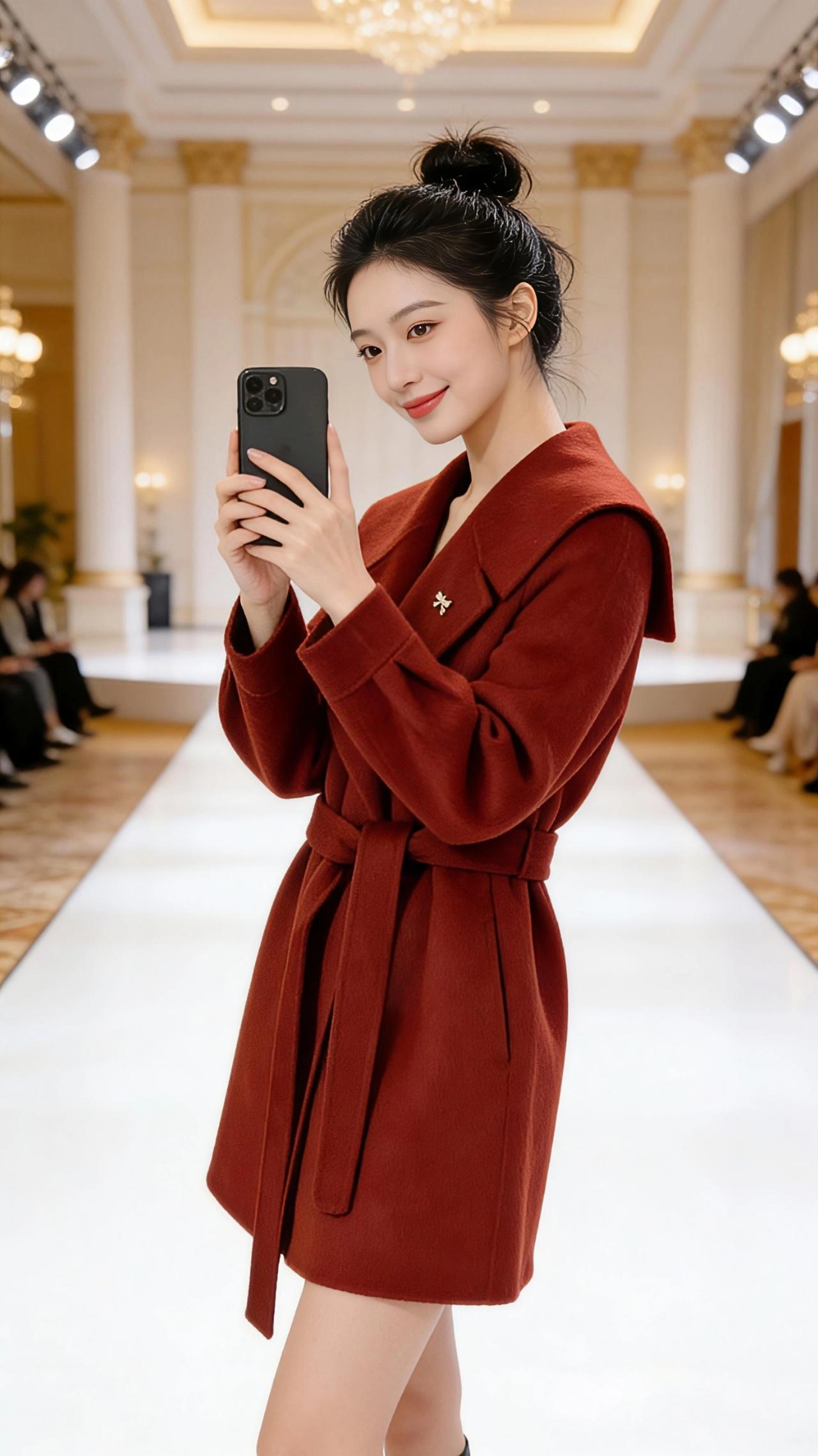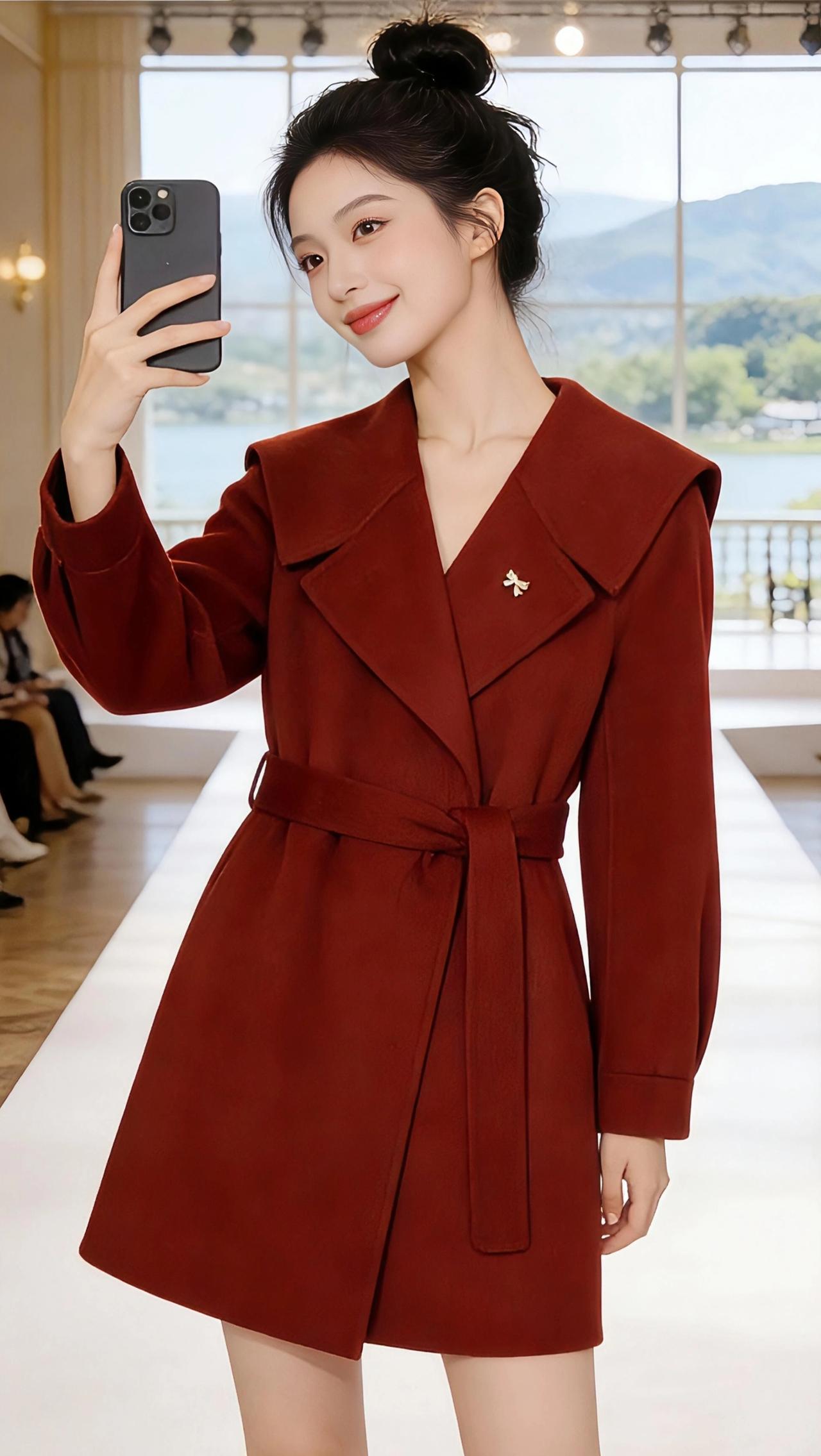红呢与镜影 酒红呢料的大衣裹着肩头,像揉碎了深秋的枫红,又蘸了点焦糖的暖。腰带收出腰线,把廊厅里的鎏金光影都束进这抹浓郁的红里。 她举着手机,指尖轻扣着冷硬的机身,与柔软的呢料撞出温柔的反差。发髻高高挽起,碎发贴着鬓角,添了几分娇憨。镜头对着自己,也对着身后的窗景——远山衔着淡云,湖水漾着微光,廊柱的白与金在光影里漫开,像一场不真切的梦境。 脚步踩在光洁的秀场地面,红呢扫过,带起细碎的风。她抬眸时,眼里盛着笑意,似是与镜中的自己问好,又似是与窗外的山湖致意。这一刻,秀场的华丽成了背景,手机镜头里的方寸天地,装下了她眉眼间的明媚,也装下了红呢大衣裹着的,独属于她的温柔与鲜活