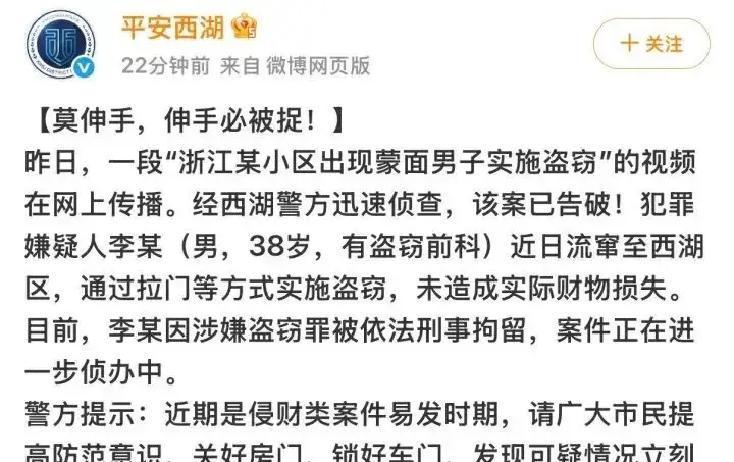 杭州西湖区最近闹出这么一事儿!12月25日凌晨两点多,一个38岁的家伙李某,戴着黑帽子黑口罩,全副武装跑到小区里,先在车库试着拽一辆黑轿车的门,没得手,又拿着卡片工具从上到下挨家挨户撬居民门锁,好几户都被他尝试过,甚至有一户门被撬开了。 幸好居民们东西放得小心,加上监控拍得清清楚楚,他啥值钱玩意儿都没捞着,就这么空手而归。视频一传开,大家都捏把汗,西湖警方动作超快,第二天就把他抓获归案,现在已经因为涉嫌盗窃罪给刑事拘留了,案子还在查。 这家伙还有盗窃前科,专挑小区流窜作案。年底了,这种小偷小摸的事儿确实多起来,根据最高检数据,2024年全国侵犯财产犯罪审查起诉的人数涨了不少,盗窃就是大头,大家出门上班或过节聚会时,家里容易空着,正是他们下手的好时候。 说真的,警方破案这么迅速,说明监控和快速反应真管用,但咱们自己也得长点心:出门锁好门窗,车别落东西在明处,小区里看到鬼鬼祟祟的陌生人,立马打110。防患于未然,总比事后追悔强多了,别给这些有前科的惯犯可乘之机!