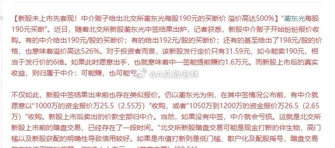 太疯狂了!新股未上市先套现!中介贩子给出北交所蘅东光每股190元的买断价, 溢价高达500%。这是要在股票上市,进入二级市场,散户能接触之前,把其未来十年,甚至一辈子的涨幅,一天吃干抹净,不留给散户,二级市场一点成长空间,只留给散户一地鸡毛?新股越是爆炒,首日暴涨,几倍的涨幅,直接透支十年,甚至一辈子,出道即巅峰。一边是鼓励耐心资本,长期持股,一边是新股彩票式爆炒,击鼓传花。新股爆炒抽血老股,新股一辈子去还债一天的辉煌,牢股越来越多,僵尸化,结构化越来越极端,4000点下跌的个股比比皆是。新股超贵,老股量化平铺,市场对普通散户来说,赚钱是越来越难了。