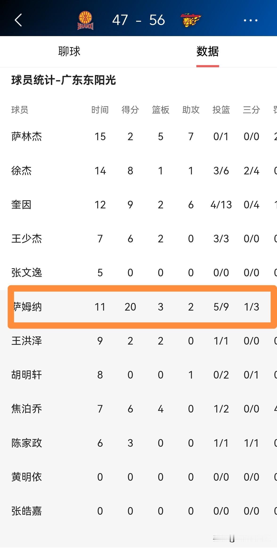 广东东阳光大外援萨姆纳真是大杀四方!在今天广东东阳光客场挑战山西汾酒的上半场比赛中,萨姆纳替补出战11分钟,投篮9中5,其中三分球3中1、罚球9中9爆砍20分3篮板2助攻,没有出现任何的失误,他的场上正负值为+6,带领球队以56:47领先对手结束了前两节的比赛。 毫不夸张的说,如果没有萨姆纳在前两节比赛中的精彩表现,广东东阳光在上半场比赛结束时很有可能会落后于对手。