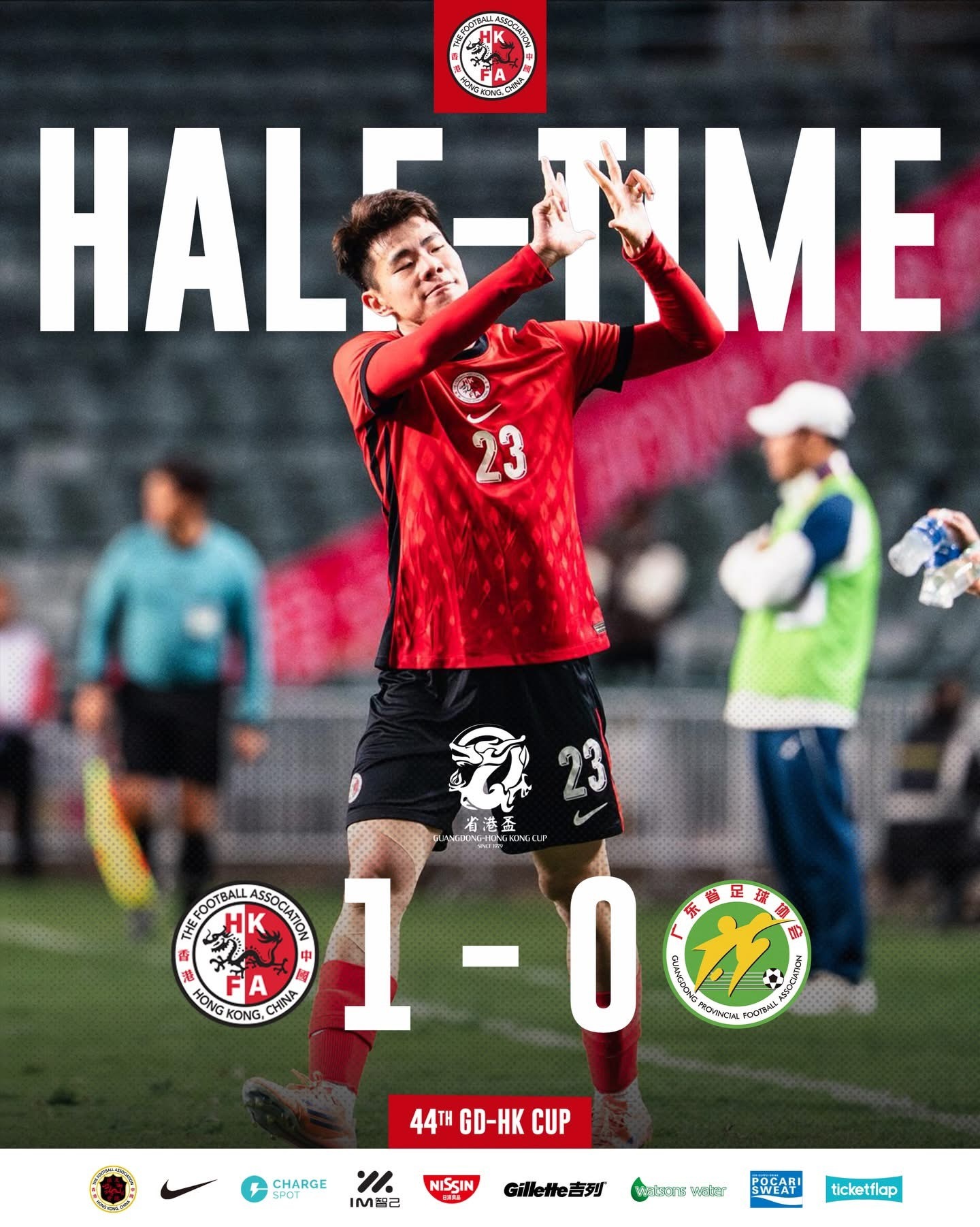 半場結束前有孫銘謙遠射得手領先1-0返更衣室,不過啱啱廣東有陳偉扳平,雙方又返到同一起跑線…