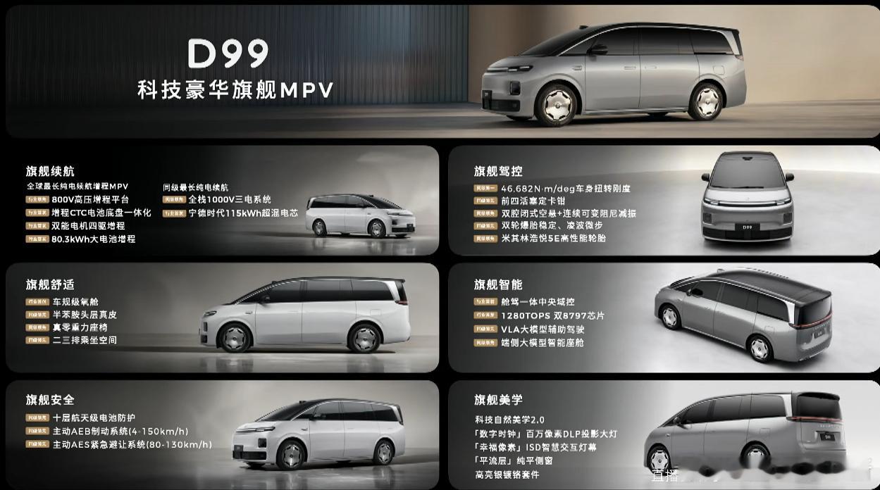 零跑 D 平台的第二款产品、首款 MPV,零跑 D99 来了!这款车拥有超过 5.2 米的车长,近 2 米的车宽,超过 3.1 米的轴距。提供五款外观色,前脸依旧是熟悉的家族式设计,搭载 AGS 的主动进气格栅,还有黑色的撞顶设计;和 D19 一样,车内配备了零重力座椅,车规级森野氧舱;D99 的增程版同样搭载 80.3kW 的电池,还有 800V高压增程平台,纯电版全栈1000V 三电系统,115 度的宁德时代的超混电芯。零跑D99 零跑10周年发布会 零跑9系豪华双旗舰同台首秀