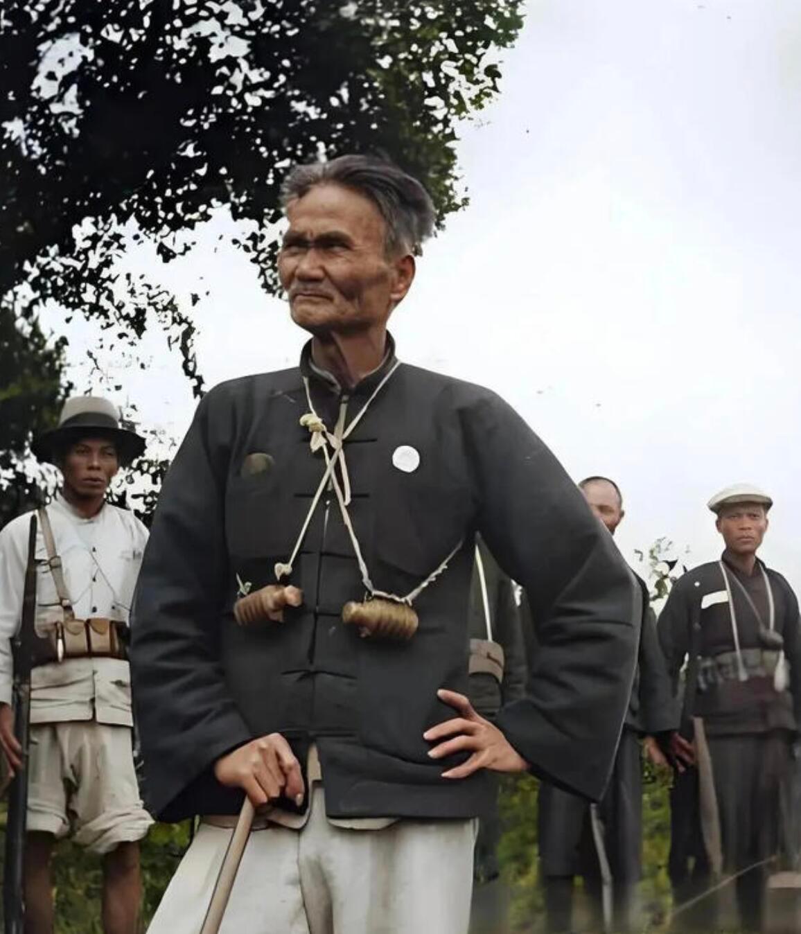 70岁老者胸前挂两枚手榴弹,带80村民抗日!这张珍贵老照片拍摄于1938年,画面中身穿黑衣白裤、手拄拐杖的长者,正是广东中山县70岁的胡祝南。面对日军入侵,他毅然带领八十余名弟子组成民众抗日自卫团。你看他胸前两枚手榴弹格外醒目,虽已白发苍苍,却目光如炬、腰板挺直,身后乡亲们虽衣衫破旧、武器简陋,但人人神情肃穆,誓与侵略者战斗到底!胡祝南本是一名普通商人,国难当头却挺身而出。1940年秋,已年过七旬的他仍亲自上阵杀敌,曾手刃多名日军,最终不幸中弹牺牲。他让我们看到:英雄不分年龄,抗日不分老少。这种舍身报国的精神,正是中华民族刻在骨子里的血性!