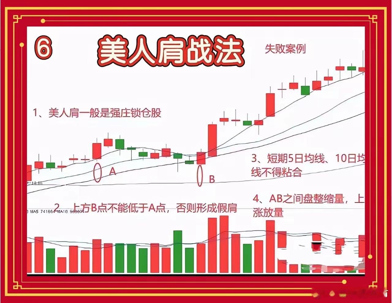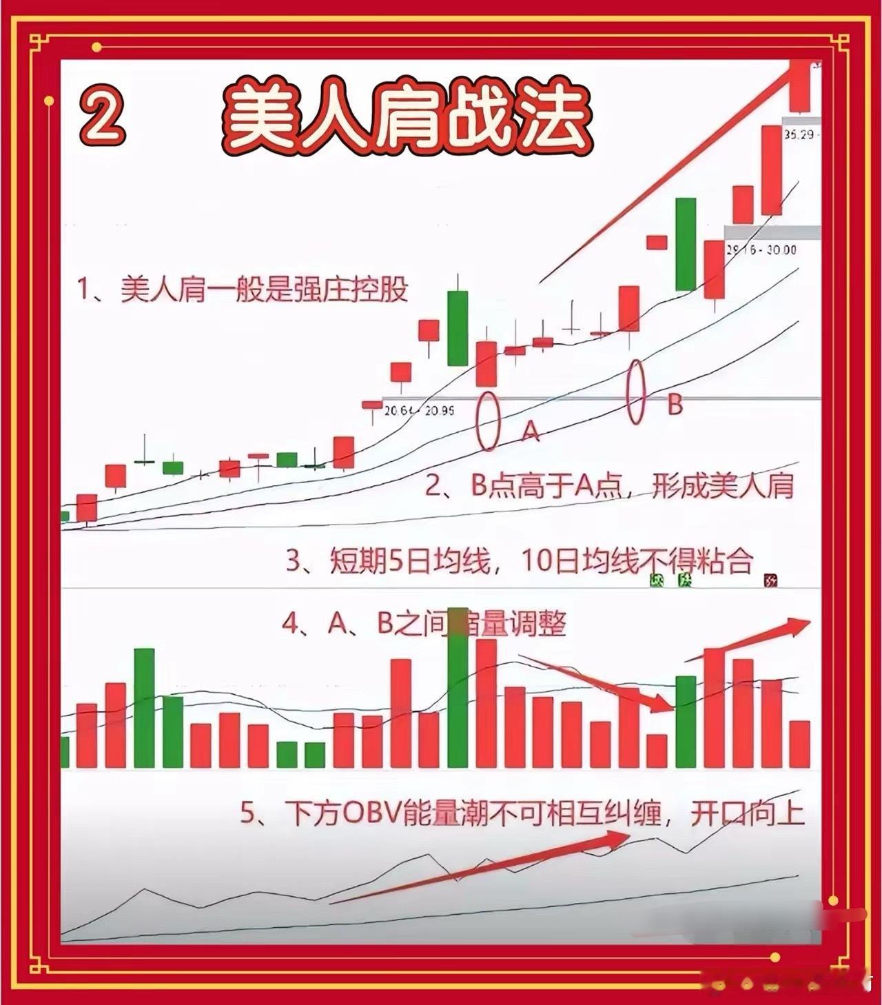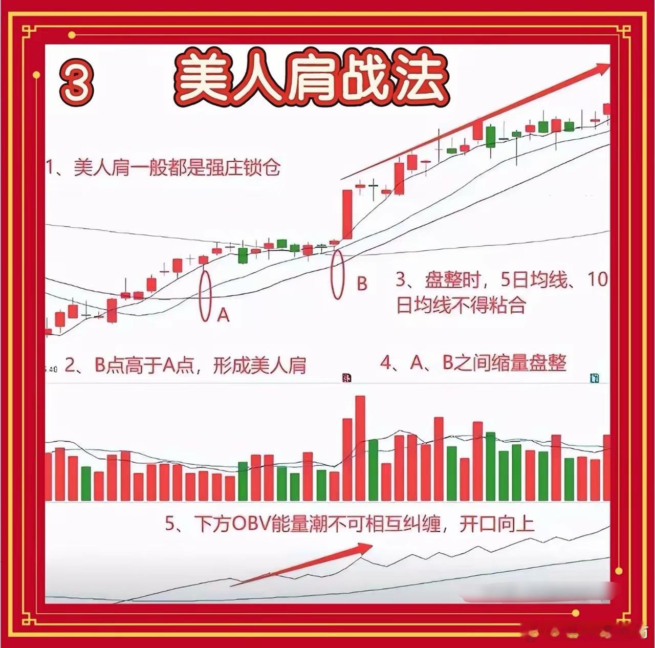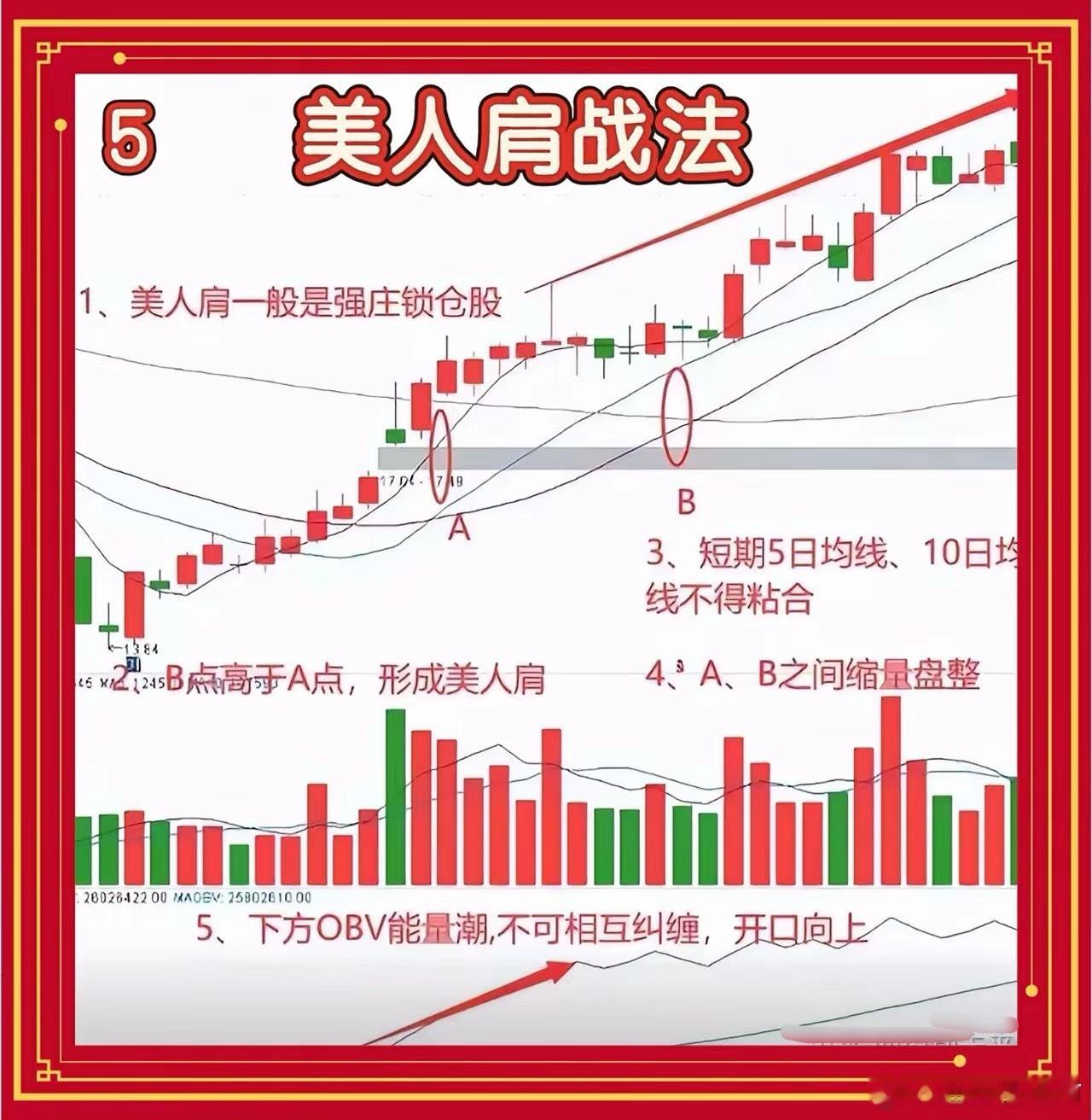 美人肩战法锁定强庄,坐稳主升其一,美人肩形态必然是强庄锁仓所致,盘面表现为阳阴交替,但股价拒绝大幅下跌,这是主力强势运作、高举高打的显著标志。其二,肩形需清晰明确:B点必须高于A点,一旦B点低于A点,便是假肩形态,后市大概率由多转空,此时必须果断放弃。其三,盘整区间内,5日与10日均线仅可靠近,不可粘合,两线始终保持通畅,以此确保筹码未被普通散户摊平。其四,A至B段成交量持续缩减,表明洗盘较为充分;突破B点时必须放量,量能缺口正是主升浪启动的信号。其五,OBV能量潮开口向上,白线与黄线互不纠缠,只要二者趋势同步向上,就说明主力仍在加仓。其六,失败案例往往败在“粘线与假肩”。一旦出现均线粘合或B点低于A点的情况,次日若放量阴跌,即可确认形态瓦解,应立即止损。其七,再完美的美人肩形态,也需结合大盘与板块热度。逆势而为的孤庄难以成功,顺应周期操作才能搭乘主力的“顺风车”。读懂以上七条,通过缩量和肩高量化主力锁仓动作,再利用OBV与量能确认拉升节点,就能在启动前夕提前布局,坐等股价上涨。若本文对你有所帮助,欢迎点赞、关注、评论、收藏并转发给有需要的朋友。本文仅供技术思路交流,不构成任何投资建议,股市有风险,入市需谨慎。
