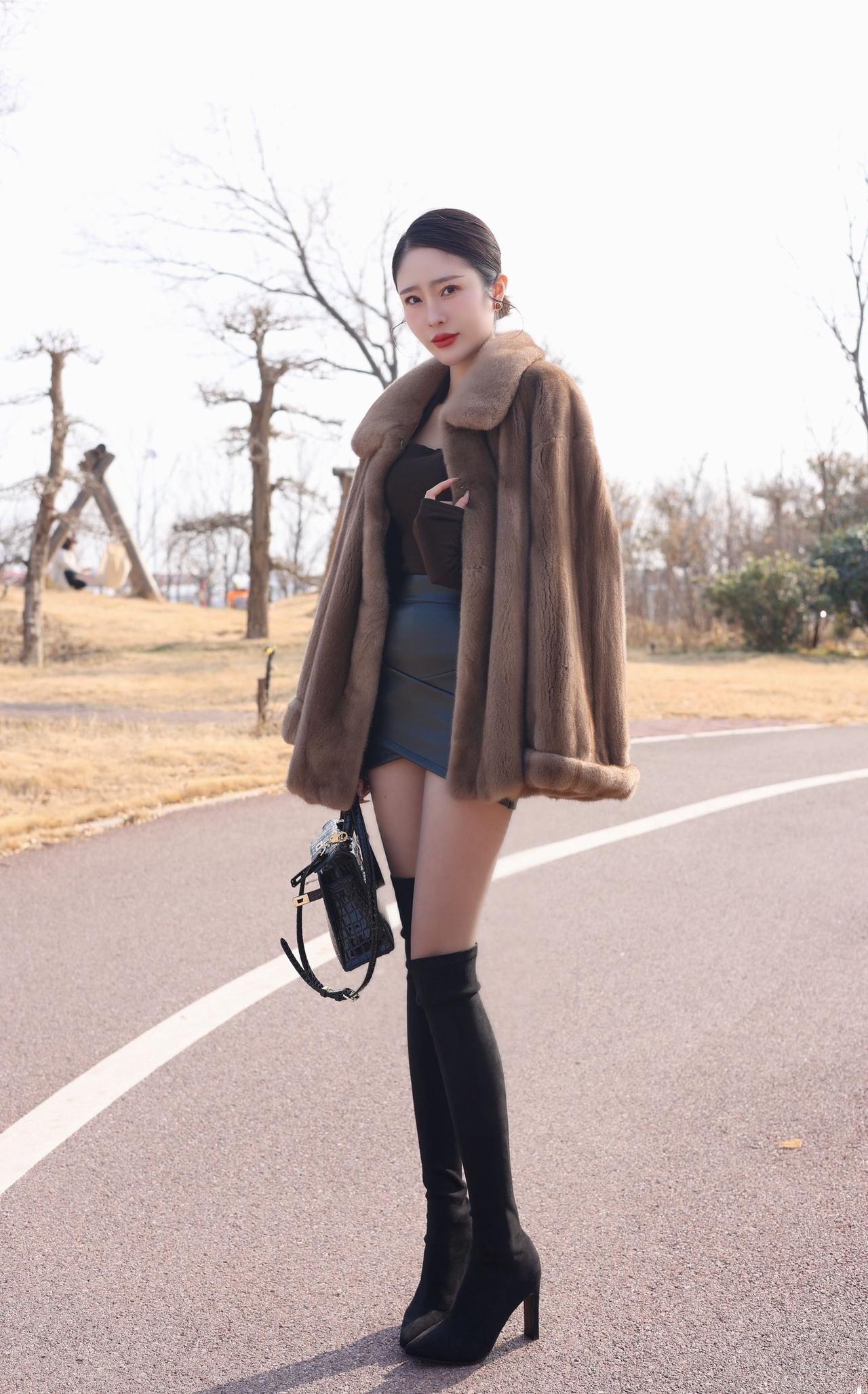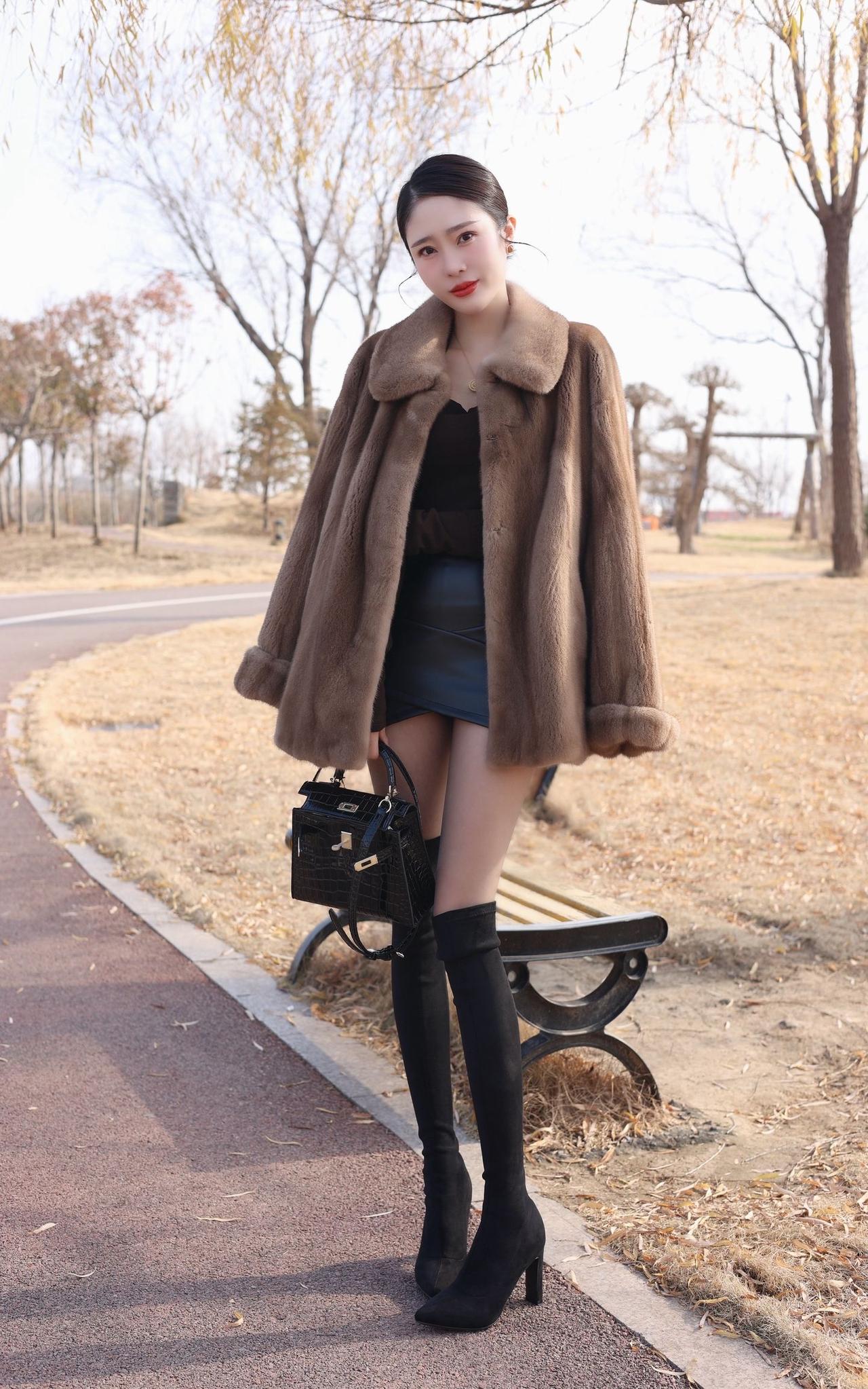 时尚穿搭指南:黑色皮裙+棕色蕾丝上衣+黑色毛绒外套,完美搭配!