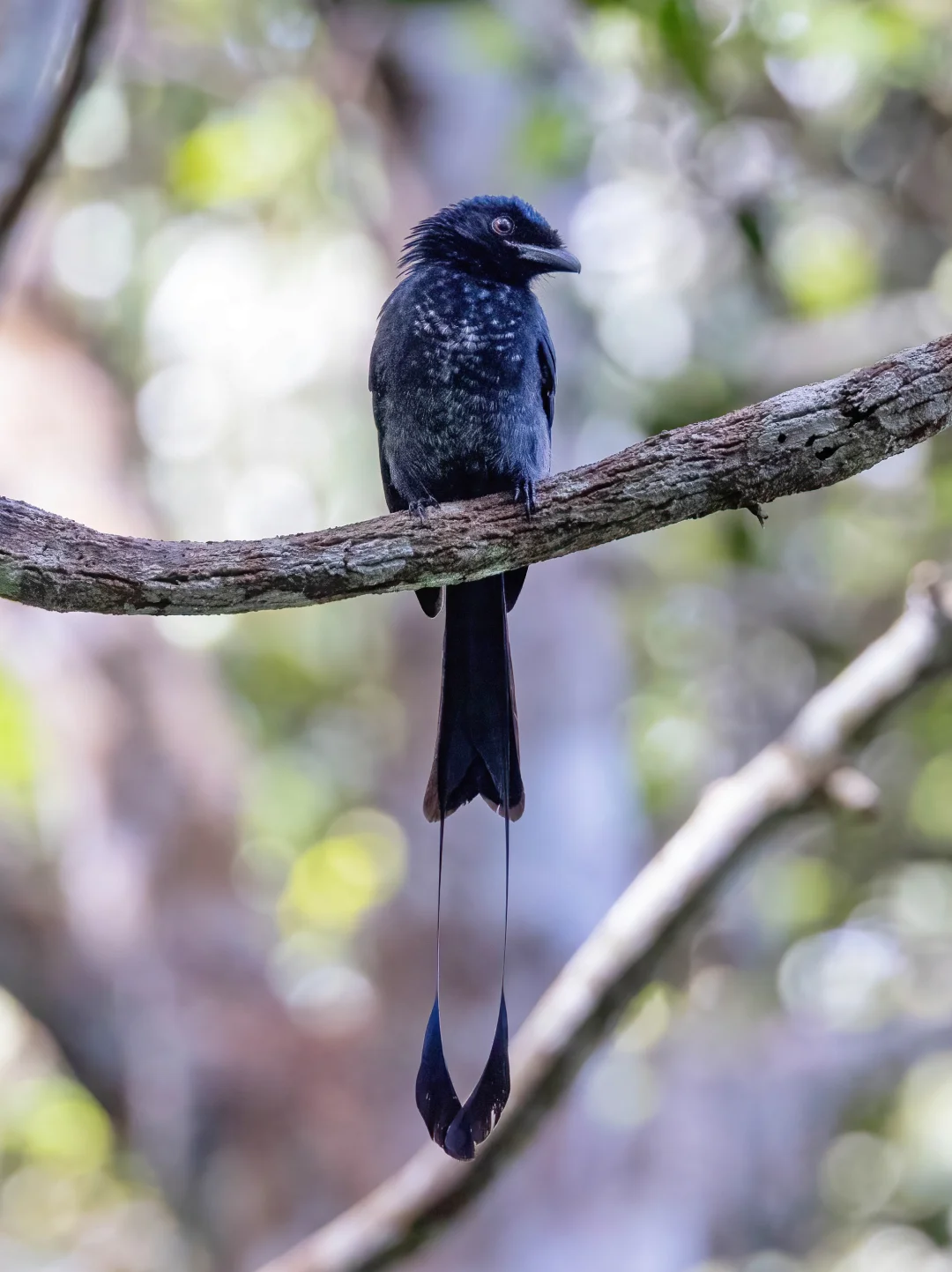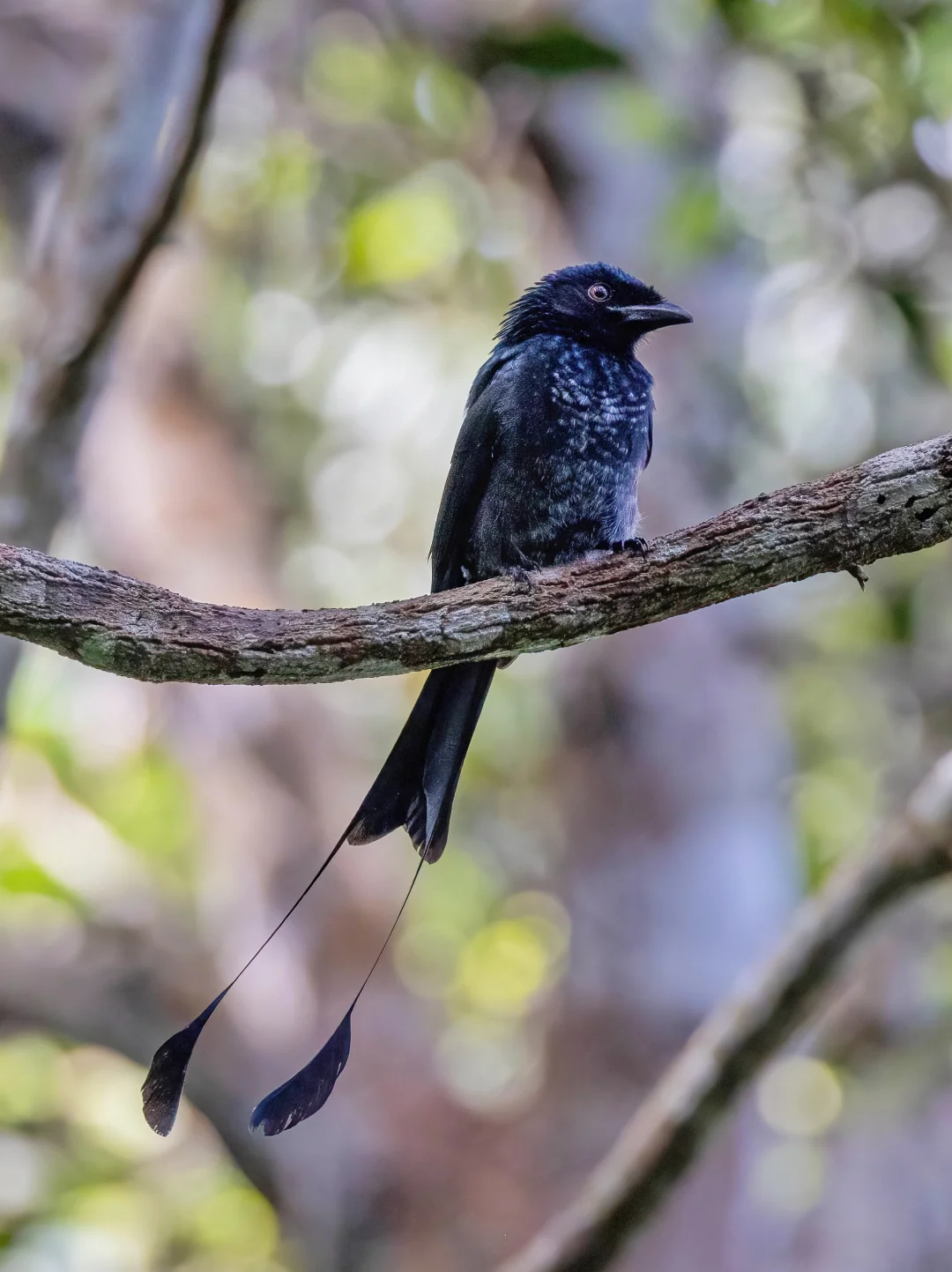 原创拍摄于2025.01 大盘尾,雀形目卷尾科卷尾属。延长的外侧尾羽,和终端的网球拍状羽片,是它们的特色。 其实是在槟城升旗山旅游,没想到路上遇见了它,感觉个子小小的,也没看到冠羽,还以为是小盘尾,仔细看看是大盘尾。已经在连续三年的年初看到这种漂亮的小鸟啦,我把它称作我的新年鸟!