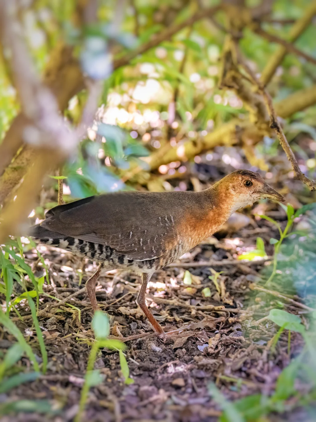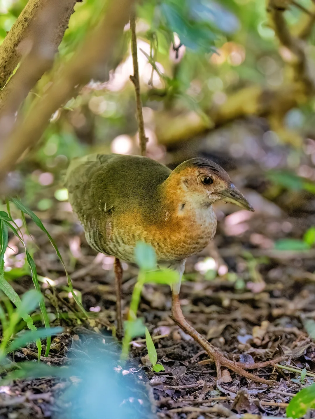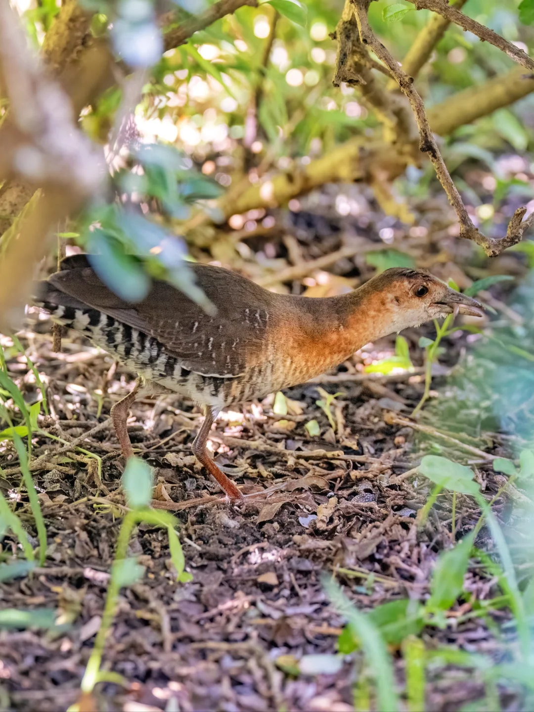 斑胁田鸡,特征明显,脸到胸橙色,胁部有黑白条纹,背部灰褐色。它们夏季在东北亚繁殖,冬季到东南亚越冬,在我国刚好沿海岸线迁徙。