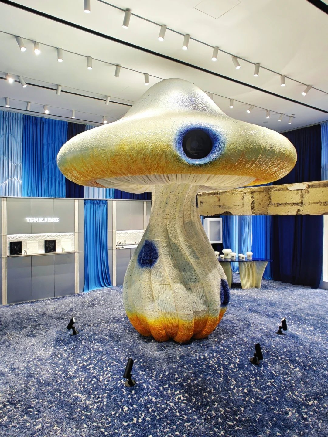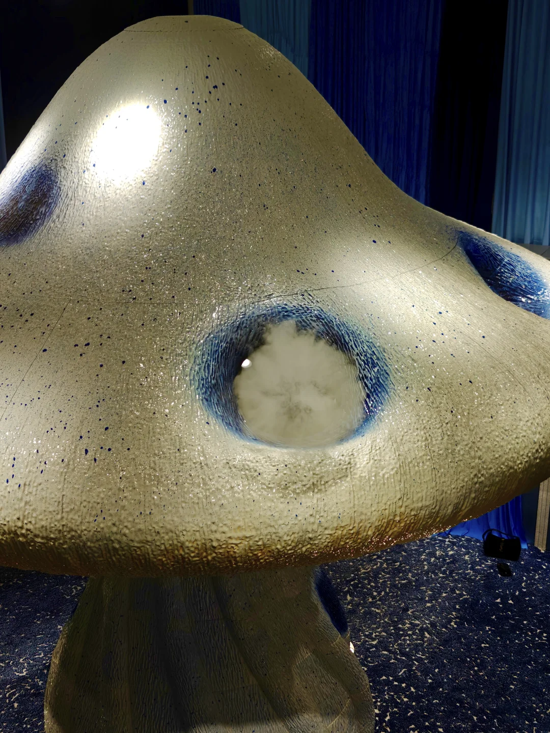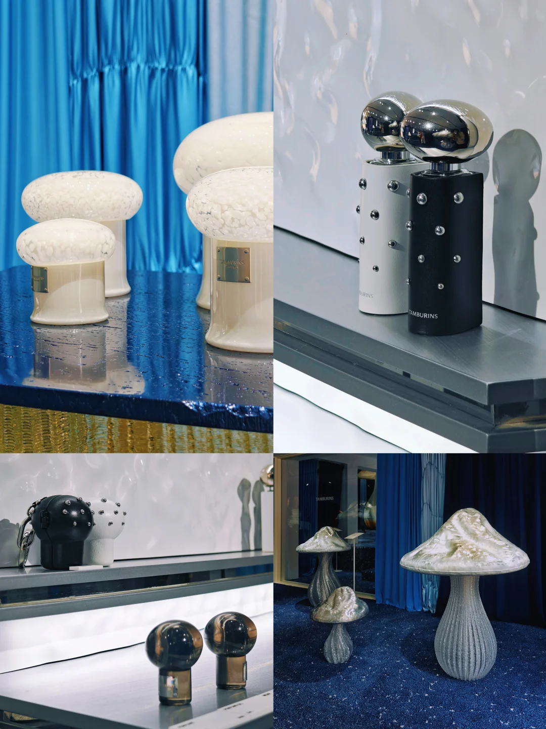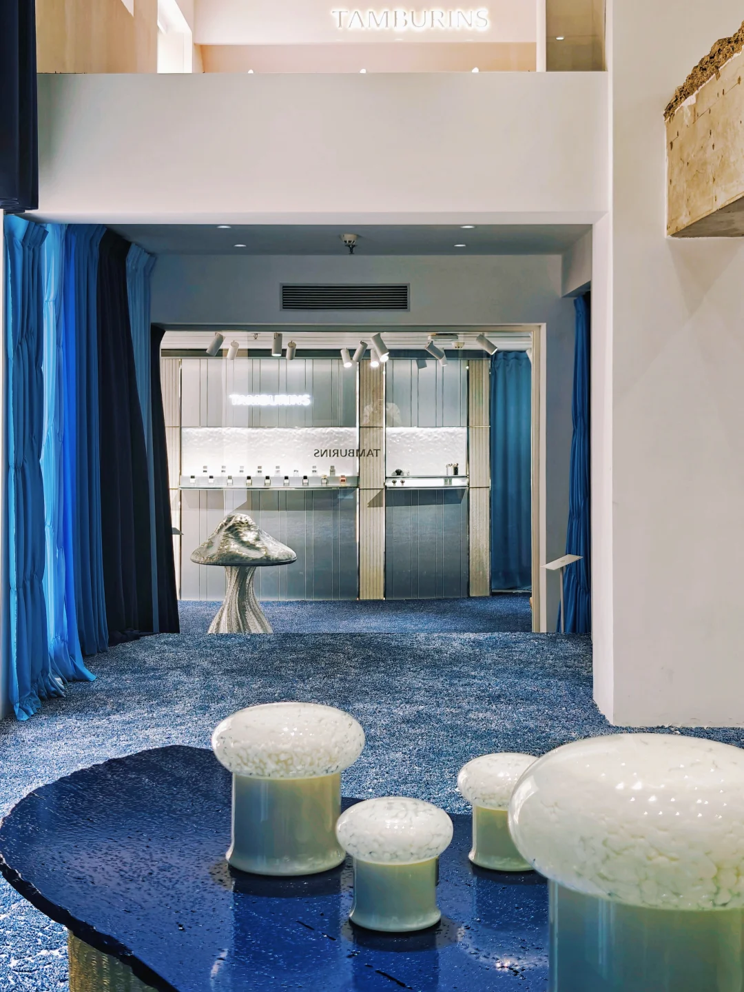 🍄TAMBURINS果然是不会让人失望,这一次的『思绪之间』主题又是超级吸睛!蓝白主色调的空间中布满大大小小的蘑菇雕塑,充满魔幻色彩。