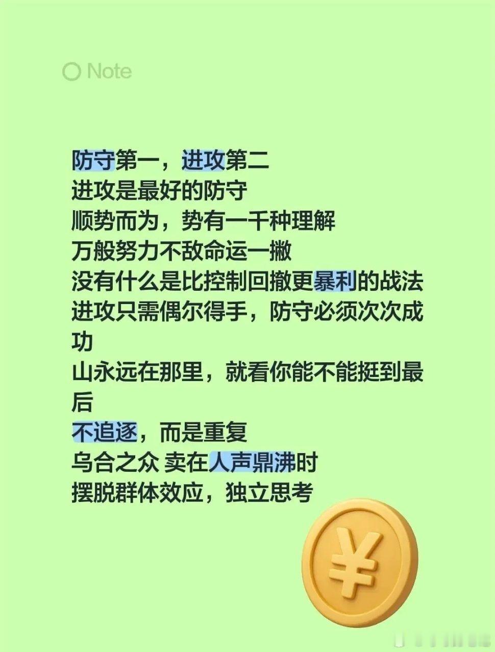 防守第一,进攻第二进攻是最好的防守顺势而为,势有一千种理解万般努力不敌命运一撇没有什么是比控制回撤更暴利的战法进攻只需偶尔得手,防守必须次次成功山永远在那里,就看你能不能挺到最后不追逐,而是重复乌合之众 卖在人声鼎沸时摆脱群体效应,独立思考a股