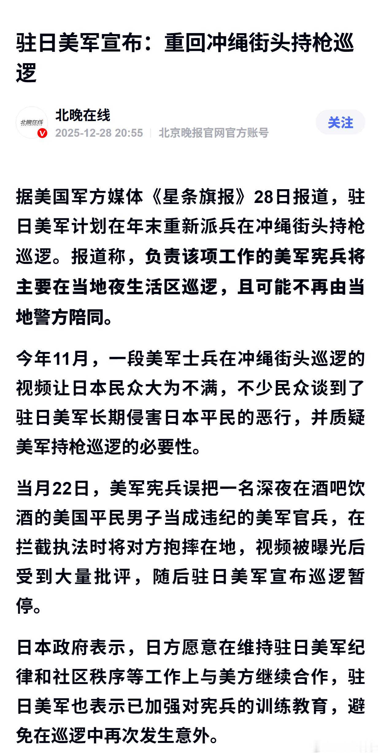 驻日美军宣布:重回冲绳街头持枪巡逻