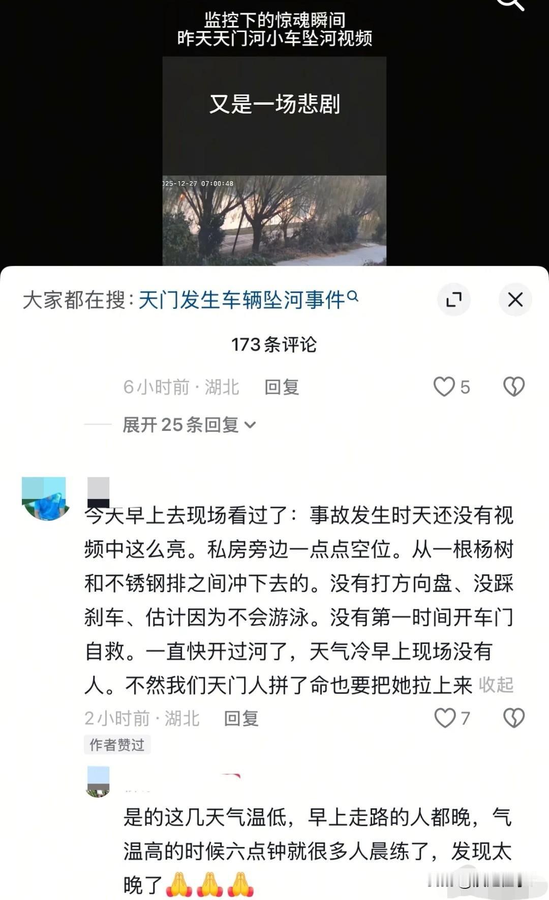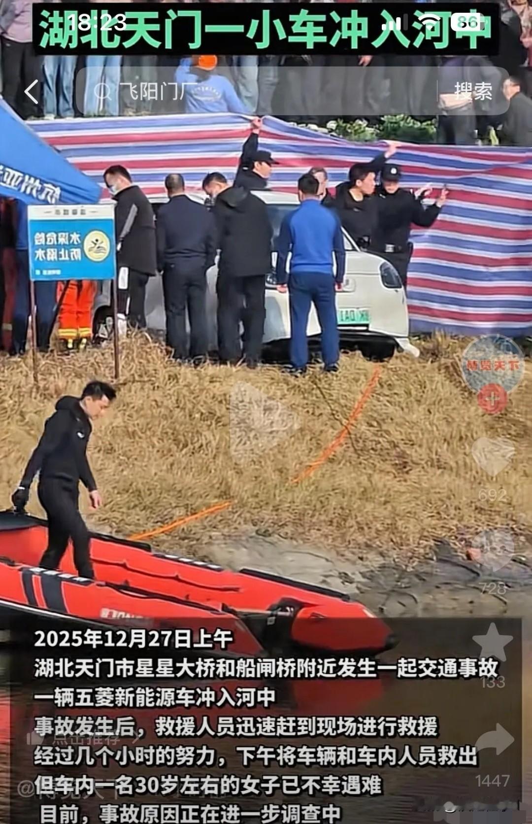 26岁新手女司机刚练一天车就独自开新能源车上班,冲下河丢了性命。 2025年12月27日周六早上6点多,湖北天门女子驾驶新能源车出门。她刚拿驾照不久,前一天刚练完车,觉得自己实打实掌握了技巧,没找老司机陪同就敢独自上路。车子行经星星大桥与船闸桥附近时,监控拍下惊险一幕,车子径直冲出马路。 马路与河道之间隔着绿化带、数米宽步道和护坡,有多层缓冲空间,相当于给车辆装了“安全防护网”。但女子全程没踩刹车,也没打方向盘,硬生生冲过障碍坠河。当时天太早又是周末,周边没人发现,直到下午两点多车子才被打捞上岸,女子已无生命体征。 警方通报事故原因还在调查,但结合监控和知情人说法,大概率是女子遇事紧张,误把油门当刹车。不少新手都犯过类似迷糊,此前晋江就有女子刚拿驾照一天,慌乱中误踩油门撞护栏。 这起悲剧给新手上了狠狠一课,开车不是儿戏,心态和经验缺一不可。 你觉得新手最少练多久独自上路才安全?新能源车驾驶有哪些特殊注意点?