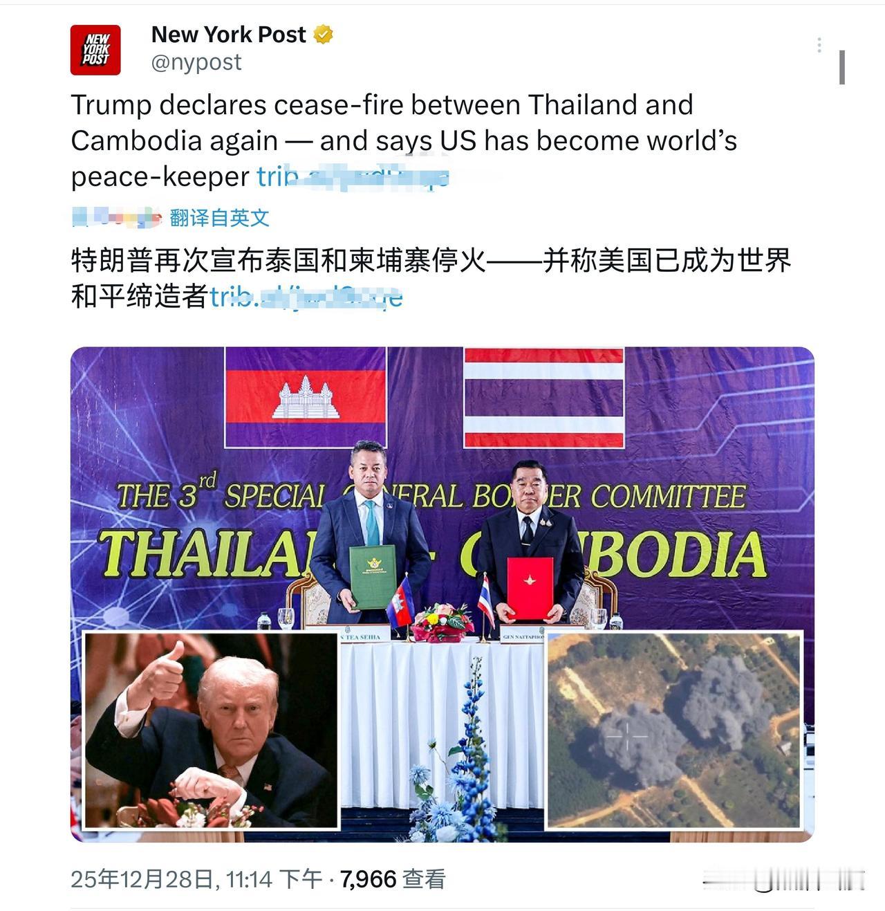 上次美国的【调停协议】不算?第一次泰国和柬埔寨发生了边境冲突,后来是特朗普宣布自己【调停】了双方,还签好了协议。 这还没多久呢,12月份双方再次爆发冲突超过一周。“神奇”的特朗普刚刚再次宣布,双方又得到了他的【调停】。 要知道,十月份那次在马来西亚,双方可是在特朗普的主导下签署了和平协议。才两个月这协议就失效了,特朗普这自称和平缔造者的面子确实搁不下啊。很快特朗普宣布要是双方不停下和谈,他就给两家各一大棒子。 现在两家又宣布停火,也不知道这次是否真算数?