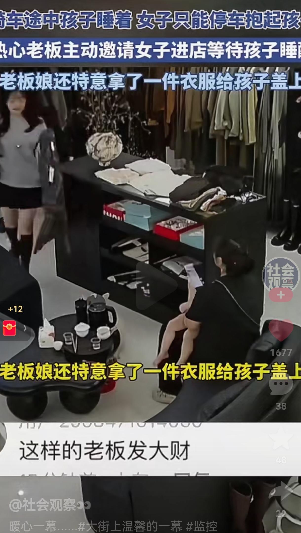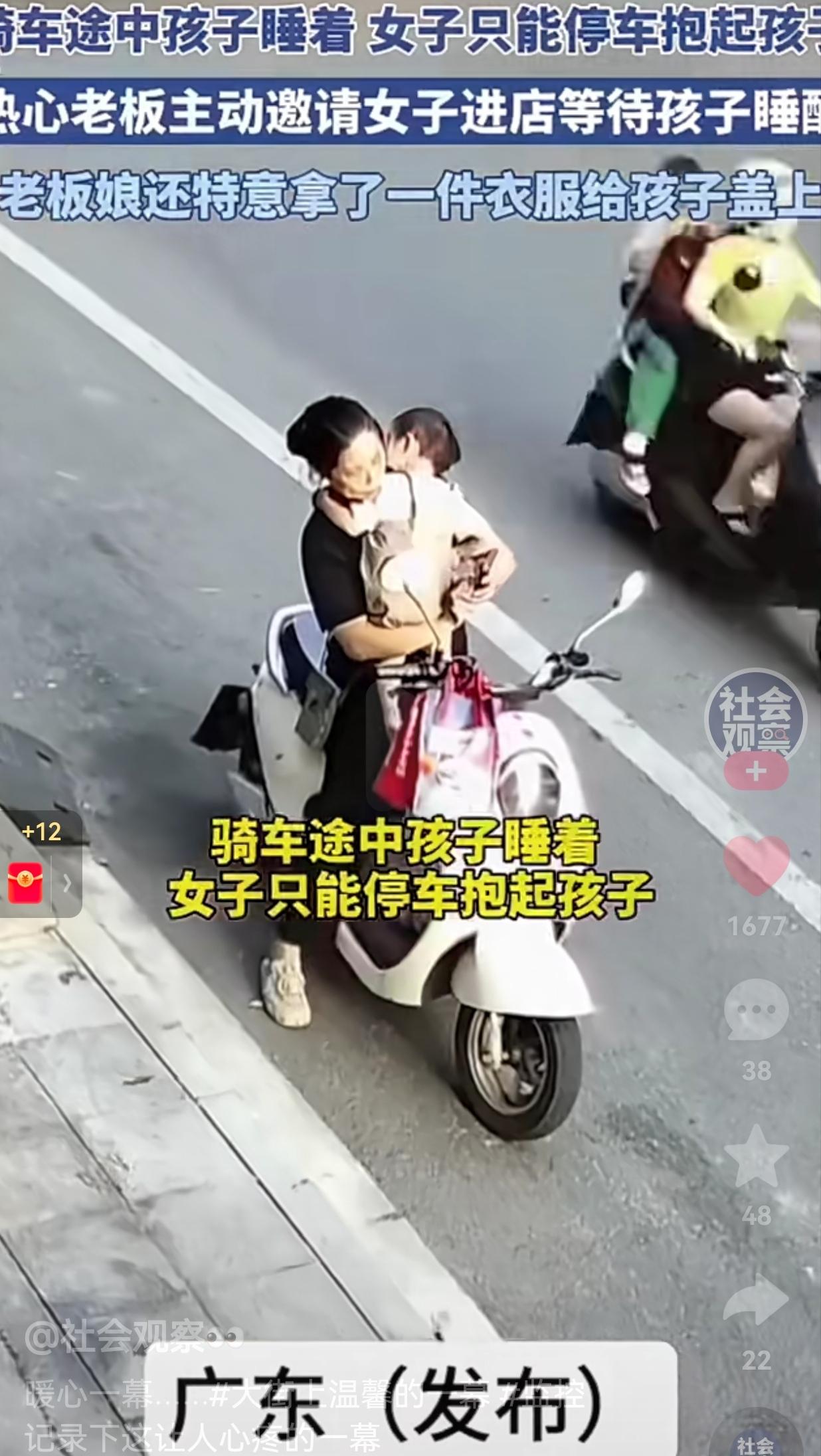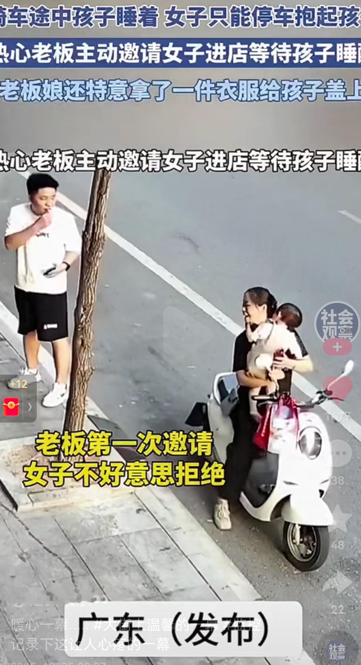 这样的老板想不发财都难!骑车途中孩子睡着,女子只能停车抱起孩子,热心老板两次邀请女子进店等待孩子睡醒,这一幕看的人心里暖暖的。 广东街头的马路边,一个骑电动车的女子把车停在路边,怀里死死抱着睡熟的娃,另一只手还得攥着车把,在人来人往的路边僵着,一动不敢动。娃睡得香,她怕一松手车倒了惊醒孩子,就这么硬挺着。 这一幕正好被旁边店的老板瞅了个满眼,他立马跑出来,冲女人摆着手喊:“进店里坐吧,外头风大,孩子在这儿睡不舒坦。” 女人愣了下,赶忙摆手推辞,脸上满是不好意思,嘴上说着:“不用不用,太麻烦你们了。” 老板没多话,转身回了店,可没一会儿又走出来,老板又出来了对女子还是说了同样的话:“进来吧,没事的,店里有地方坐。” 接连邀了两次,女人见老板很热情,自己也不好意思拒绝,这才抱着孩子,有点拘谨地跟着老板进了店。 进店后,老板娘瞅见孩子就穿了件薄衣裳,二话不说,找了件干净衣服,轻轻盖在孩子身上,还搬了张软乎乎的沙发,让女人抱着孩子躺着歇会儿。 这一幕幕被店里的监控拍下来,发到网上后,看哭了不少人。 后来有人问老板娘为啥这么做,她笑得特实在:“以前门口常有老人躲雨,我们都喊进来歇歇。不过是搭把手的小事,没啥好说的。” 可对那个独自带娃的女人来说,这哪是“小事”啊?独自带娃的日子里,最怕的就是这种突发状况:孩子突然睡着,自己前不着村后不着店,连个歇脚的地儿都没有。 这时候陌生人的一句邀请,一件盖在孩子身上的衣服,就跟大冷天递过来的一杯热水似的,暖的不只是身子,更是心里那点慌劲儿。 咱活在这世上,谁还没遇过点难事儿?可能是加班到深夜赶不上末班车的无助,可能是在外打拼生病没人管的孤单,也可能是像这位妈妈一样,独自带娃时的手忙脚乱。 这些时候,旁人的一点点善意,就跟黑夜里的一盏小灯似的,能让你突然觉得,这人间也没那么冷。 人间的温暖,从来都不是啥轰轰烈烈的大事。是老板看见难处时的两次邀请,是老板娘随手递过去的一件衣服,是陌生人之间那份不着痕迹的体谅。这些细碎的美好,拼起来就是日子里最动人的模样。 生活从来都不容易,可正因为有这些不期而遇的善意,咱才愿意在别人需要的时候,也伸出手去拉一把。 毕竟善意这东西,是会传的,你今天给出去的温暖,说不定哪天,就会以另一种方式,回到你身边。 最后,也真心祝愿这位暖心的老板,店铺生意兴隆通四海,财源广进达三江,希望这份善良能换来最实打实的好运! 大家觉得呢?欢迎大家评论区讨论留言。