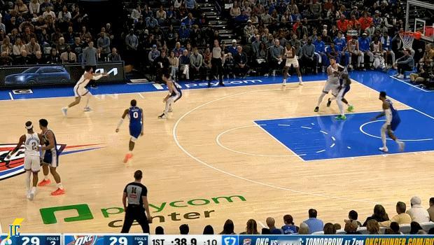 杰伦与哈腾互相助攻对方打成配合,随后切特中投单打命中,雷霆开场一波16-9打停7