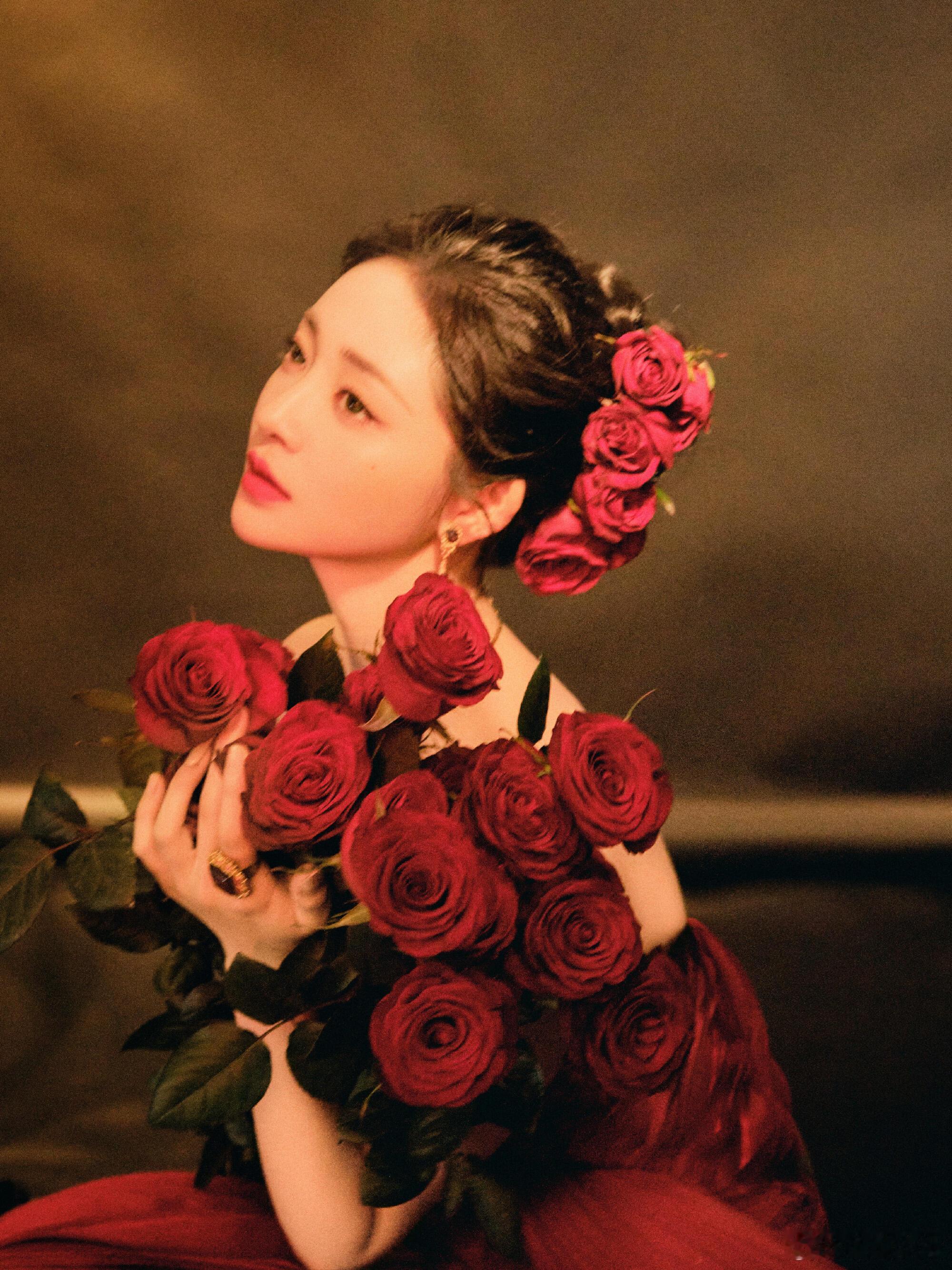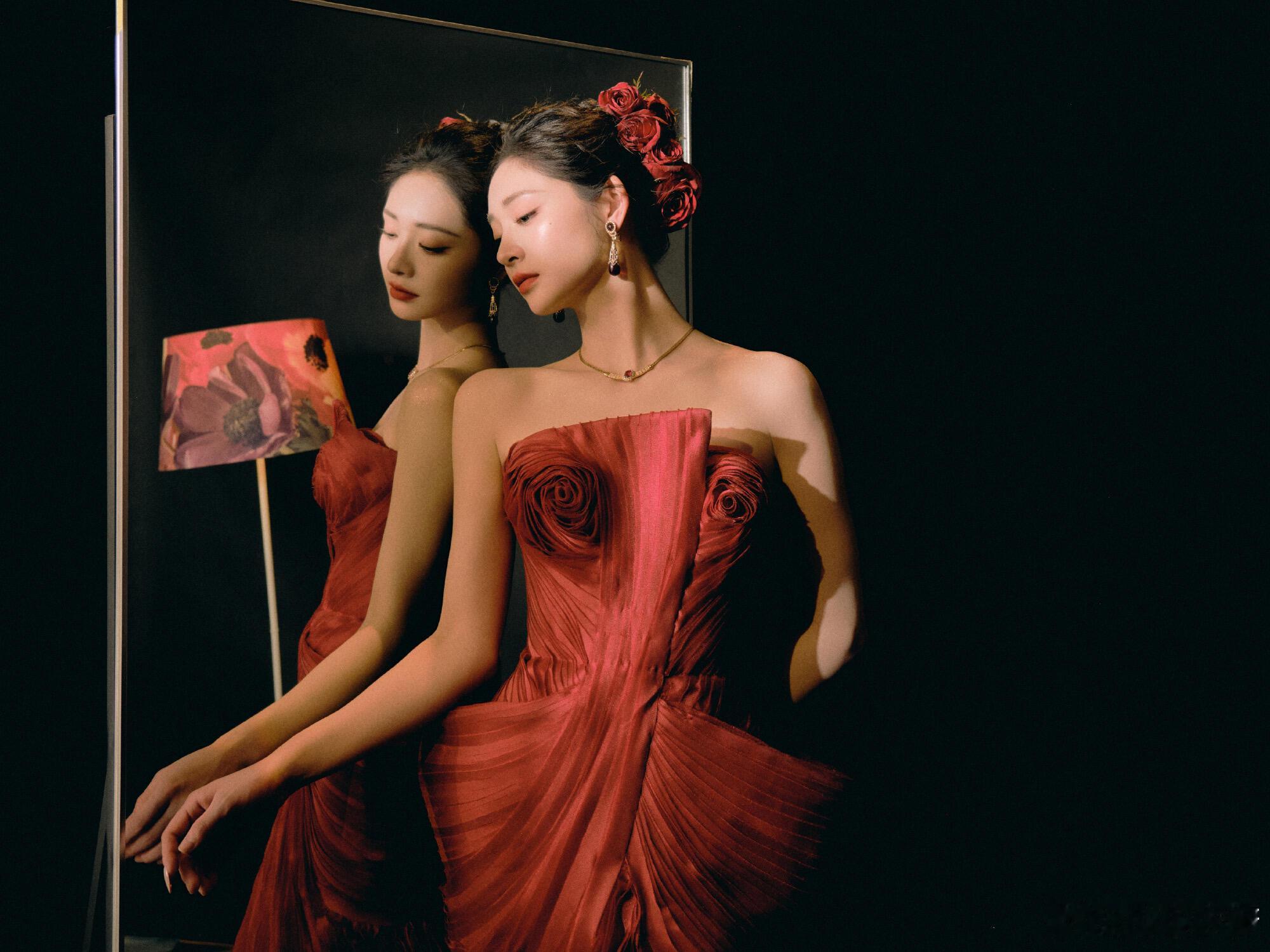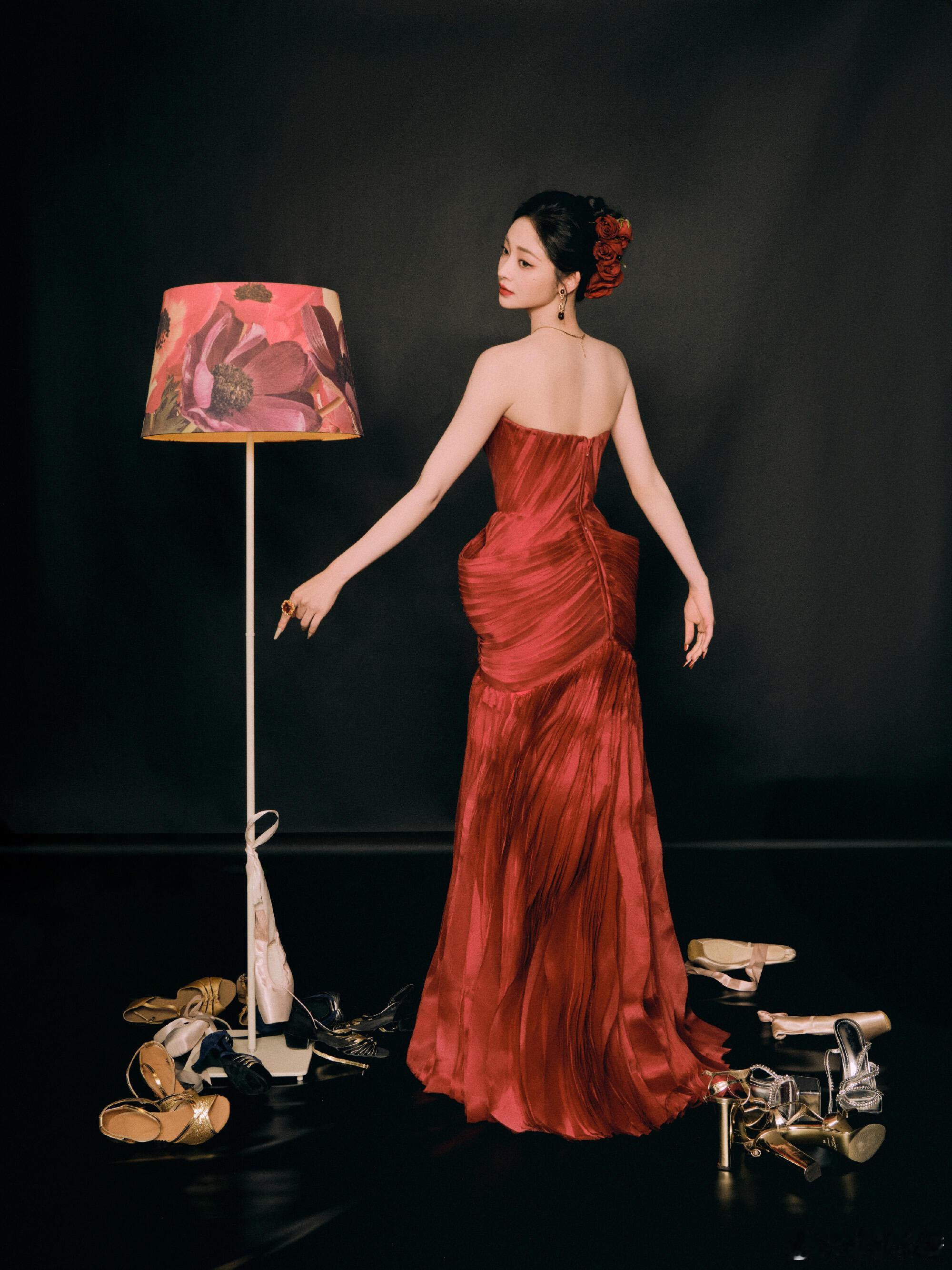 周洁琼 抹胸裁得红焰吻着锁骨,指尖轻捻,眼波流转间,风月都醉在那抹红里。周洁琼