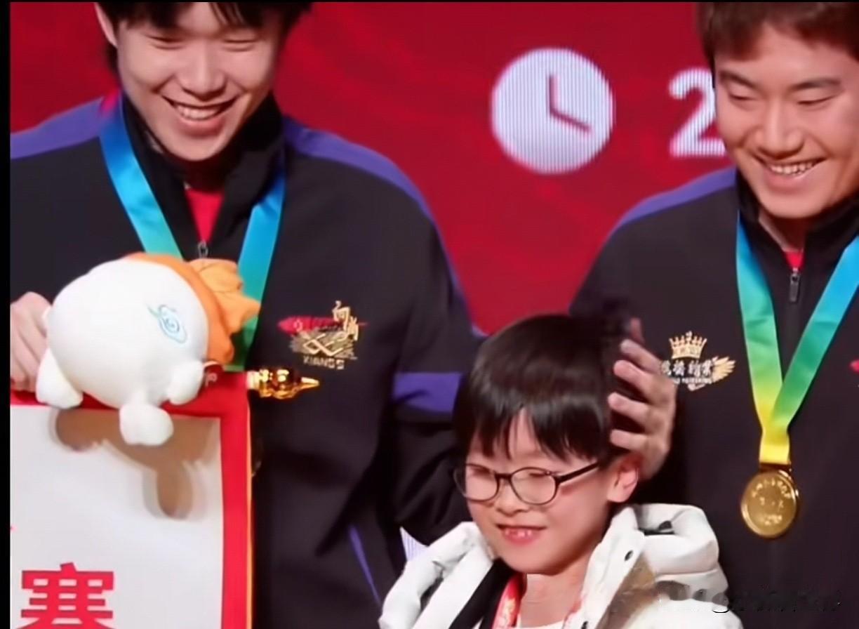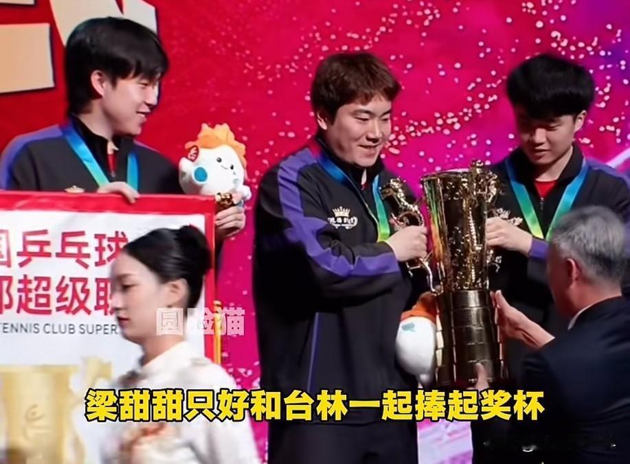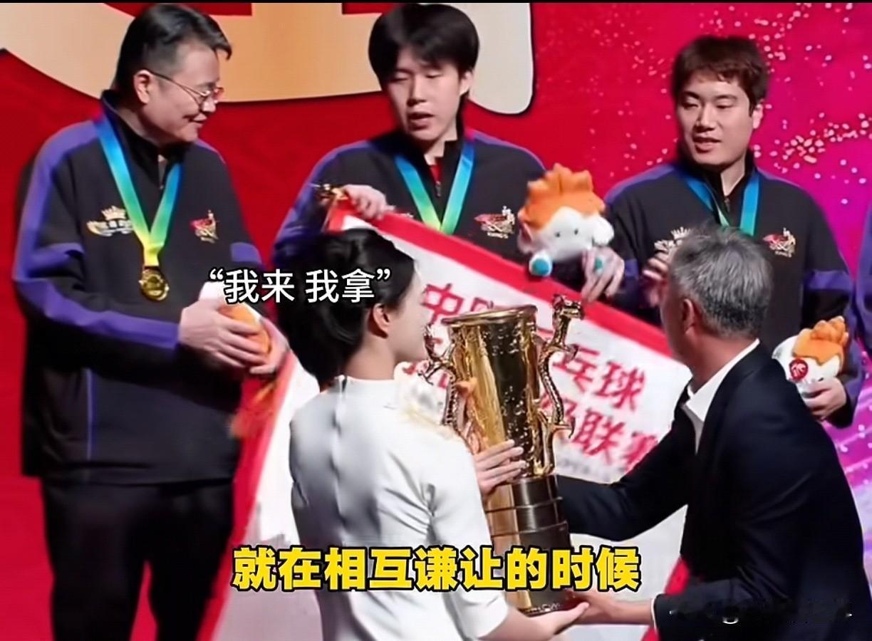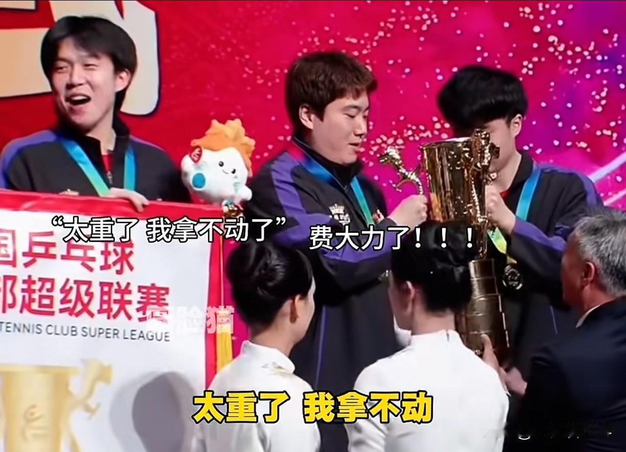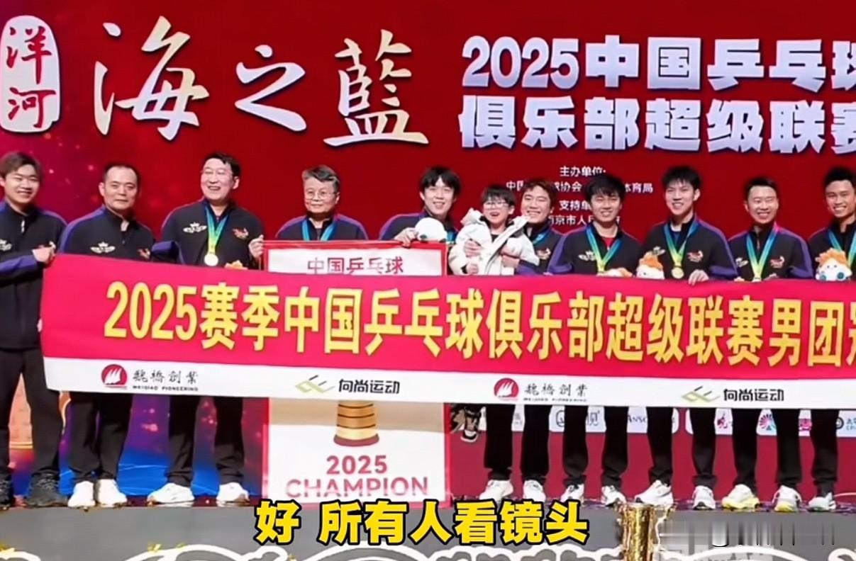 好开心的一幕,头哥王楚钦所在的魏桥夺冠啦!2025乒超联赛总决赛最甜的一幕来啦! 秦指导把冠军旗递过来时,祖师爷手一挥示意放队伍中间去,梁甜甜马上接过了旗帜。 不过旗帜有点大,两边的头哥和林昀儒顺手也帮忙扶着旗杆。这时梁甜甜对头哥发话说你来! 正中下怀,头哥开心地接过旗帜,因为他一眼看到那个大奖杯送上来了。 哈哈哈!冠军必须拼命去争,但拿了奖杯嘛最好让别人拿!毕竟乒超联赛总决赛冠军来之不易,是大家齐心协力的结果。 可是奖杯真的太重了!看梁甜甜龇牙咧嘴的模样,真是太好笑了!结果梁甜甜又把奖杯转给旁边的人。 最暖心的一幕来了!让俱乐部的人一起上来,给2025划上圆满句号,一起拍照喽! 那个小不点也快上来,原来是梁甜甜的儿子凉皮,这次作为球童出现在总决赛现场。 可是小朋友个子小,被前面的旗子挡住了。说的迟那时快,梁甜甜一下子抱起儿子,头哥助力把凉皮一起举高高啦。 这真是最幸福的画面,这来之不易的胜利,让头哥的笑容特别灿烂。祝贺山东魏桥拿到2025乒超联赛总决赛冠军啦!