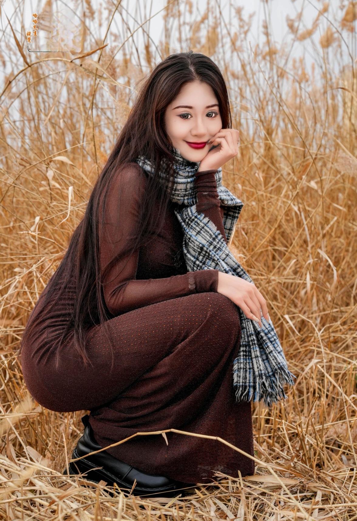 秋日暖阳下,少女在金黄芦苇中微笑,温暖而恬静。