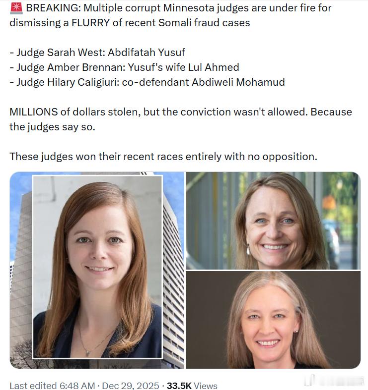 多名明尼苏达州涉嫌腐败的法官驳回了近期大量涉及索马里裔的欺诈案件。• 法官莎拉·韦斯特:驳回了对 阿卜迪法塔赫·尤素夫的指控• 法官安珀·布伦南:驳回了对 尤素夫的妻子 卢尔·艾哈迈德的指控• 法官希拉里·卡利朱里:驳回了对共同被告 阿卜迪维利·穆罕默德的指控数百万美元被盗,但却不允许作出定罪——只因为这些法官这样裁定。这些法官全部是在“无人竞争”的情况下当选的。