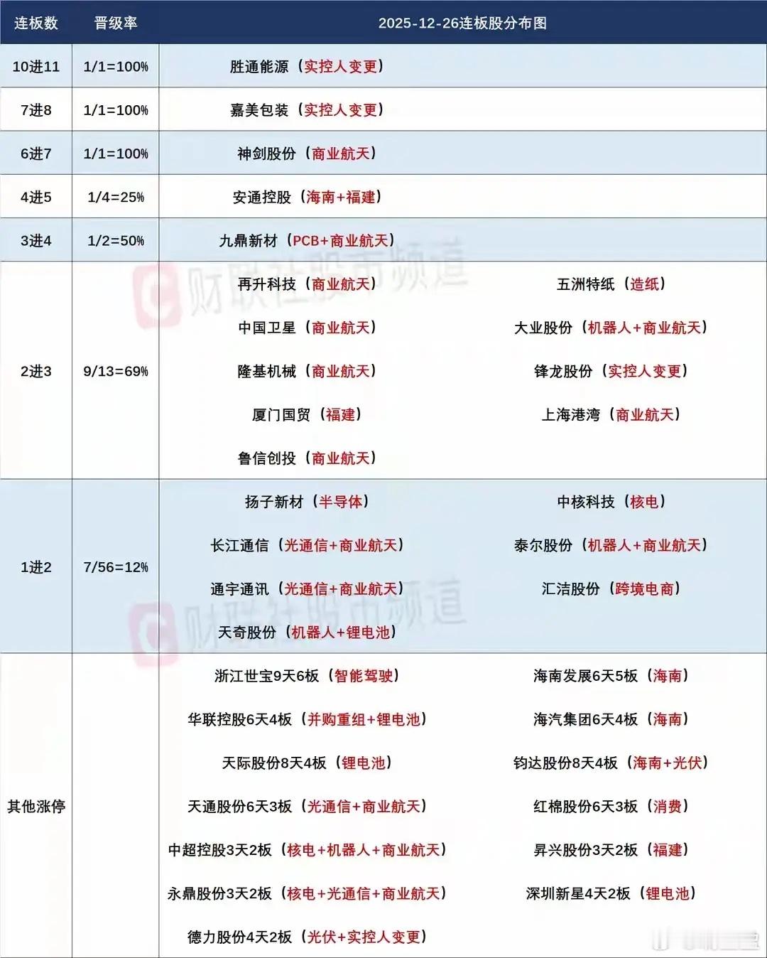 12月29日盘前预案:沪指冲击九连阳 神剑挑战异动成核心看点沪指已然斩获八连阳,这样的强势走势在2025年仅在8月出现过一次。从周末市场情绪来看,资金对沪指冲击九连阳普遍抱有期待。上周五市场量能显著放大,盘中更是顶住剧烈分歧逆势走高,足见资金做多、推动指数突破的信心。眼下年内仅剩三个交易日,沪指冲击4000点的窗口仍在,这大概率是2025年牛市行情收官阶段的核心诉求。即便部分资金存在节前避险需求,抛压也更可能集中在次日释放,今日市场情绪依旧值得期待。胜通强势晋级11连板,在今年严重异动规则的约束下,仅有同属重组概念的天普曾达成这一高度。该股上周五迎来爆量分歧,但走势与此前天普的表现高度相似,足见其韧性。如今能制约它的,唯有停牌风险。周末消息面明确,若胜通继续上涨,将触发主动申请停牌的条件;无独有偶,同样身处重组赛道、斩获八连板的嘉美,也传出了同类消息。这释放出监管层对严重异动个股的明确态度,因此胜通今日的表现至关重要。倘若胜通出现明显负反馈,势必会影响神剑冲击异动的节奏;但要是胜通延续强势,神剑挑战异动的底气将大幅增强。从板块效应与自身趋势来看,神剑都是当前市场破局龙头的最优候选。商业航天板块连续三日掀起涨停潮,这波强势行情的背后,离不开近期商业火箭密集首发的催化。盘后更是传来利好,商业火箭企业适用科创板第五套上市标准的细则正式落地,对板块构成直接提振。不过利空因素同样存在,美股商业航天板块上周五晚间大幅回调,且原定于周末首发的天龙三号火箭官宣延期,叠加板块连续高潮后分歧欲望强烈,今日商业航天前排标的能否顶住压力、延续强势,将成为一大关键看点。作为商业航天当之无愧的龙头,神剑以7连一字板的凌厉走势,剑指严重异动红线。今日竞价表现将是重要信号:若竞价继续一字开盘,意味着资金挑战异动规则的信心充足,只要胜通不出现负反馈,即便商业航天板块迎来分歧,神剑也大概率会有资金强势维护,板上的放量分歧节点值得重点关注,若能承接住抛压完成回封,即便分歧加剧,凭借其超高热度,晋级挑战异动的希望依旧很大;反之,若竞价主动撤单、放弃一字开,则说明资金做多信心不足,一旦板块分歧蔓延,神剑很难获得资金合力支撑。航发是带动商业航天走强的人气标杆,相城大道大手笔让利市场7000万的操作,尽显格局。航发今日能否延续强势,将直接影响板块情绪走向。即便它很难继续连板,能否维持强势震荡的趋势,也值得密切跟踪,只要航发稳住,商业航天即便分歧,整体趋势也不会轻易走坏。卫星则是商业航天赛道的核心权重标的,凭借近千亿市值斩获三连板,其难度不亚于神剑的七连板。卫星能否守住上升趋势,是衡量商业航天分歧程度的另一重要风向标:若卫星趋势稳健,板块大概率只是良性小分歧;一旦卫星走弱破位,商业航天或将迎来深度调整。通宇正开启强势第三波行情,无奈恰逢板块分歧窗口。上周五它曾逆势涨停,尽显韧性,今日它是像二波行情那样直接掉头向下,还是能在高位稳住震荡,将成为观察商业航天高低切换的关键。二连板的泰尔则是小盘股的代表标的,兼具商业航天、锂电、机器人三大热门概念,堪称当前市场的“题材混血儿”。在商业航天分歧预期升温的背景下,泰尔能否切换主线、走出补涨行情,值得期待。上周五它以放量T字板晋级二板,足见资金认可度,若今日开盘能获得资金强势承接、主动冲击涨停,便可重点关注。首板方向中,超的热度居高不下,1+1的走势十分亮眼,今日即将冲击前高压力位。6.42元的前高价位将是其关键考验:若开盘便能站稳该位置,且核电板块同步发力,超有望成为资金高低切换的优选;反之,它很可能重蹈上周五华菱的覆辙,冲高回落。若今日早盘商业航天迎来深度分歧,市场资金势必会寻求新的突破口。隔夜外围白银大涨,或将带动有色板块异动,不过该板块近期多是一日游行情,持续性存疑。即便江铜凭借高辨识度迎来冲高,从短线视角来看也并非好的买点,追涨需谨慎。机器人板块则呈现分化态势,除了锋龙、天奇两只优必选概念股表现突出外,其余标的均未打开高度。不过上周五板块迎来一批首板股,说明资金仍在积极挖掘。锋龙的强势表现颇有胜通的影子,而天奇今日的分歧节点或许暗藏机会,关键要看机器人板块能否形成资金共振,若板块情绪回暖,天奇的分歧放量,大概率会被资金视作低吸良机。