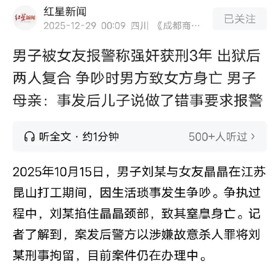 江苏昆山,一男子的女友来例假,男子还强行跟她发生关系,女友一气之下报警处理,最终男子被判刑关了3年,谁料,男子出狱后,两人重归于好,继续交往,3个月后,两人因生活琐事发生争吵,女友又提了男子入狱的事,男子冲动之下掐了女友脖子,导致她身亡。最终,男子因涉嫌犯罪被刑事拘留。 刘某和大学同学晶晶在学校的时候就互生好感,但两人都没有捅破那层关系纸。 2022年7月份的一天,正逢假期,两人出来打工期间见面,刘某主动跟晶晶表白。 晶晶本就对刘某有好感,两人自然而然地在一起成为男女朋友。 不久后,他们租房住到一起同居生活。 也许是年轻气盛,刘某和晶晶住在一起后,总想着那档事。 有一天,晶晶来例假了,刘某还是不放过晶晶,抱着她同房。 晶晶明显地表示出不乐意,坚决地拒绝刘某的要求,可刘某不依不饶,非要得到晶晶。 晶晶又气又急,情急之下直接报警处理,她跟警方表示,自己在生理期时遭到刘某强奸。 刘某很快被抓,但刘某被抓后,晶晶有些后悔自己一时的报警冲动,刘某被抓了说实在的她有些于心不忍。 所以,她发信息给刘某表示,我还爱着你,真心不希望你坐牢。 虽然晶晶这么说,但是法院认为,这不能代表刘某在晶晶生理期时违背妇女意愿强行跟她发生性关系的事实。 最终,一审法院以强奸罪判处刘某有期徒刑3年,刘某不服,提起上诉,二审维持原判。 2025年7月13日,刘某刑满释放,出狱不久后,刘某和晶晶重归于好,两人复合后一起到江苏昆山打工,并同居生活到一起。 原本以为,刘某能放下过去,不计前嫌,晶晶也一如既往爱着他,两人最终能修成正果,但是,他们才在一起没多久就出事了。 2025年10月15号那天晚上,刘某和晶晶因为生活琐事起了争执,两人越吵越凶。 口无遮拦的晶晶又提到了刘某强奸她入狱的事,这件事刘某本就觉得冤,一切都是因为晶晶,害自己白白坐了3年牢。 一想到这,刘某的火气瞬间唰的,就上头了,他冲过去直接掐了晶晶脖子,最终导致晶晶身亡。 刘某对晶晶动手后,看着她一动不动,一时慌了神,他没想到自己下手那么重,更没想到会害死了晶晶。 不知所措的刘某,第一时间把电话打给了母亲,他跟母亲说,自己犯错了,要求报警。 母亲一听儿子掐死了晶晶,也吓到了,他告诉母亲说,之所以这么干是因为,两人争吵后,晶晶又提到了之前的事,刺激到了刘某,情绪激动的他才干了傻事。 报警后,刘某很快被抓,警方最终以刘某涉嫌故意杀 人罪对他刑事拘留,目前案件正在进一步办理中。 有人说刘某也太冲动,太自私了,人家来例假,明显表示不乐意同房,你还强行跟人家发生关系,这很明显的是不懂得疼爱女方,活该被送进监狱,一点都不冤。 根据《刑法》第236条规定,以暴力、胁迫或者其他手段强奸妇女的,处3年以上10年以下有期徒刑。 有下列情形之一的,处10年以上有期徒刑、无期徒刑或者死刑: (一) 强奸妇女、奸淫幼女情节恶劣的; (二) 强奸妇女、奸淫幼女多人的; (三) 在公共场所当众强奸妇女、奸淫幼女的; (四) 二人以上轮奸的; (五) 奸淫不满十周岁的幼女或者造成幼女伤害的; (六) 致使被害人重伤、死亡或者造成其他严重后果的。 本案中,晶晶和刘某虽然是男女朋友关系,但是同居期间,晶晶来了例假,明确拒绝跟刘某同房,刘某还违背晶晶意愿,强行跟她发生关系,属于“违背妇女意志”的表现。 虽然,刘某被抓后,晶晶表示还爱着刘某,但是,也不能改变刘某违背妇女意志强行发生关系的事实。 刘某出狱后,双方都能不计前嫌,重归于好,本来,如果他们都能克制自己的冲动,好好相处,恩爱一辈子,这也算是美好的爱情,有情人终成眷属。 但是,刘某在心底里没能彻底放下过去,晶晶也口无遮拦,动了刘某心底里的那根刺,最终引发悲剧。 刘某受到刺激后冲动之下掐了晶晶。 根据《刑法》第232条规定, 故意杀人的,处死刑、无期徒刑或者10年以上有期徒刑;情节较轻的,处3年以上10年以下有期徒刑。 刘某明明知道掐脖子可能导致人死亡,但他依然放任结果的发生;虽他称冲动之下“失手”,但掐脖子属于高度危险行为,不属过失 。 晶晶被掐脖子窒息死亡跟刘某的行为存在直接因果关系。 因此,刘某主观是放任而非疏忽,不成立过失致人死亡。 而且,刘某出狱才3个月就又犯故意杀人罪,属于五年内再犯新罪的累犯,按照法律规定必须从重处罚。 不过,事发后刘某主动报警,到案后也如实交代了事情经过,这是自首,可以依法从轻或者减轻处罚。 另外,他是被女方的话刺激到,一时冲动下的手,这种情况属于激情犯罪,有可能被认定为故意杀人罪里“情节较轻”的情形。 目前,案件还在进一步办理中。