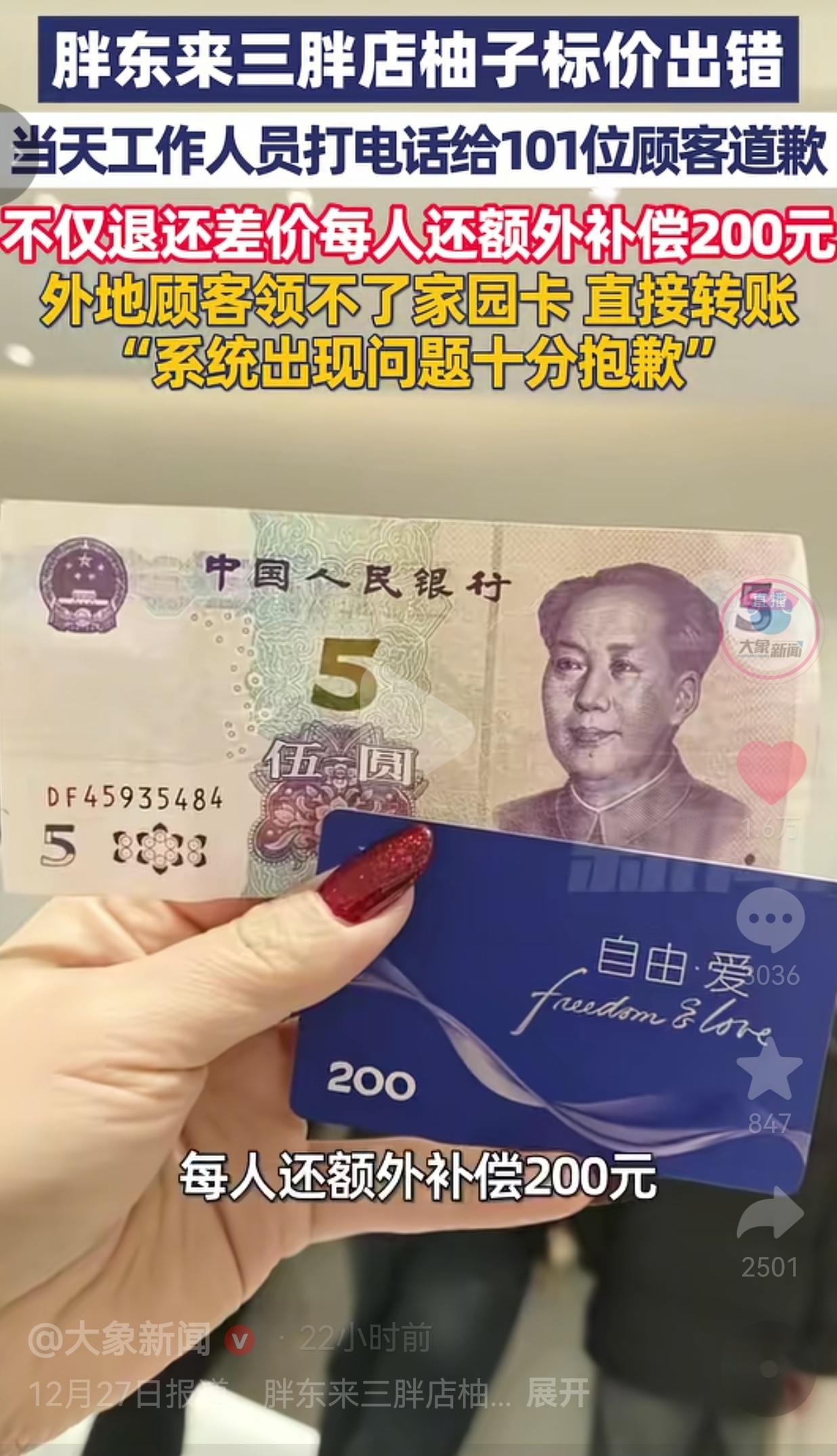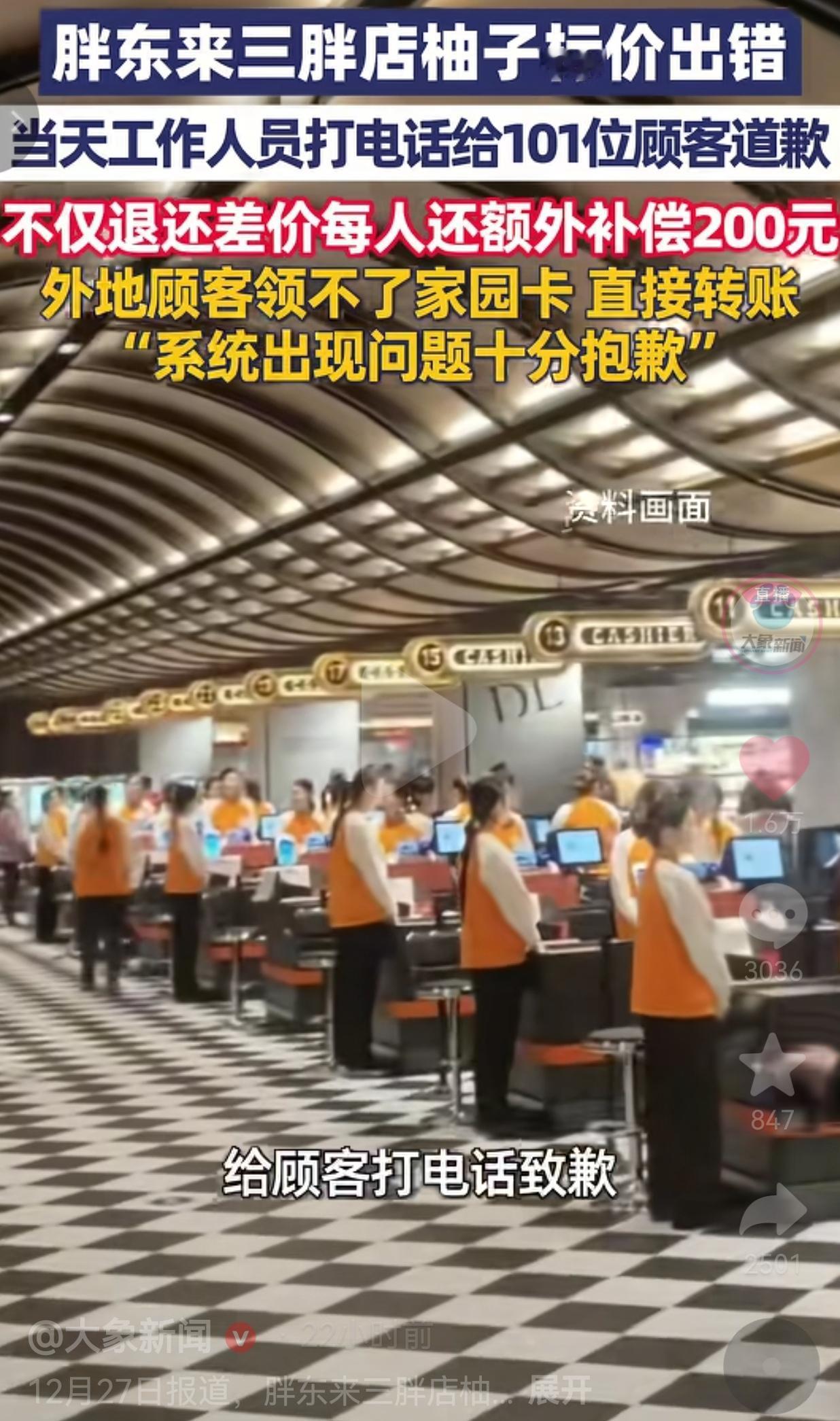 胖东来又爆火!柚子因系统出错导致标价搞错,当天工作人员打电话给101位顾客道歉,
