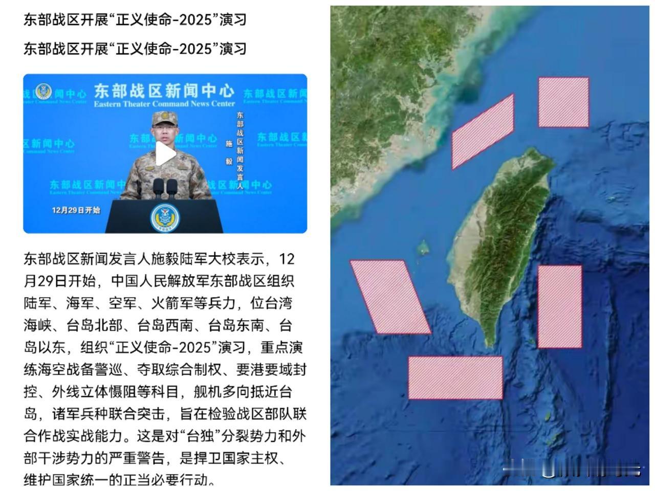 厉害了,我的国!近日国民党主席郑丽文多次公开表态,只有坚持“九二共识”、反对“台独”,才能实现两岸和平和解,批评台赖清德不顾台湾民意,一味搞台独。今天,东部战区重磅宣布,将在台湾周边举行海陆空加火箭军等多兵种多方位“正义使命-2025”演习,报道称这次将重点演练海空战备警巡、夺取综合制权、要港要域封控、外线立体慑阻等科目,目前舰机多向抵近台岛,诸军兵种联合突击,旨在检验战区部队联合作战实战能力。不光是震慑台独分子,也能震慑外部干扰台湾势力,更能彰显我们维护台海稳定,维护国家统一的决心于实力。