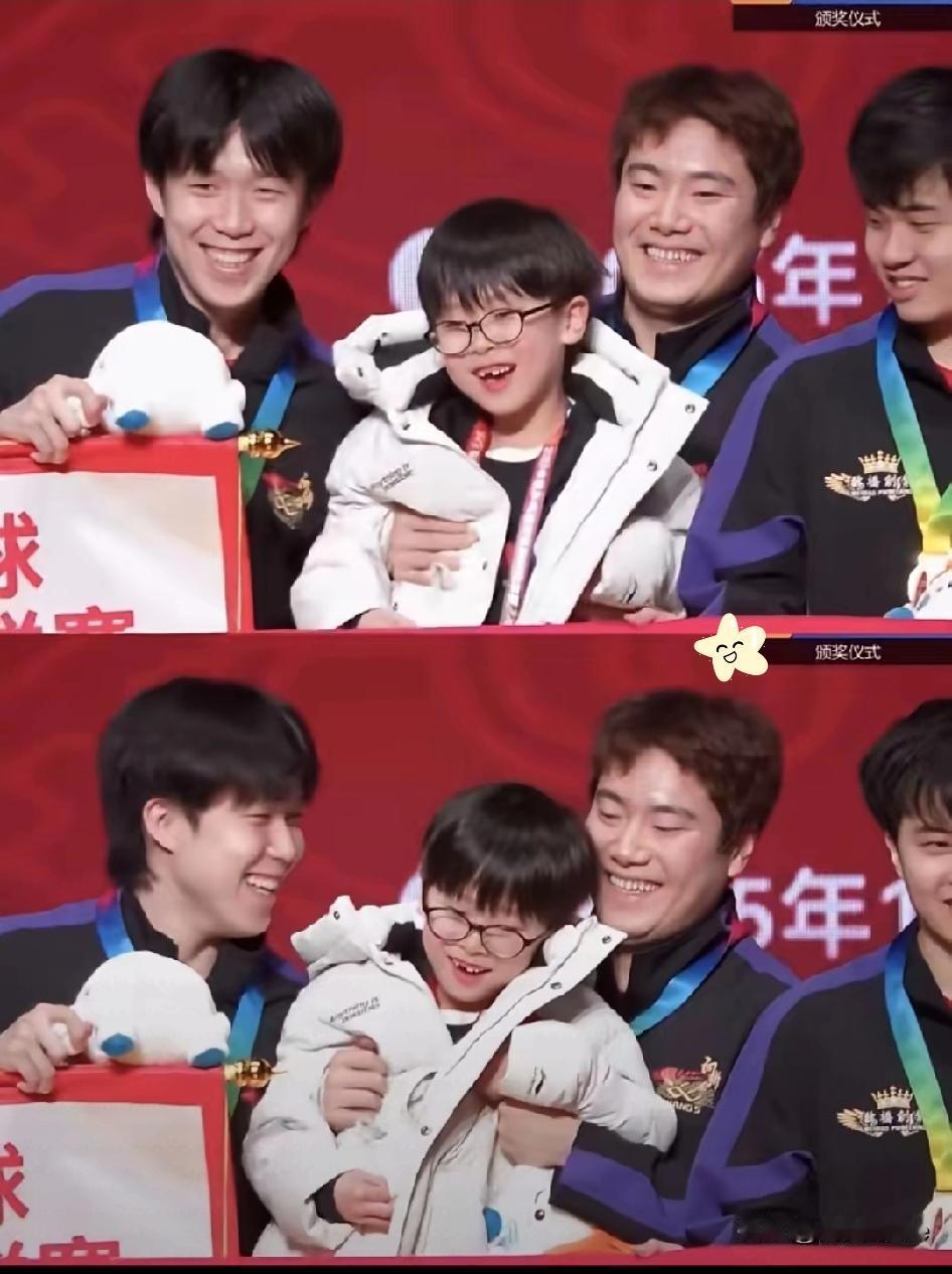 好细心的姑父呀! 今天小凉皮的合影被条幅挡住了,姑父说抱起来,爸爸抱起来高度不够,姑父一搓小凉皮的小屁墩,高度立马就够了。 哈哈,有这样的姑父真是开心死了。这次楚钦的玩偶,是不是也是小凉皮的呢?