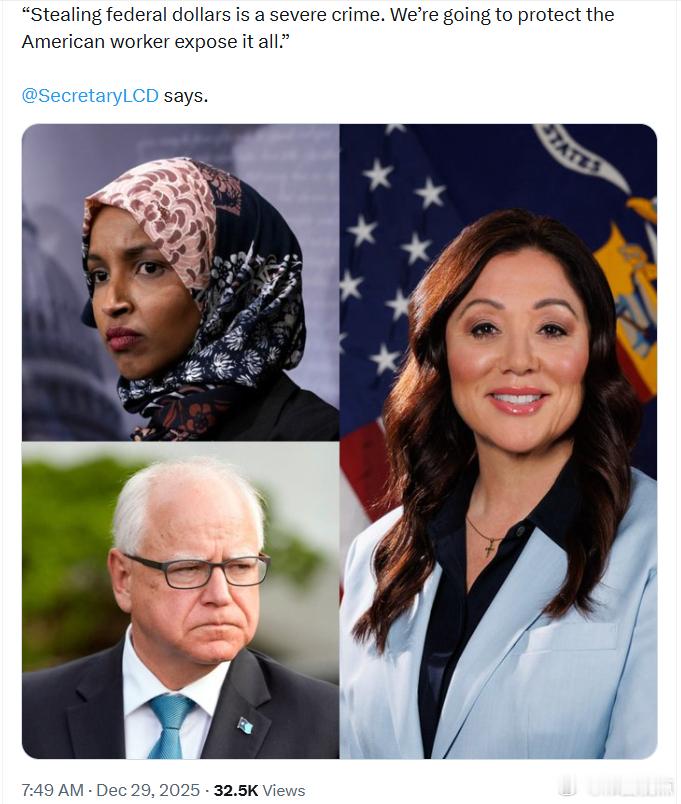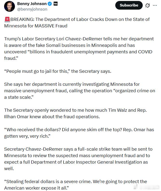 本尼·约翰逊:劳工部重拳打击明尼苏达州的大规模欺诈劳工部长洛里·查韦斯-德雷默(Lori Chavez-DeRemer)告诉我,她的部门已掌握明尼阿波利斯的假索马里企业情况,并发现了“数十亿美元的欺诈性失业救济和COVID 欺诈”。部长表示:“涉案人员必须入狱。”她说,劳工部目前正在调查明尼苏达州的大规模失业救济欺诈,称这一行动为“州级规模的有组织犯罪”。部长在采访中公开质疑,蒂姆·沃尔兹和众议员伊尔汗·奥马尔对这些欺诈行为知情程度有多高。“谁收到了这些资金?有人从中私吞吗?奥马尔议员变得非常非常富有。”查韦斯-德雷默部长表示,将派遣全规模突击小组前往明尼苏达审查涉嫌的大规模失业救济欺诈案件,并预计劳工部监察长办公室将展开全面调查。“盗取联邦资金是严重犯罪。我们将保护美国工人,并彻底揭露这一切。”