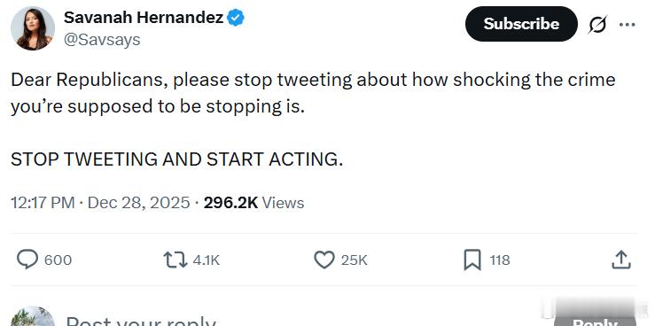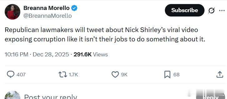 “共和党议员只会在推特上转发尼克·施利揭露腐败的热门视频,好像采取行动根本不是他们的事。 ”“亲爱的共和党人,请别再在X上发帖说那些你们本该制止的犯罪有多令人震惊了。停止发推,开始行动。”