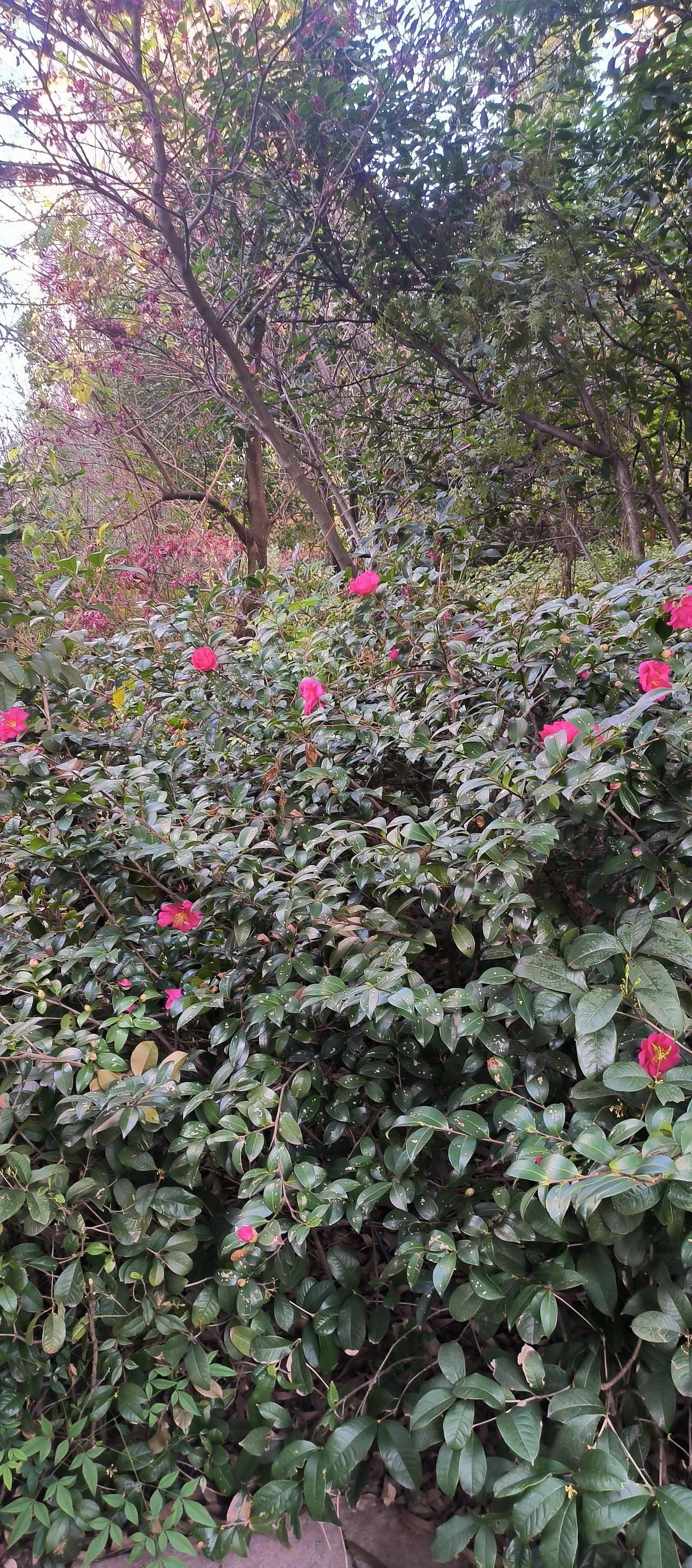 迎风斗霜更争艳 去到小区绿化地散步中,蓦然发现一片艳红,一株山茶花绽开满树花朵,在寒霜之中更显艳丽。 山茶原产云贵高原,品种众多,颜色多样,花型丰富,十分耐看,可与牡丹相媲美,尤其是在万木萧条、百花凋零的冬季,山茶以独特的风姿展现人们眼前,别具韵味。