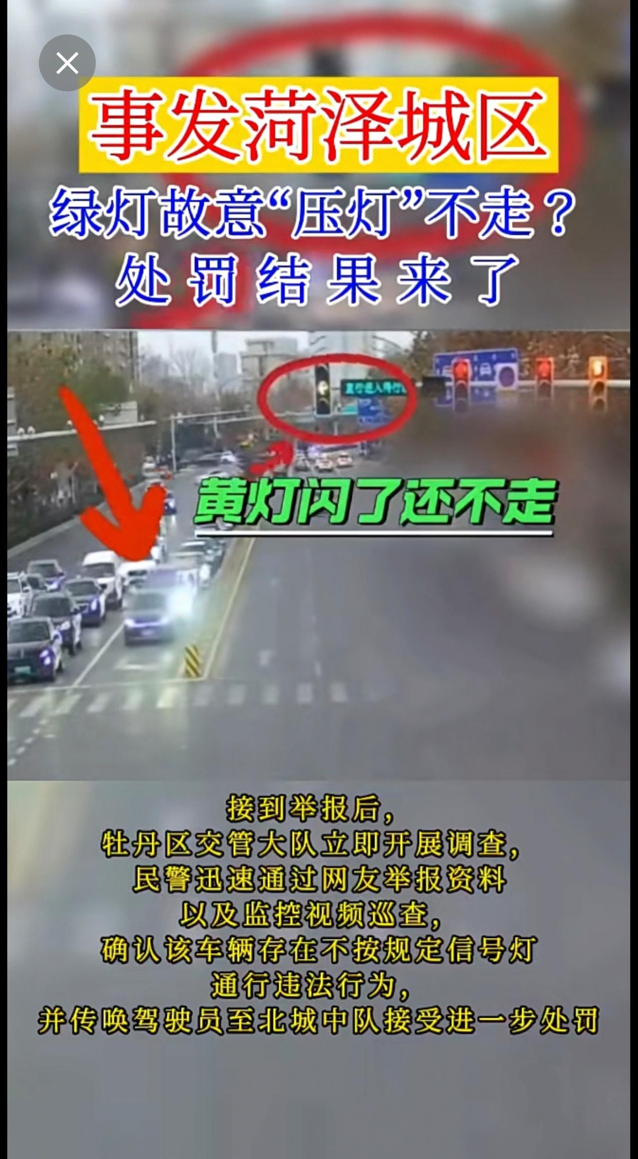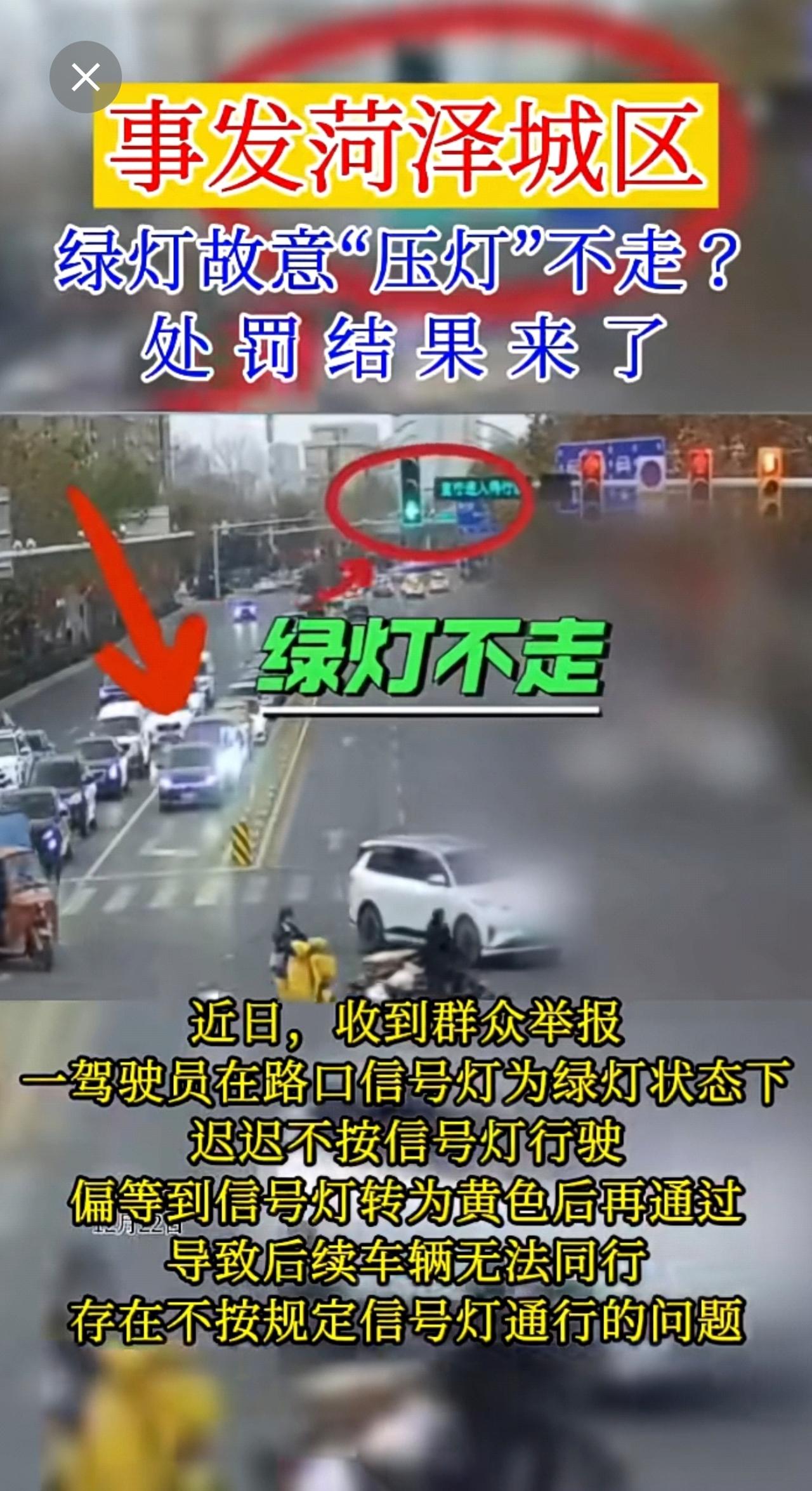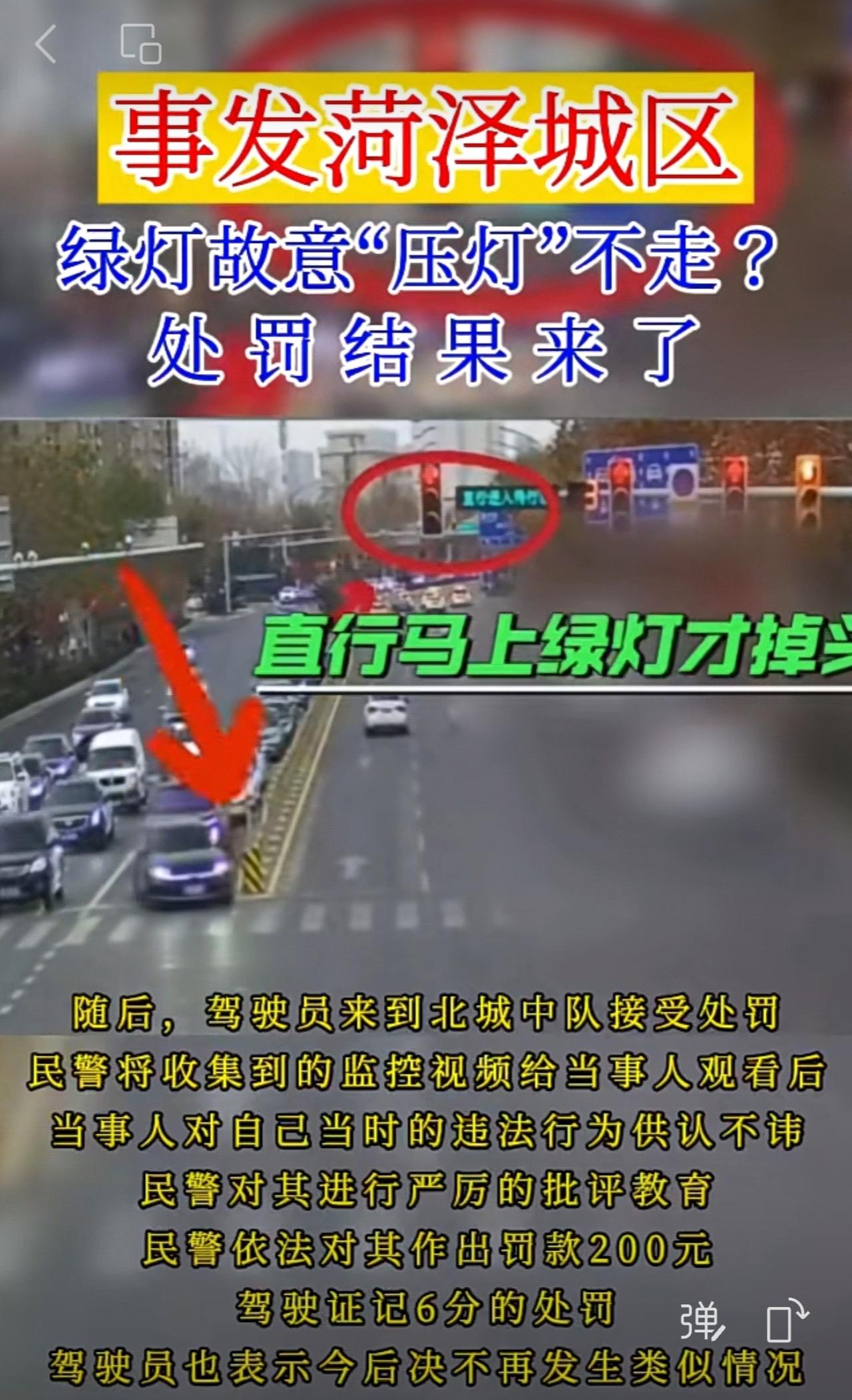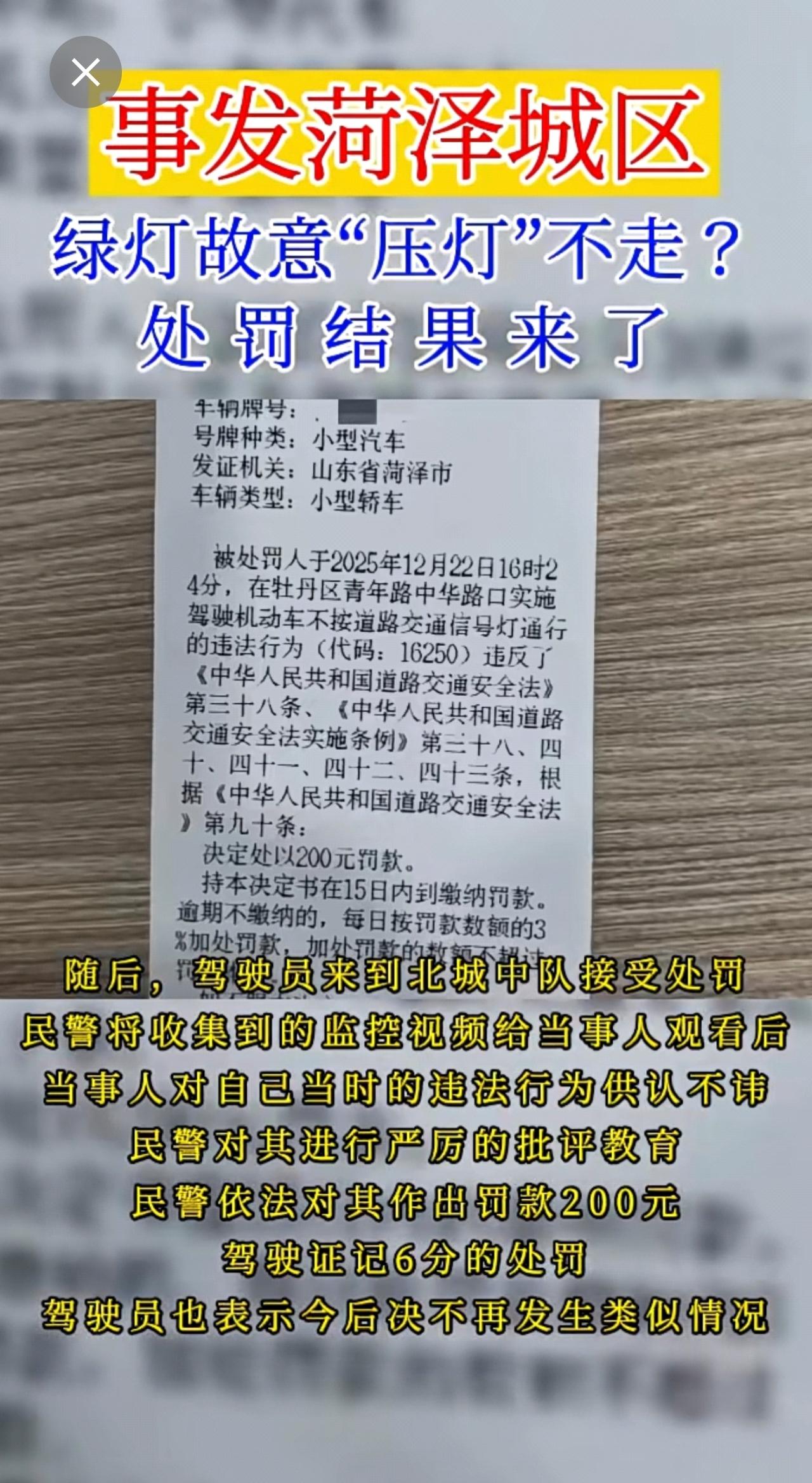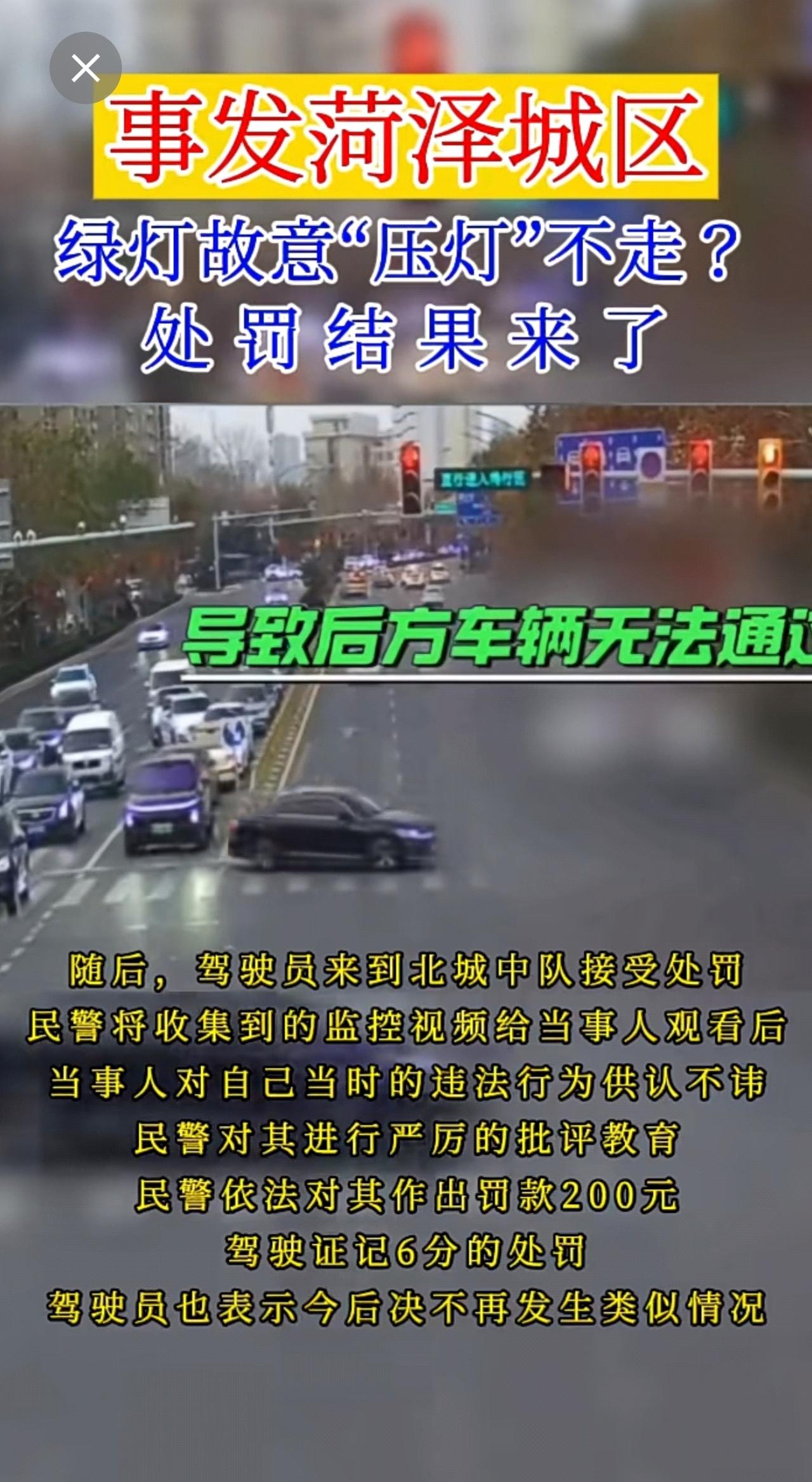 事发菏泽城区!司机绿灯故意“压灯”不走?处罚结果来了…