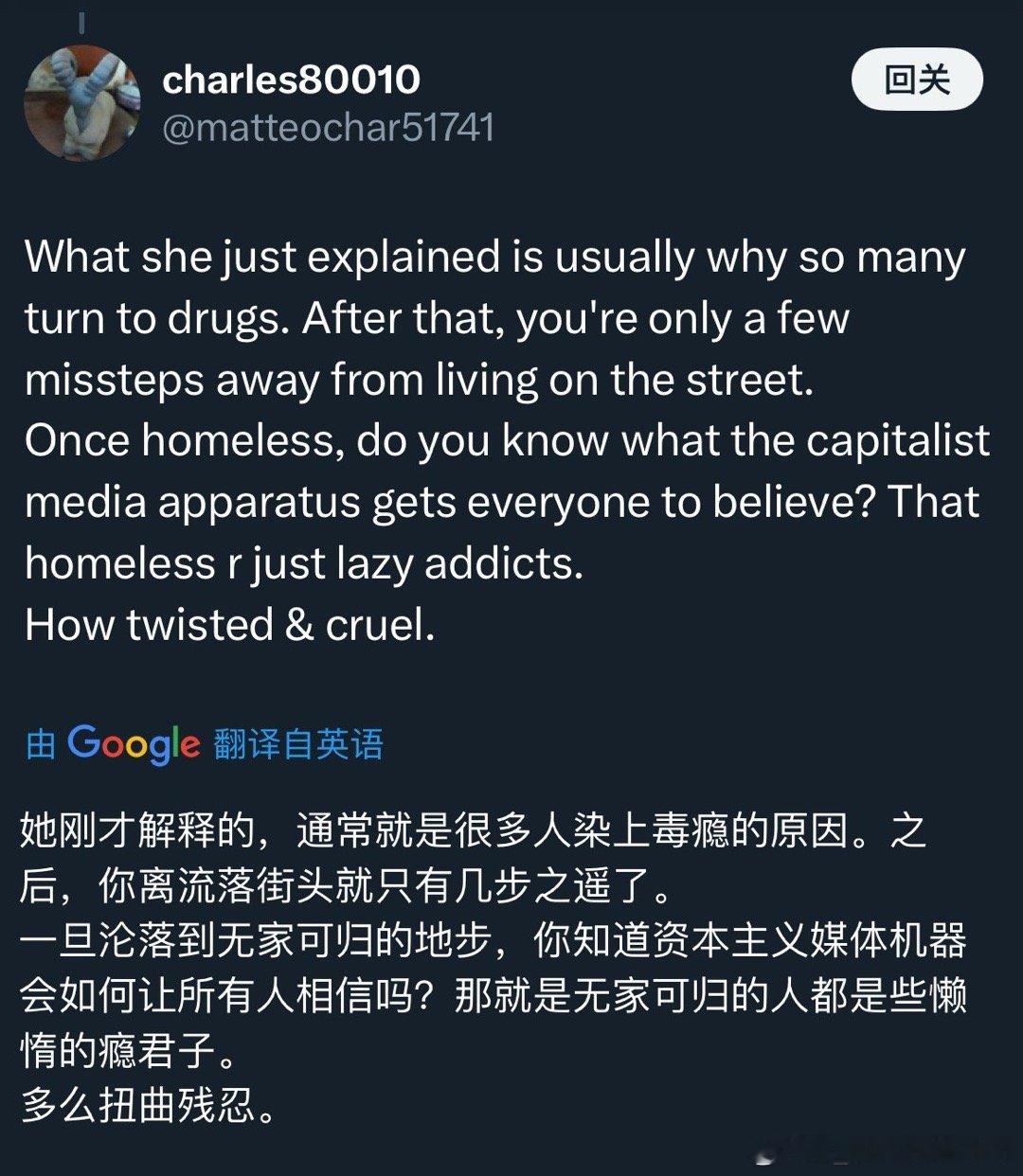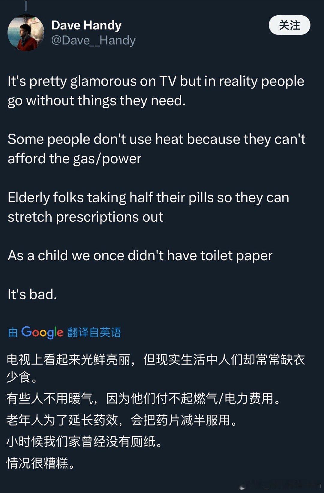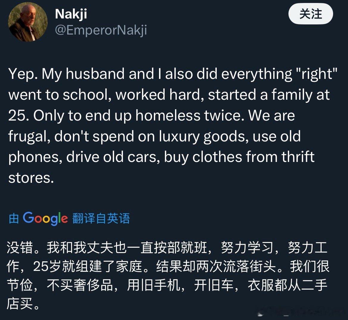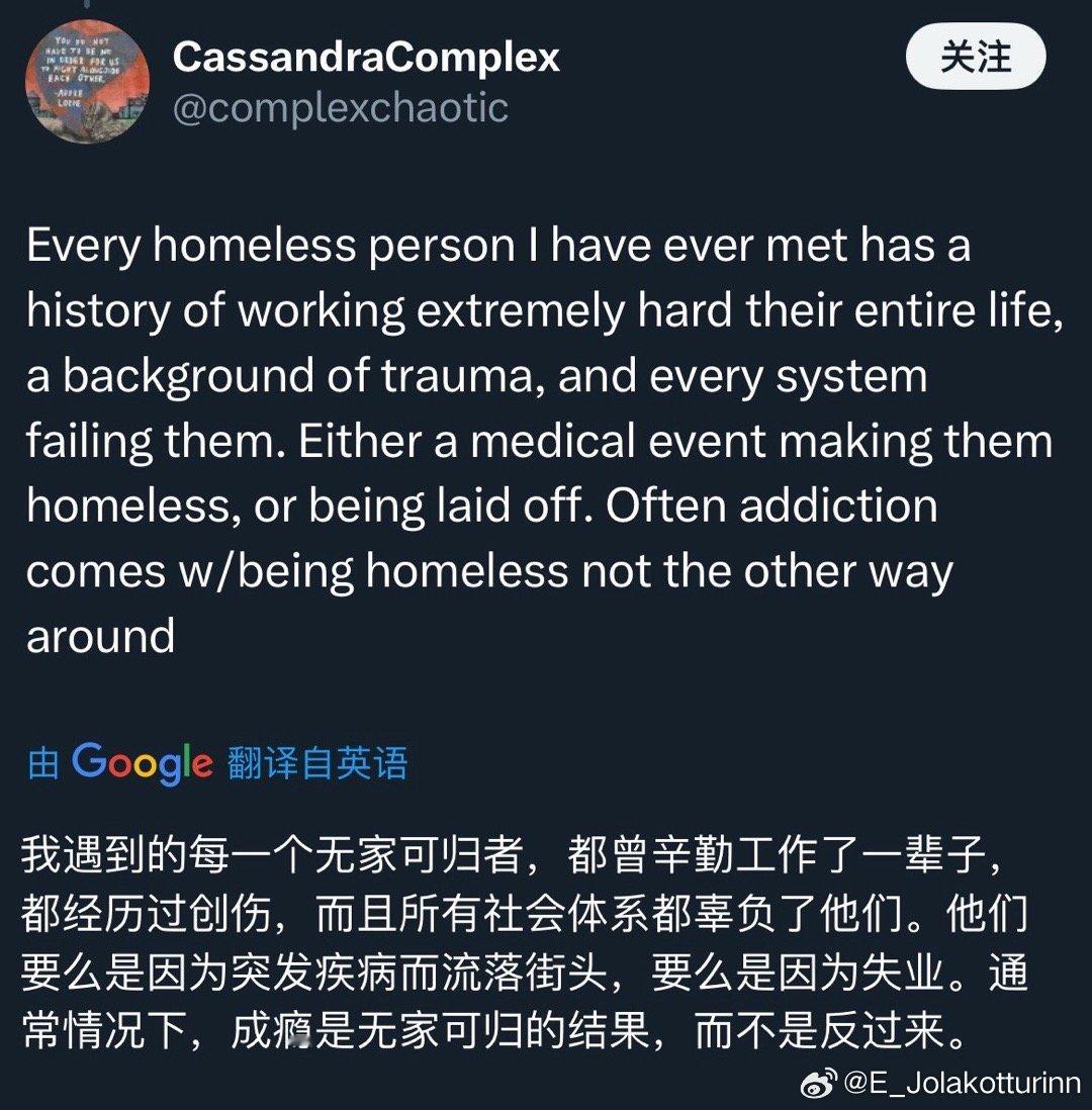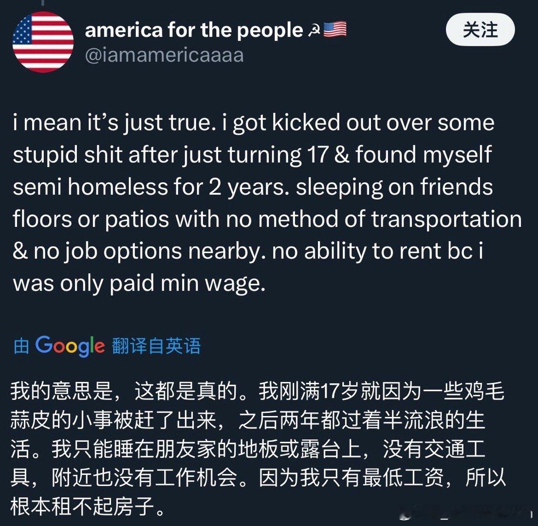 从年初的小红书“对账”到年末引发热议的“斩杀线”现象,我就这两个话题写了帖文与美国网友进行了深入交流。相关内容点击量动辄百万,留言上万条,美国普通人憋在心底的苦闷之深可见一斑。下面大多是美国网民给我的留言,读后令人心生感慨。在这些留言中,我看到许多普通美国人不仅承受着贫苦生活的重压,还不得不面对外界的指责与偏见,被贴上“你不努力才穷”的标签。然而,在阶层日益固化的美国,单靠努力往往难以扭转命运。绝大多数美国网友在留言中写道:“谢谢你看到我们的苦难,我们真的不是懒惰,我们也在拼命努力,却依然无法轻松地活着。”“斩杀线”所言不虚,但它只是掀开了美国普通民众所承受的巨大生活压力的一角。谁不想通过努力工作过上更好的生活呢?难道有人天生就愿意沉溺药物、流浪街头,做所谓的“不羁灵魂”吗?如果真有机会安居乐业,出于趋利避害的本性,人们怎么会主动选择相反的道路?我一直认为,一个国家发达与文明程度的关键标尺,就在于最普通的老百姓能否活得有尊严。中国的扶贫事业,无疑是人类历史上值得浓墨重彩书写的伟大成就。它也为人类文明的未来走向,提供了一份重要的参照。在这方面美国则是真真切切的反面教材。 美国网友眼中的真实斩杀线