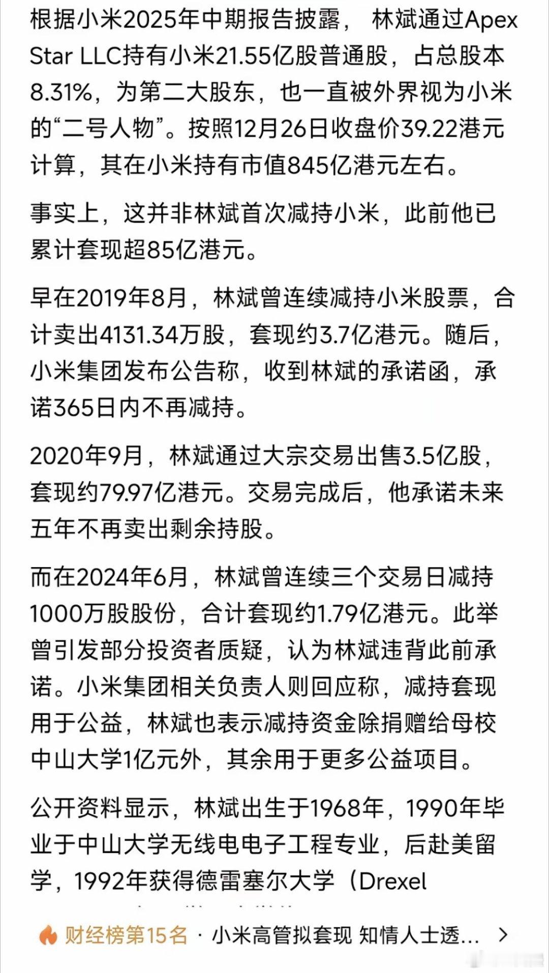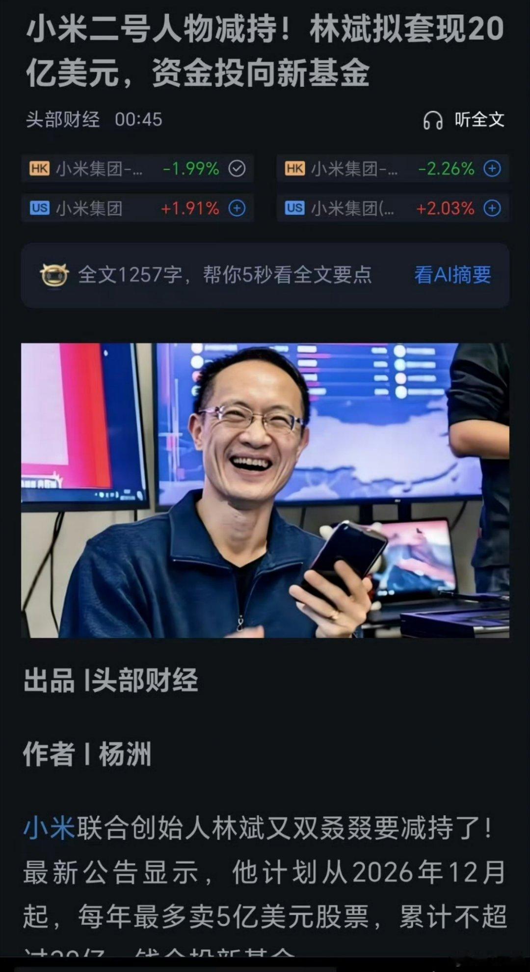 小米联合创始人拟减持不超20亿美元小米集团发布公告,联合创始人林斌计划四年减持,累计套现不超20亿美元(约140亿人民币)再加上之前三次已经套走的85亿港元,这数额真的够让人咂舌。查了一下林斌的信息,1968年出生,微软、谷歌都待过,妥妥的IT老炮,2010年跟着雷军一起敲锣打鼓创办小米,现在还是副董事长兼执行董事。按理说,创始人减持在科技圈不算新鲜事,毕竟早期跟着公司熬过来的元老,兑现点财富很正常,要么改善生活,要么投点新赛道,都能理解。但这减持的时机和规模,难免让市场和股民嘀咕,你对此怎么看?科技先锋官