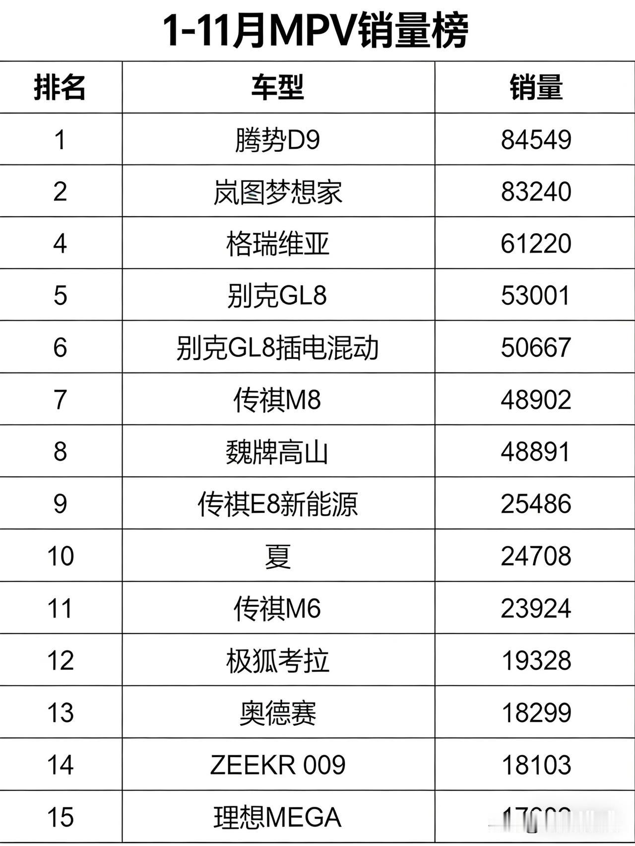 为什么说比亚迪的车卖的越好,丰田就越瞧不起它?因为在中国卖混动,丰田就是最大的冤大头。 谁能想到?2025年MPV市场看着没咋动,实则暗潮汹涌! 乘联会最新数据一出,95.3万辆的总销量只比去年多了0.1%,表面稳如老狗,内里却已经天翻地覆。你能想到最大的变化竟是—— 新能源MPV居然追平燃油MPV销量了!以前燃油车独霸的局面彻底被打破了。 更刺激的是头部之争,简直卷到飞起!冠军腾势D9卖了84549辆,亚军赛那紧随其后卖了82856辆,俩车就差1693辆,差一点就翻盘,这竞争拉满了! 前六名里还藏着惊喜——3款都是高端新能源MPV,岚图梦想家以73240辆稳坐第三,和前两名组成第一阵营。 那其他传统合资车的日子不好过了? 别急,合资燃油MPV也没完全认输。格瑞维亚、别克GL8还有它的插混版都挤在前六,分别是61220辆、53001辆、50667辆。前十里仍有不少老牌选手的身影,特别是别克GL8在我国的MPV市场一直有着重要的影响,如今在国产新能源的冲击下还能保持不错的销量成绩,不得不说韧性是真够强。 自主阵营里也有神仙打架,传祺M8和魏牌高山居然只差11辆,一个48902辆一个48891辆,这差距简直可以忽略不计,谁能想到燃油车和新能源还能卷得这么近? 新势力也没缺席这场混战!极氪009、理想MEGA、传祺E8三款车都冲进了前十五,连专注亲子场景的极狐考拉都卖了19328辆。合资燃油里奥德赛排13名,销量18299辆,依然是日系MPV里的中坚力量。 有人欢喜有人愁,曾经的热门合资车艾力绅、嘉华销量大幅下滑,艾力绅7408排名二十六位,嘉华销量仅仅1219辆,排名第四十六位,反观奔驰V级、威霆还牢牢霸占着豪华MPV市场,销量分别为9049辆与8608辆,排名也紧挨着,分别是第二十二与第二十三位。 最后说个大趋势:现在买MPV,大家更认新能源和高端款,插混、纯电车型凭着省钱又好开的优势,把燃油车的空间越挤越小。未来拼的不是参数,是技术和场景体验!文 张国成