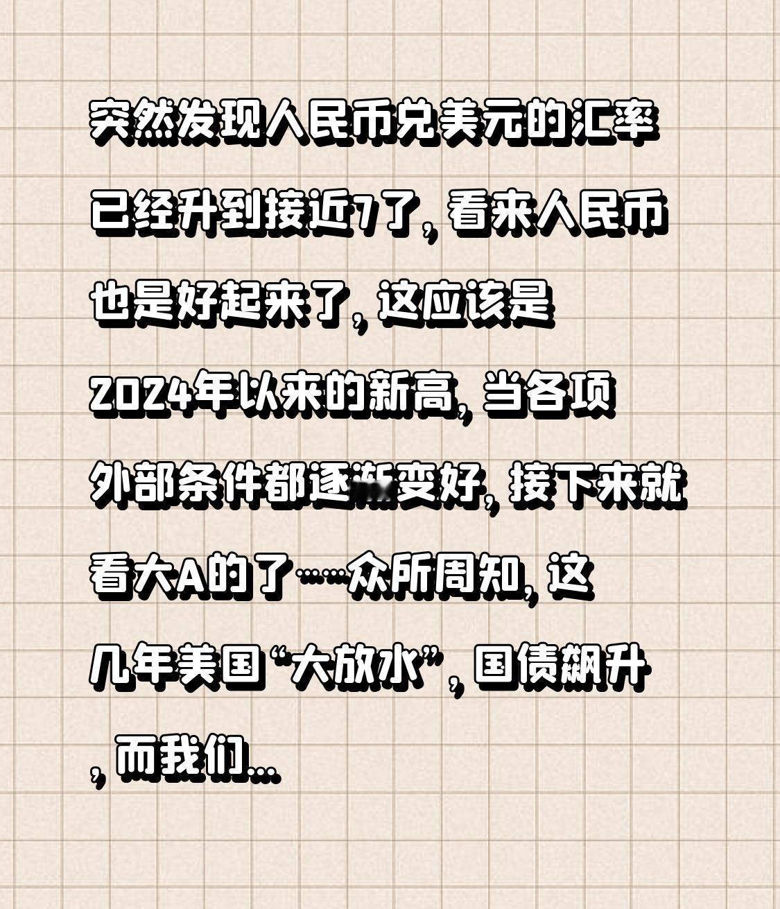 突然发现人民币好起来了!近期,人民币兑美元的汇率已经升到接近7了,创下了2024年以来人民币兑美元汇率的新高,那么问题来了,当各项外部条件都逐渐变好,大A该何去何从呢? 众所周知,这几年美国“大放水”,国债飙升,而我们外贸顺差连续破纪录,按说人民币早该更强势。虽然前阵子汇率有点压抑,但现在市场终于反应过来——弱美元、强人民币的大趋势藏不住了。 中长期看,人民币稳步升值已是共识,甚至有人看到6、看到5。这不是短期炒作,而是中国实体经济与金融实力撑起来的底气。咱们不是当年的日本,汇率节奏掌握在自己手里,未来大概率是温和而坚定地向上走。 对普通人来说,未来几年的大策略应该是:拥抱人民币资产,拿稳人民币,看好中国,这或许就是我们这代人最实在的机遇!