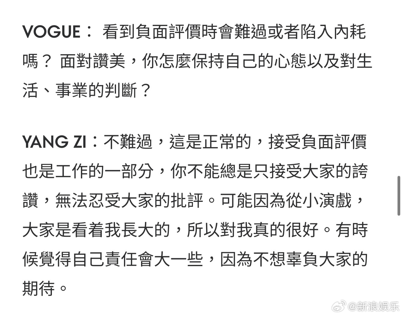 -不难过,这是正常的,接受负面评价也是工作的一部分,你不能总是只接受大家的夸赞,无法忍受大家的批评。可能因为从小演戏,大家都是看着我长大的,所以对我真的很好。有时候觉得自己责任会大一些,因为不想辜负大家的期待。杨紫 接受负面评价是工作的一部分