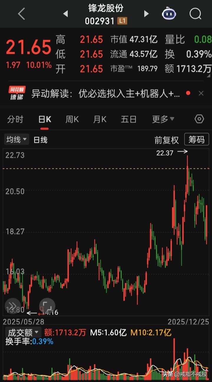 【年中+年未,“机器人”的舞台】 年中,“智元机器人”似入主“上线新材”,创造了20cm一字涨停的奇迹神话(连续九个20cm一字),停牌股价7.78元,复牌起到最高价132.10,曾最高涨幅达1597% 年未,港股“人形机器人第一股”优必选拟入主“锋龙股份”日,会是一场什么样的戏?