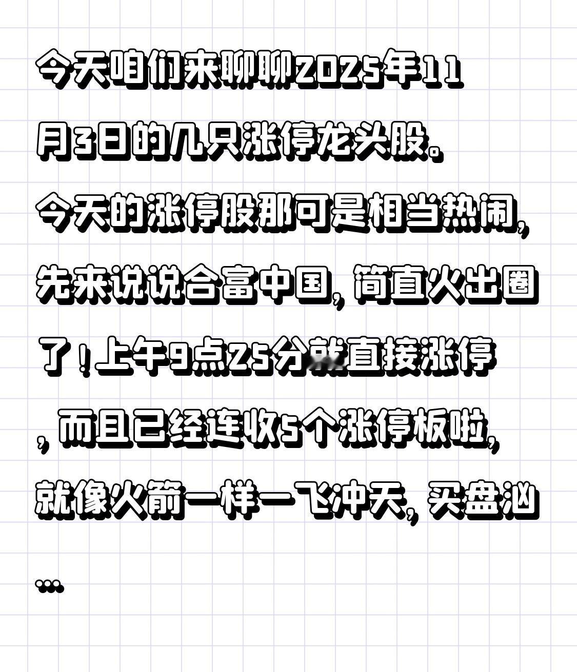 今天咱们来聊聊2025年11月3日的几只涨停龙头股。 今天的涨停股那可是相当热闹,先来说说合富中国,简直火出圈了!上午9点25分就直接涨停,而且已经连收5个涨停板啦,就像火箭一样一飞冲天,买盘汹涌得很,截止收盘还有1.33亿的封单呢。它主要从事医疗流通服务,在两岸医疗、体外诊断等领域都有业务。涨停原因主要是在两岸医疗合作不断加深的大背景下,它的体外诊断业务有很大的发展潜力,再加上AI系统在医疗领域的应用逐渐广泛,它也有所涉及,多种因素叠加,让它成为了市场的焦点。 还有粤传媒,同样是9点25分涨停,5天3板,封单有1.57亿元。它是文化传媒领域的企业,主要业务包括广告代理、印刷、发行等。这次涨停是因为三季报扭亏为盈,让市场看到了它的业绩改善,再加上全运会活动的开展,相关的文化宣传需求增加,作为广州国资旗下的企业,也有一定的资源优势,所以受到了资金的追捧。 宝色股份也很厉害,9点25分就“20cm”涨停,封单2.41亿。公司专注于特材装备制造,在光热发电、海工装备等领域有很强的技术实力。随着国家对新能源等领域的大力支持,光热发电项目不断增加,海工装备市场也持续向好,它的业务前景被市场看好,所以股价直接飙升。 再说说平潭发展,9点30分就二版涨停,封板资金3.69亿。它是海峡两岸概念的龙头股,主要从事林业、菌草等业务。在海峡两岸交流合作不断加强的背景下,它作为平潭当地的企业,有独特的地域优势,三季报业绩增长也为它加分不少,所以吸引了大量资金,股价连续涨停。 最后说说三七互娱,9点30分涨停,封单3.73亿。作为游戏行业的知名企业,在AI游戏的发展浪潮中,它积极布局,推出了一些具有创新性的AI游戏产品,受到了玩家的喜爱和市场的认可,再加上三季报增长、分红等因素,让它成为了AI应用端的热门股,成功涨停。 总结一下,这些涨停股都有各自的优势和涨停原因。如果想追这些股,得看看明天开盘能不能继续封住涨停,如果封不住,那可得小心了。大家觉得这些涨停股这波涨停能持续多久呢?或者你还想了解哪只涨停股,欢迎在评论留言长线10倍股 高成长股 高股息核心龙头 A股十倍股