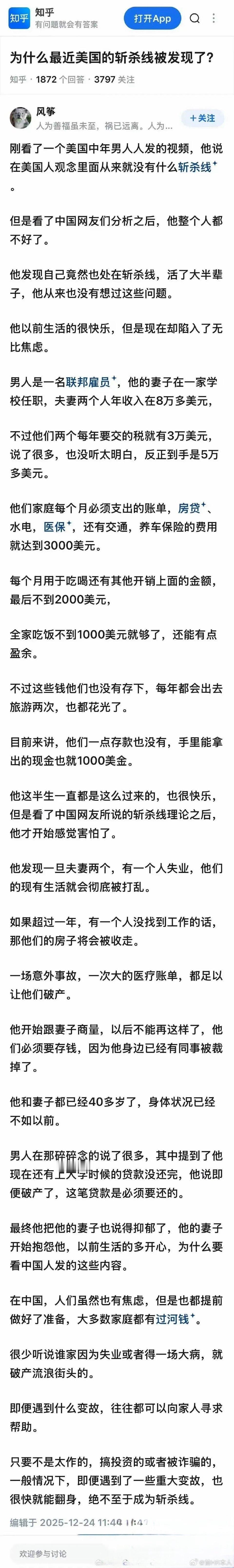 为什么最近美国的斩杀线被发现了?一个美国中年男人人发的视频,他说在美国人观念里面从来就没有什么斩杀线,但是看了中国网友们分析之后,他整个人都不好了。他发现自己竟然也处在斩杀线,活了大半辈子,他从来也没有想过这些问题。他以前生活的很快乐,但是现在却陷入了无比焦虑。所以美国人的信息茧房才是可怕,天天被灌输超级大国子民,然后一不小心进入斩杀线就BBQ了