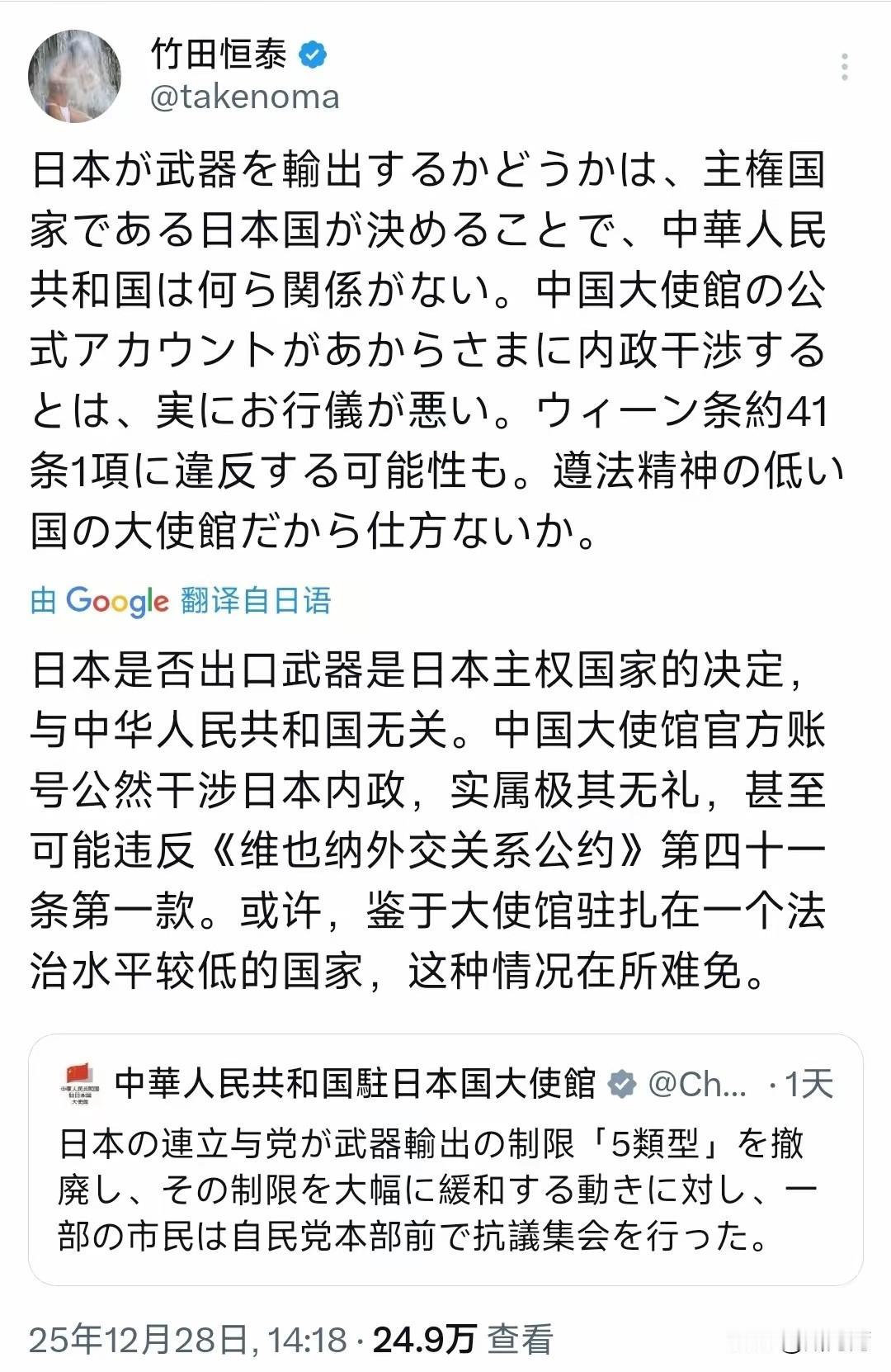 又一个日本极端右翼分子出现了! 这就是日本明治天皇的玄孙,右翼保守主义代表人物竹田恒泰28日对中国驻日本大使馆叫嚣的。真是让人愤怒,日本真是没得救了!