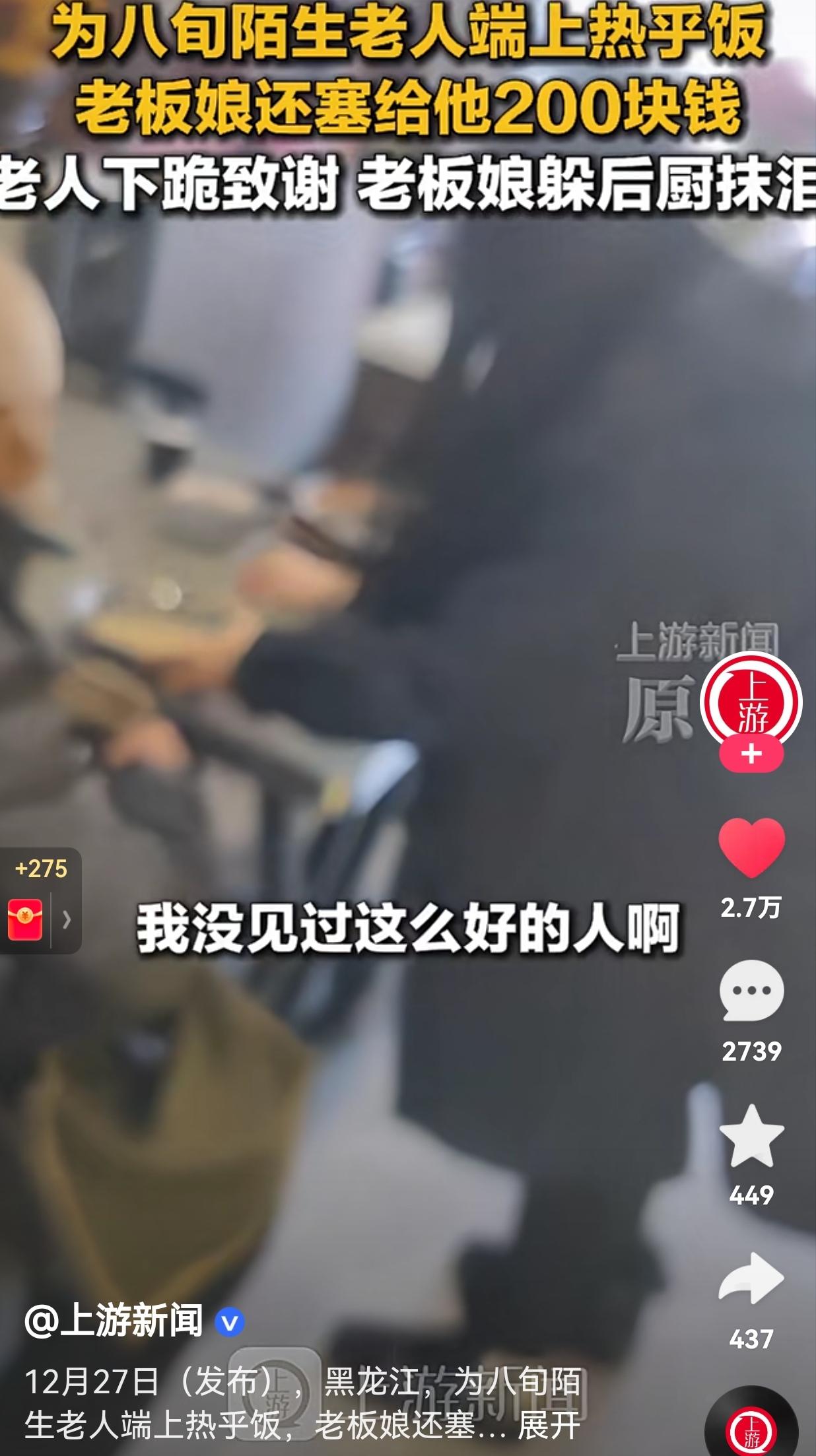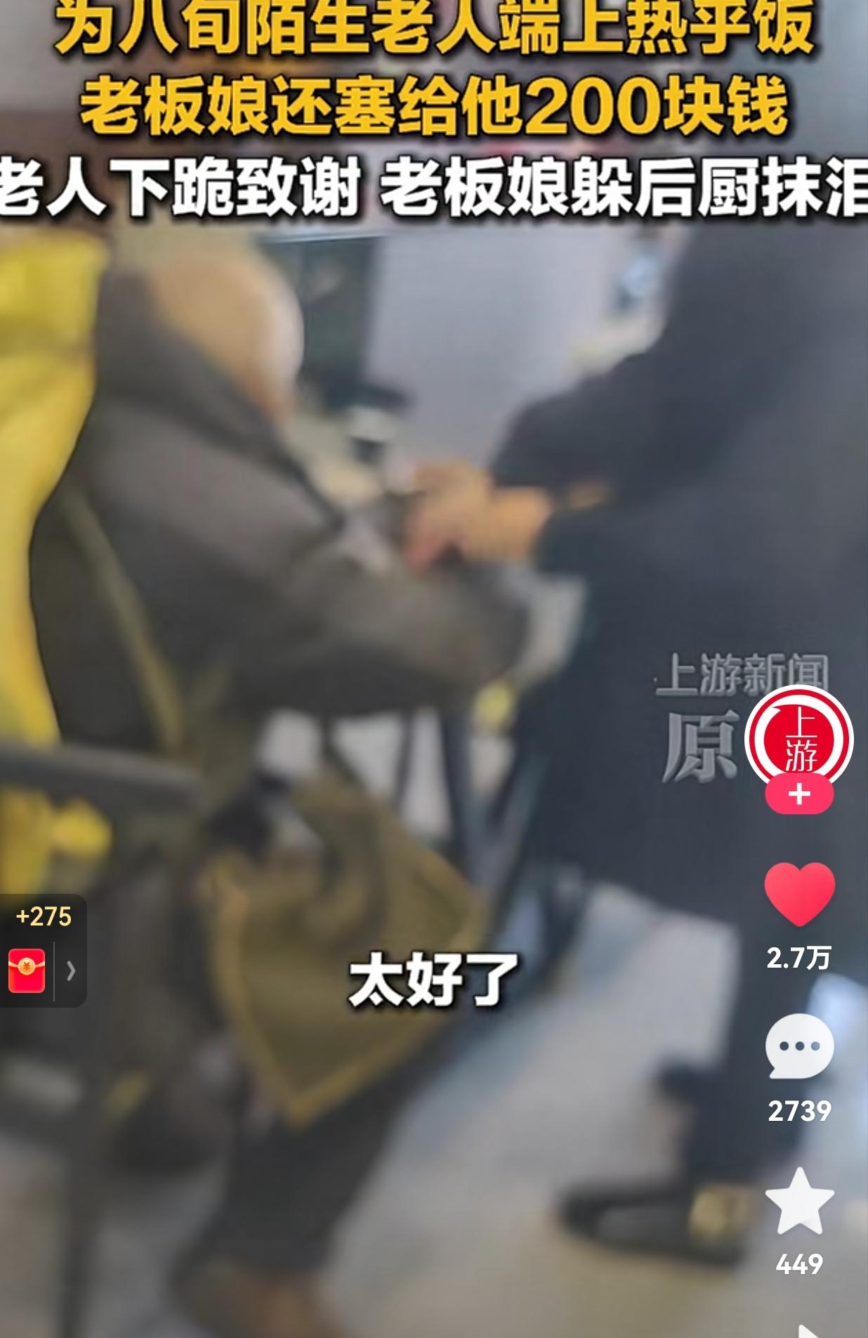 看哭了!黑龙江一老板娘为八旬陌生老人端上热乎乎的饭菜,还塞给他200块钱,老人竟然下跪致谢,老板娘躲后厨抹眼泪。网友:冬天很冷,人心却很暖!为唐大姐点赞!希望这种善意能一传十十传百,让更多人感受到温暖! 黑龙江的冬天,那风刮得跟刀子似的,可再冷的天,也扛不住人心窝里的那股热乎劲儿。 前两天,有个82岁的大爷,因为家里孩子生病,大冷天的在街上奔波。饿了累了,就踉跄着走进了一家小餐馆。 大爷打进门起就客客气气的,生怕给人家添麻烦,那佝偻的背影、落寞的模样,一下子就戳中了老板娘唐大姐的心。 一问才知道大爷的难处,唐大姐二话没说,先给大爷端上一碗热粥、一盘热乎饭菜。转身又跑到附近银行取了200块钱,直接塞到大爷手里,还小声叮嘱:“大爷,你揣兜里头,别弄丢了。” 这突如其来的暖,让一辈子没少吃苦的大爷瞬间红了眼眶,哽咽着念叨:“我这辈子,从没见过这么好的人啊!” 说着说着,“扑通”一声就给唐大姐跪下了,嘴里还不停说着“太好了,太好了”。 唐大姐吓得赶紧伸手去扶,嘴里连声喊:“大爷,使不得!你这是干啥呀!”“快起来快起来!你都80多岁的人了,我哪能受你这一跪啊!”她扶着大爷,反复念叨着“不能这样,真的不能这样”。 事后唐大姐说,当时看着大爷执拗下跪的样子,她心里又酸又暖,鼻子一酸,转身躲进后厨,偷偷抹了好一阵子眼泪。 心软的她还跟大爷承诺:“以后你要是饿了,天天上我这儿来吃饭!” 唐大姐说,她也没啥大钱,就是觉得“一个小小的举动,说不定就能暖透一个人的心”。 其实啊,她的善举从来都不是一时兴起,视频中,可以看出餐馆墙上早就贴着告示,专门给环卫工人、拾荒的人提供热饭热水,善意早就融进了她每天的柴米油盐里。 200块钱真心不多,一碗热饭也不值啥钱,可是,也不是所有的人都愿意这样做。而且这是在大爷走投无路的时候,这就是救命的希望。在人情味越来越淡的今天,这就是最实打实的善良。 唐大姐没做什么惊天动地的大事,可就是这一碗饭、两百块,把“雪中送炭”这四个字,诠释得明明白白。 大爷那一跪,不是卑微,是打心眼儿里的感激,是对这份善意最沉甸甸的回应。 总有人说,这世上的美好都是攒出来的。 可不是嘛!一碗热饭暖了胃,两百块解了难,一次搀扶暖了心。发生在黑龙江这家小餐馆的事儿,就像寒冬里的一束光,照亮了街头巷尾,也照进了咱们每个人的心里。 愿这份善意能被更多人看见,能被更多人传递。也愿每个遇到难处的人,都能碰上一个“唐大姐”,让冬天里的温暖,从来都不会缺席。 针对此事,你有什么看法呢?欢迎大家评论区讨论留言。