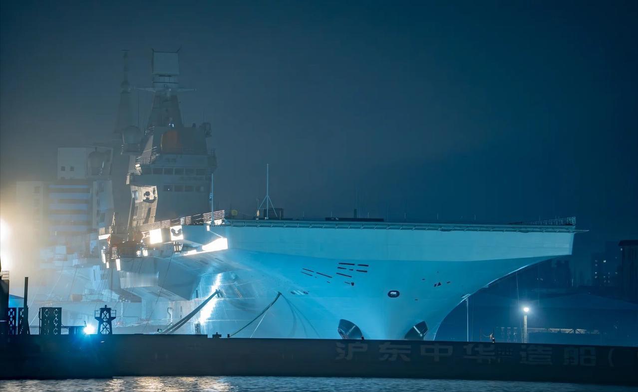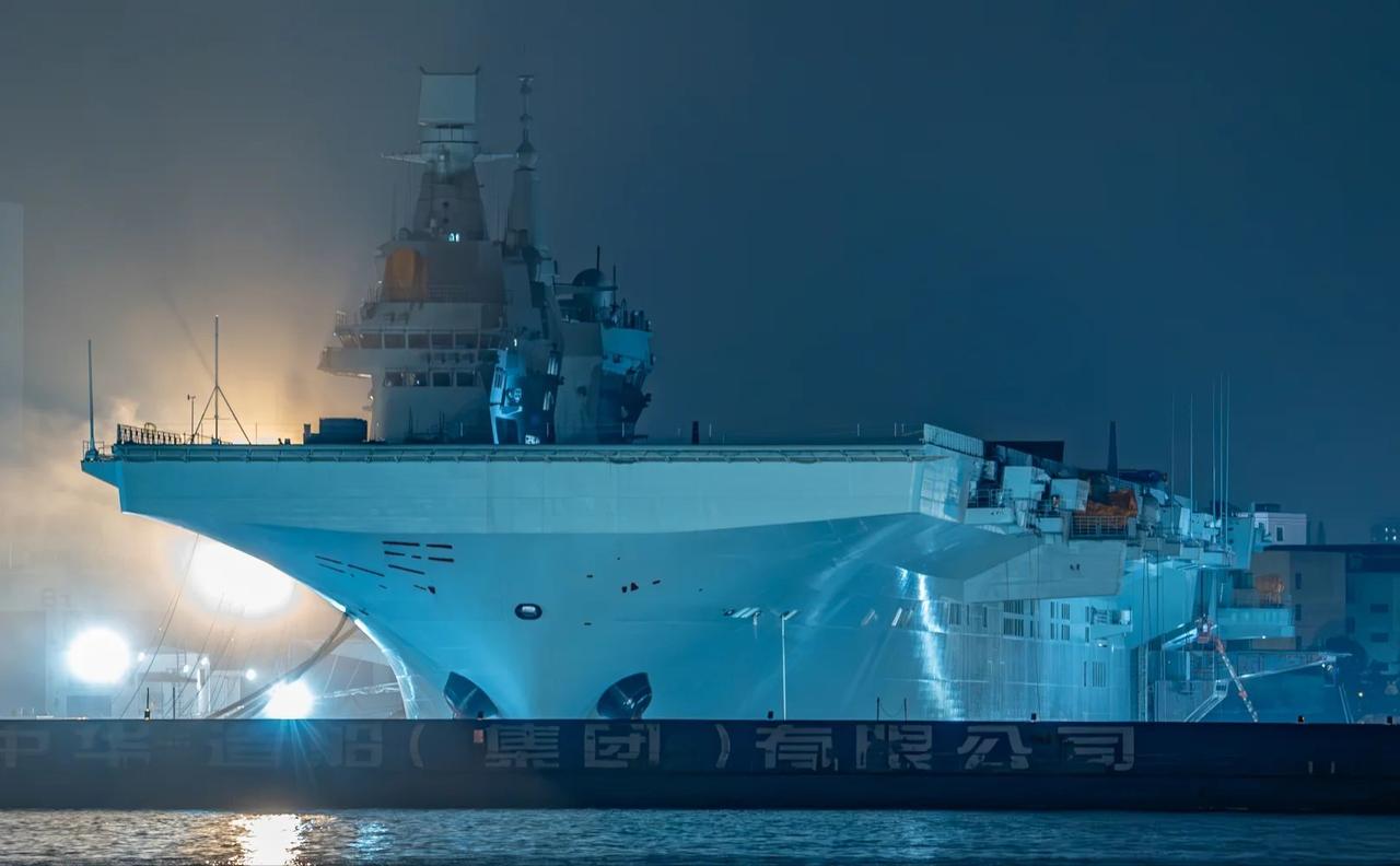 中华造船上码头上,四川舰在夜色中更显巍峨壮观,科幻感觉十足。075正面安装LED显示屏的超平大泵头,在076上已经窄了许多,但是宽的特别适合挂上标语。这个地方为什么不能做的窄一些,尖一些,除去美观之外,多少可以减小一些航行时的空气阻力。