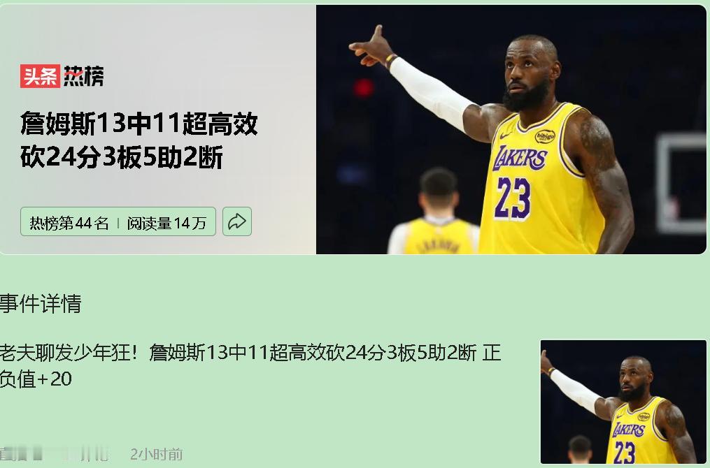 41岁?退役?看看这个老汉怎么用84.6%的命中率打脸所有人! 上一场输球还被开会,勒布朗·詹姆斯这场直接炸了。13投11中,劈扣、三分、抢断,28分钟砍24分,带队狂胜国王终结连败。就问你,这脸打得疼不疼? 谁说老了就不行了? 他这场命中率创了湖人生涯新高,在职业生涯里也能排第三。对比一下,同样是老将,36岁的德罗赞这场效率就明显不如他。詹姆斯这不是靠蛮力,是实打实的篮球智商。减少硬凿,多打无球空切,用最省油的方式开车,关键时刻还能站出来。 他的身体就是最严苛的简历。 赛后他说感觉步伐轻盈,这哪是41岁的身体?是几十年如一日变态自律的结果。他知道什么时候蓄力,什么时候发力,把体力用在刀刃上。 所以啊,看现在的詹姆斯真别再用“全能战士”的老标准了。把他当成一个智能武器库就对了——平时保养,关键战役亮剑。今天的爆发就是他最硬的回应:我可以收着打,只要我想,依然能统治比赛。 这场球看得爽,也更让人佩服。詹姆斯这是在和时光扳手腕,而且还没输。这份坚持和智慧,比数据更值得鼓掌。
