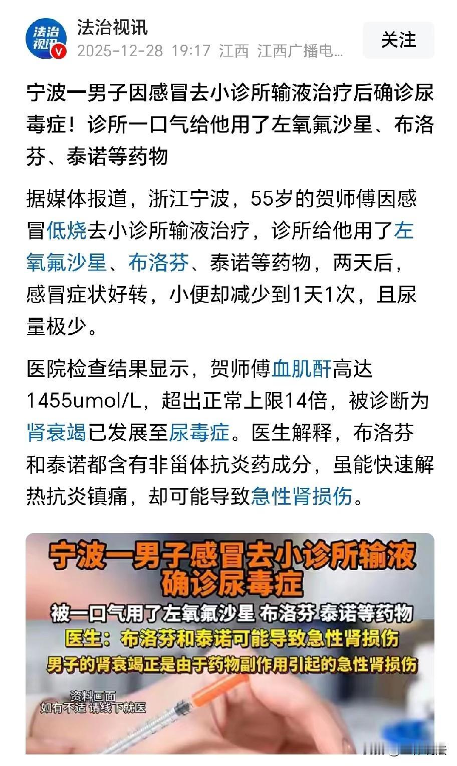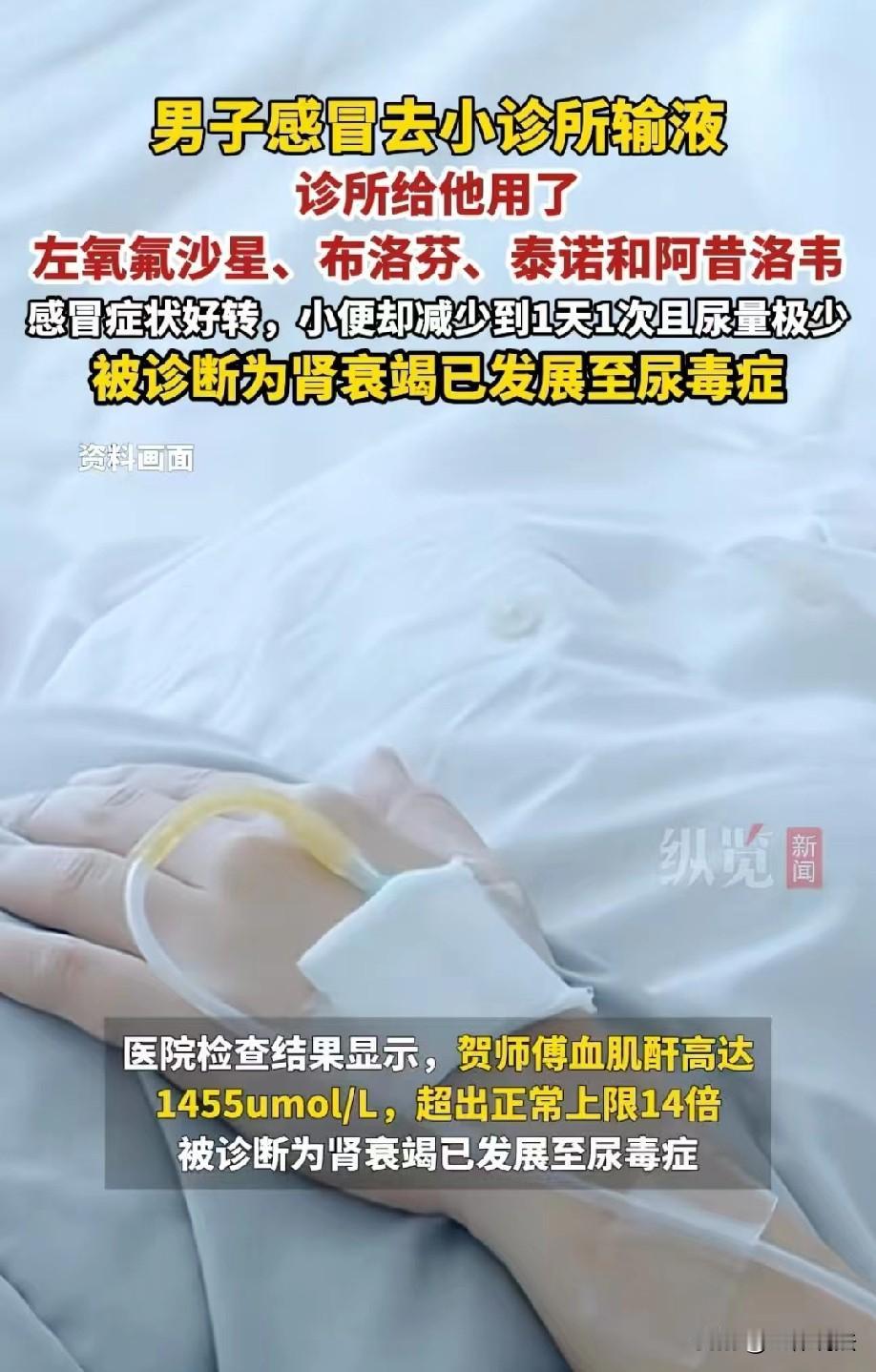 浙江宁波,55岁男子感冒发烧,为了省事,他去家门口的小诊所输液。可谁知,诊所医生剑走偏锋,一口气用了左氧氟沙星、布洛芬、泰诺等药物,感冒的症状虽然很快得到缓解,但药物副作用引发了肾衰竭,小便一天只有一次,男子不久就确诊为尿毒症。男子觉得这都是小诊所治疗不当所致,但有人质疑:男子是否本身就有肾功能不全的基础病? 男子贺师傅今年55岁,平日里身体还算硬朗,除了偶尔有点小感冒,几乎没去过医院。万万没想到,一场普通的感冒发烧,竟让他的人生彻底改写。 那天,贺师傅早上起床后觉得浑身发冷,量了个体温,37度8,不算高烧但浑身不得劲。 年纪大了,抗一抗怕拖成大病,贺师傅打算去诊所看看。 这家诊所就在贺师傅家不远处,平时头疼脑热的都在那看,方便又省事,也不用向大医院那样化验、排队、等号。 诊所的医生很利索,问了问症状,量了体温,说确定是普通感冒引发的低烧,输两天液就能好。 贺师傅一听挺放心,医生也没多废话就开了药,随后护士就给他挂上了吊瓶。 贺师傅躺在病床上,看着液体一滴滴往下滴,心里还盘算着输完液就能去上班,完全不知道事情的严重性。 他后来才知道,当时医生给他用的药里,有左氧氟沙星,还有布洛芬、泰诺这些常见的退烧药。 输完第一天,贺师傅就觉得身上轻快多了,烧也退了不少,心里直夸诊所医生医术好,见效这么快。 第二天输完液,感冒的症状基本全消了,头不晕了,也不发冷了,贺师傅更是满心欢喜,觉得这趟诊所没白来。 可高兴劲儿还没过,麻烦就找上门了。 输完液的第二天晚上,贺师傅发现自己一天下来就尿了一次,而且尿量少得可怜。 一开始他没太在意,心想可能是感冒期间喝水少,身体缺水导致的,于是刻意多喝了几杯水。 可接下来的两天,情况一点没好转,依旧是一天就尿一次,尿量还是那么少,而且腰也隐隐作痛。 这时候贺师傅心里开始发慌了,他赶紧叫上家人,第二天一早就去大医院检查。 挂号、排队、做检查,一系列流程下来,贺师傅的心揪得越来越紧。 等检查结果出来的那一刻,医生拿着化验单,表情严肃地告诉他和家人:血肌酐高达1455umol/L,正常上限才106umol/L,这都超出14倍了,已经是肾衰竭晚期,也就是尿毒症了。 贺师傅一听尿毒症,当时就懵了,他就是个小感冒,输了两天液,怎么就得了尿毒症?会不会是医生查错了呢? 医生仔细询问了贺师傅近期的用药情况,当听到贺师傅说在小诊所输了左氧氟沙星、布洛芬、泰诺这些药时,医生确定了贺师傅的病因。 原来,布洛芬和泰诺里都含有非甾体抗炎药成分,这种成分解热镇痛效果确实好,但对肾脏有一定的刺激性。 尤其是多种药物一起用,风险更高,很可能导致急性肾损伤。 为了进一步查明原因,医生建议做肾穿刺。几天后,病理结果出来了,明确显示贺师傅的肾衰竭就是药物副作用引起的急性肾损伤。 对于贺师傅的遭遇,有人觉得小诊所用药太随意,不该一下子用这么多种可能伤肾的药。 也有人质疑,贺师傅会不会本身就有肾功能不全的基础病,只是自己不知道,药物只是诱因。 如今,贺师傅只能靠透析维持生命,原本平静的生活被彻底打乱,不仅自己要承受身体上的痛苦和精神上的压力,也给家人带来了沉重的负担。 《民法典》第1218条明确规定:患者在诊疗活动中受到损害,医疗机构或者其医务人员有过错的,由医疗机构承担赔偿责任。 本案中,诊所医生对贺师傅的诊疗存在过错,诊所用药不当,同时联用左氧氟沙星、布洛芬、泰诺,违反合理用药规范,叠加肾损伤风险。 而且,诊所未尽基础检查义务,未做肾功能筛查就使用肾毒性风险药物。 肾穿刺病理已明确损害由药物副作用导致的急性肾损伤,过错与损害间因果关系成立。 诊所作为医疗机构,无论其为个体或法人,均应就医务人员的诊疗过错向贺师傅承担赔偿责任,包括医疗费、透析费、护理费、残疾赔偿金等损失。 即使贺师傅有潜在肾功能问题,诊所未做筛查即用药,仍属过错。 《民法典》第1219条规定:医务人员在诊疗活动中应当向患者说明病情和医疗措施。需要实施手术、特殊检查、特殊治疗的,医务人员应当及时向患者具体说明医疗风险、替代医疗方案等情况,并取得其明确同意;不能或者不宜向患者说明的,应当向患者的近亲属说明,并取得其明确同意。 就诊过程中,诊所医生仅告知输两天液就好,未向贺师傅说明联用左氧氟沙星、布洛芬、泰诺的肾损伤风险,也未告知替代方案,更未取得明确同意。 该告知义务是法定强制性要求,不因病情“普通”而免除。 因此,诊所未尽说明与知情同意义务,依法应承担相应赔偿责任。